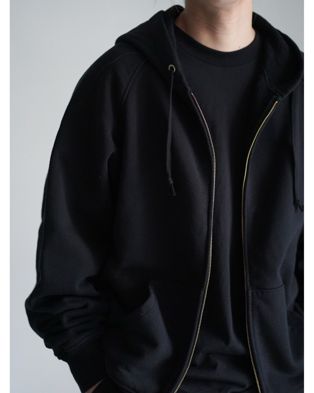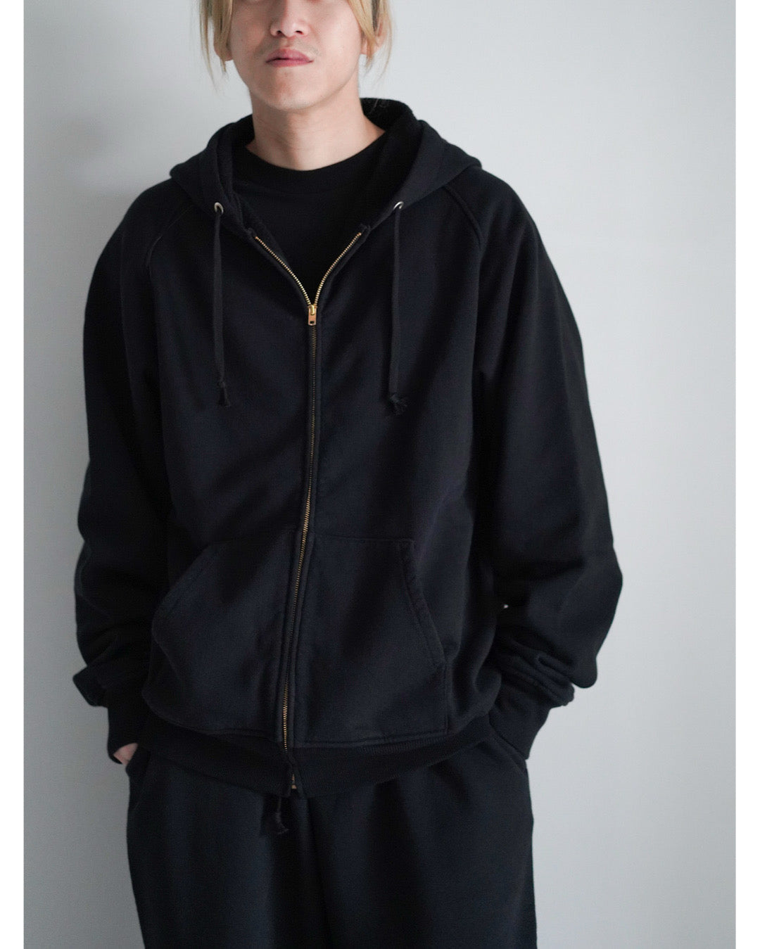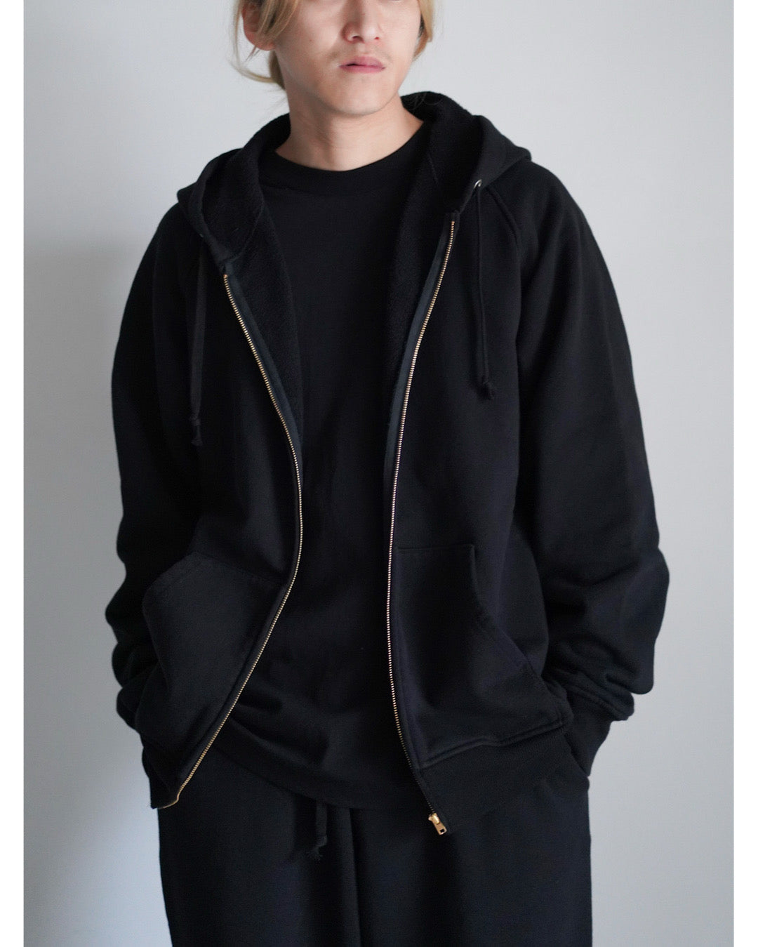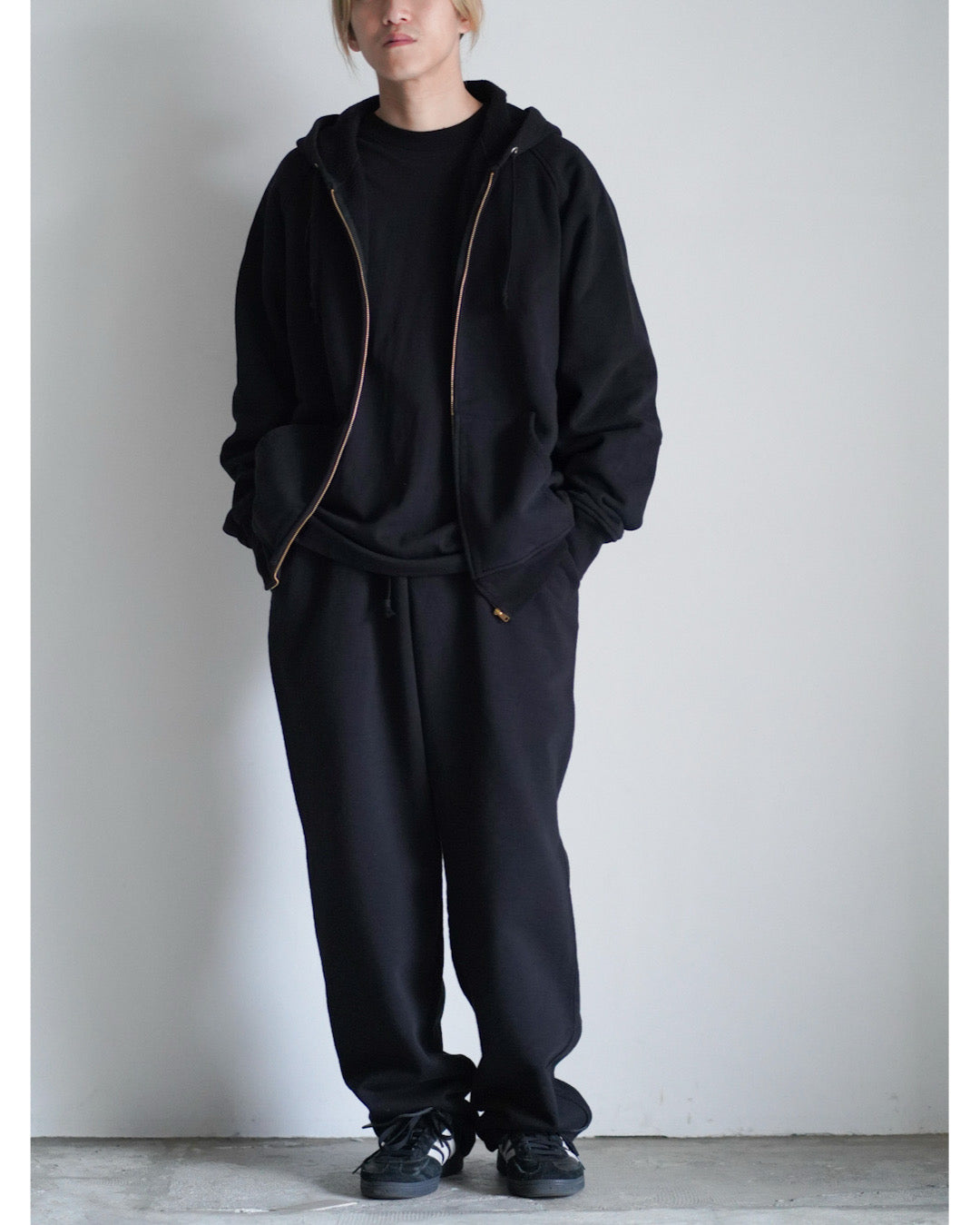 黒のスウェット上下の上からアウターを羽織るだけで、コーディネートに悩まずにシンプルで楽に雰囲気の出るスウェットに仕上がっています。