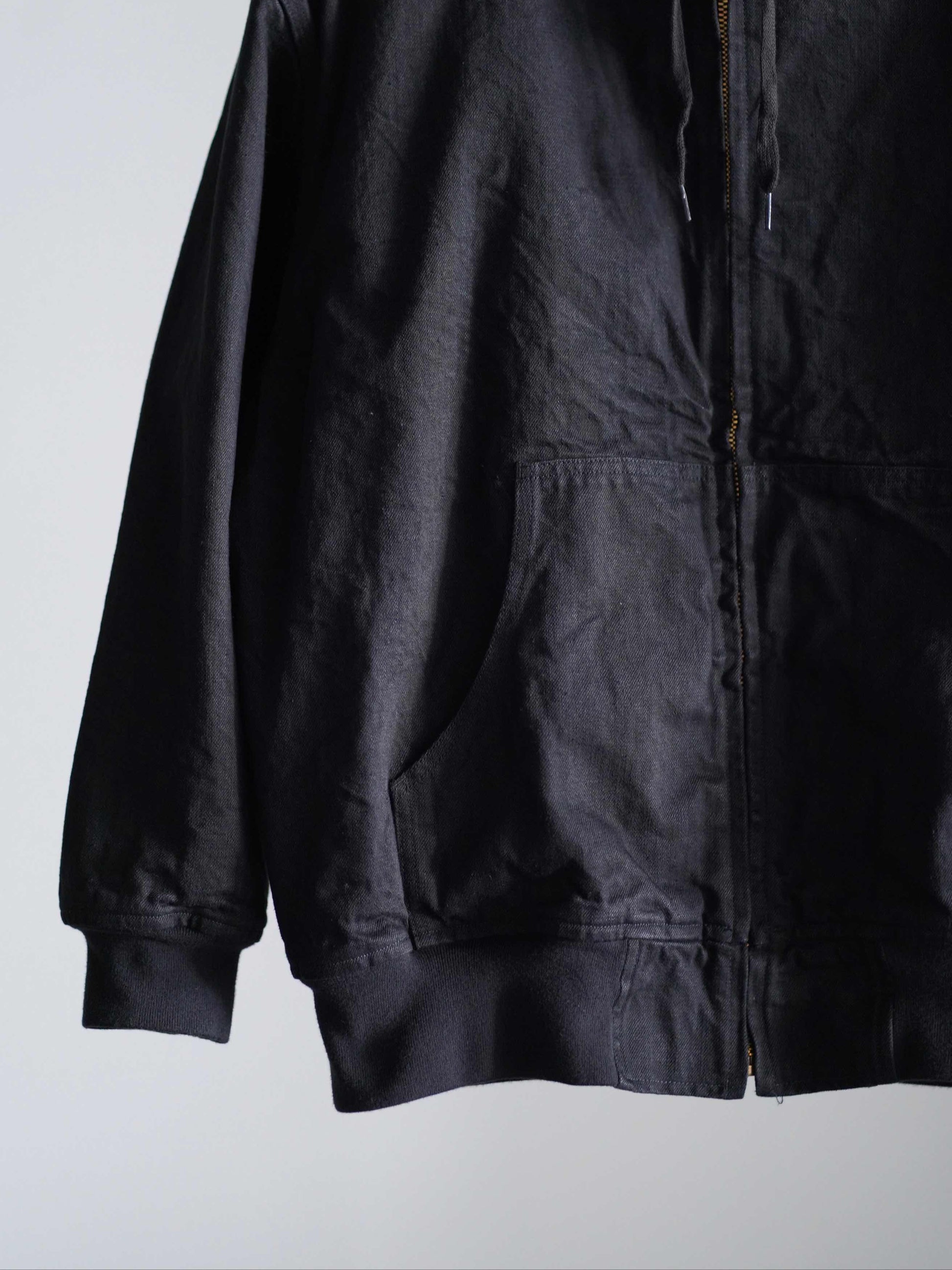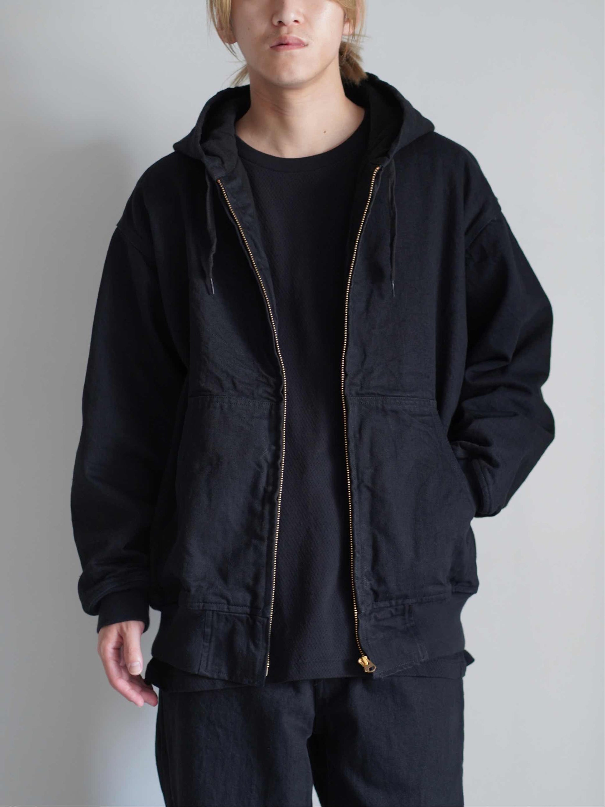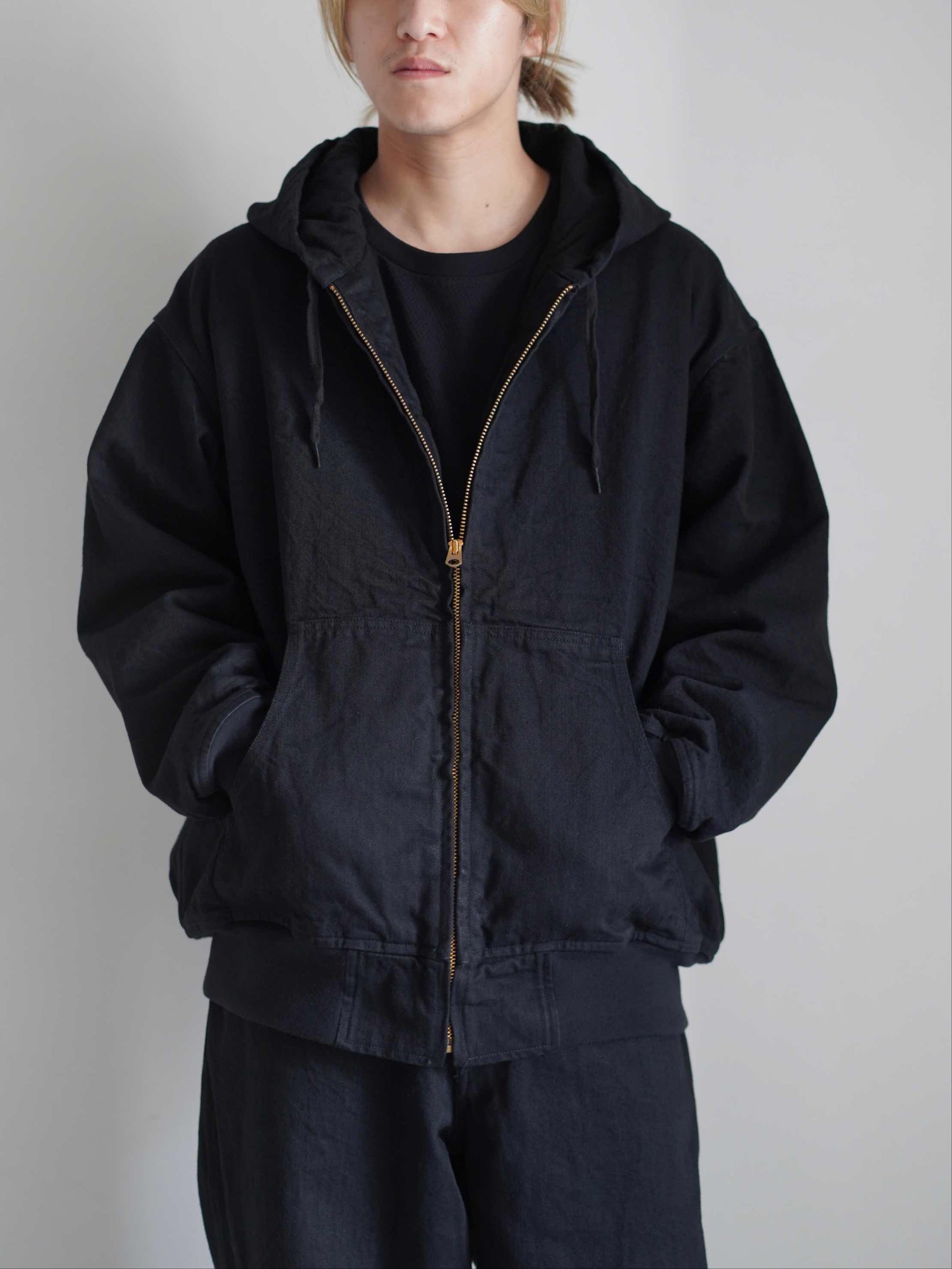 13.5ozの中白のブラックデニムで制作したジップパーカ。