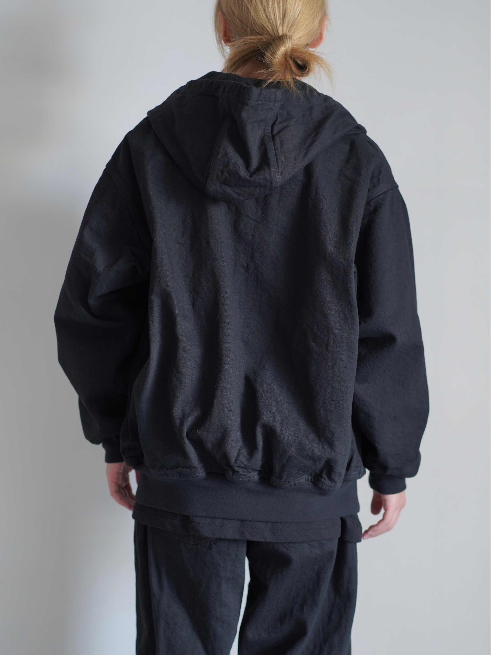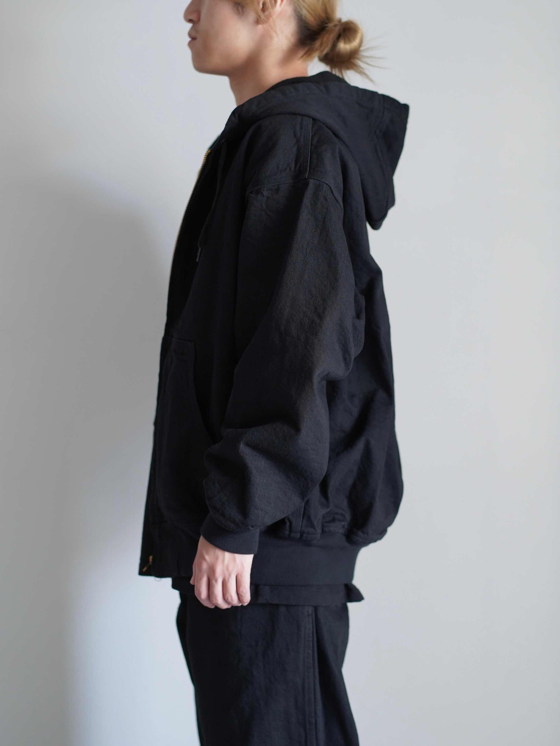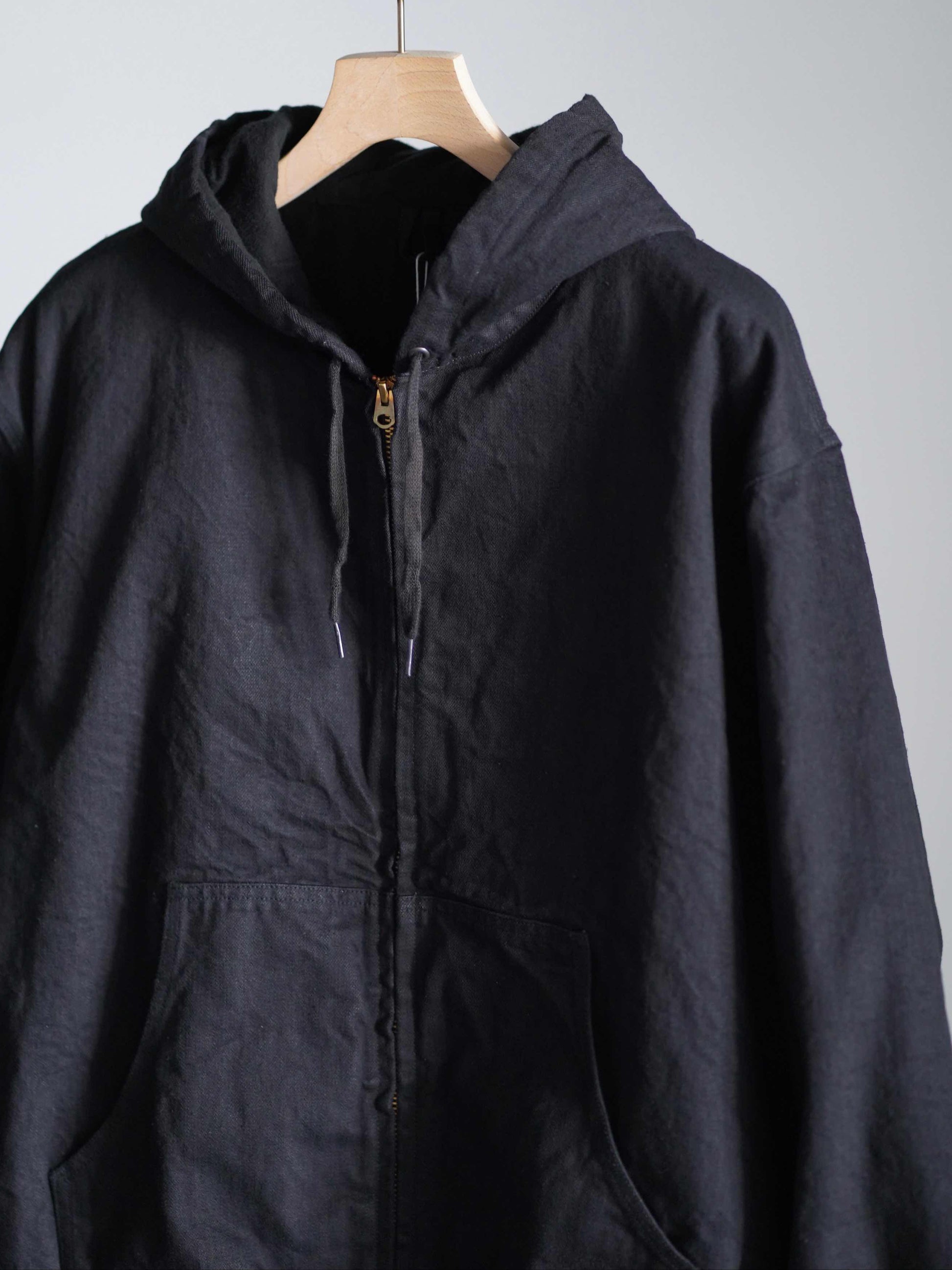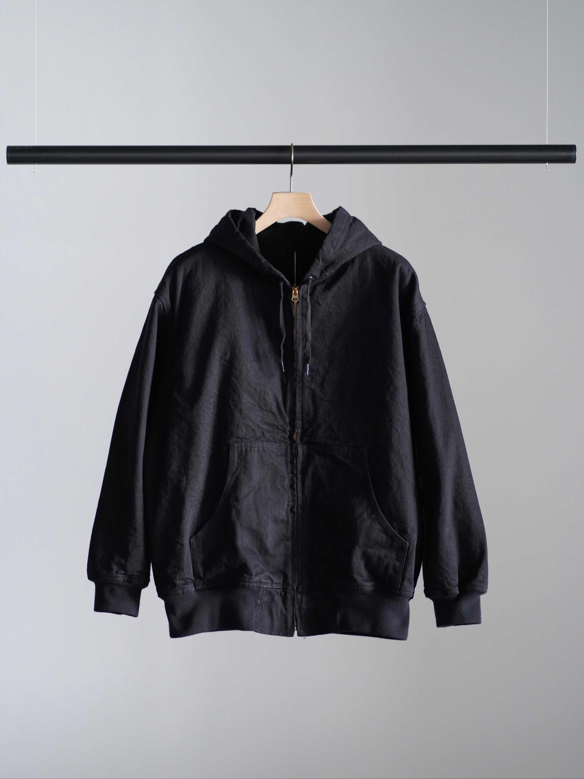 13.5ozの中白のブラックデニムで制作したジップパーカ。