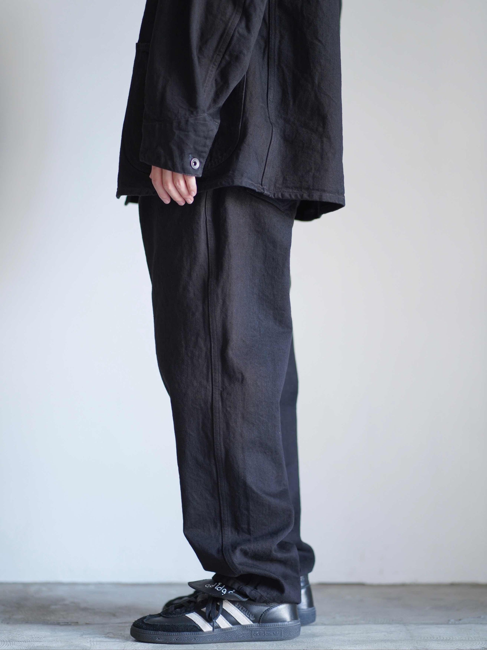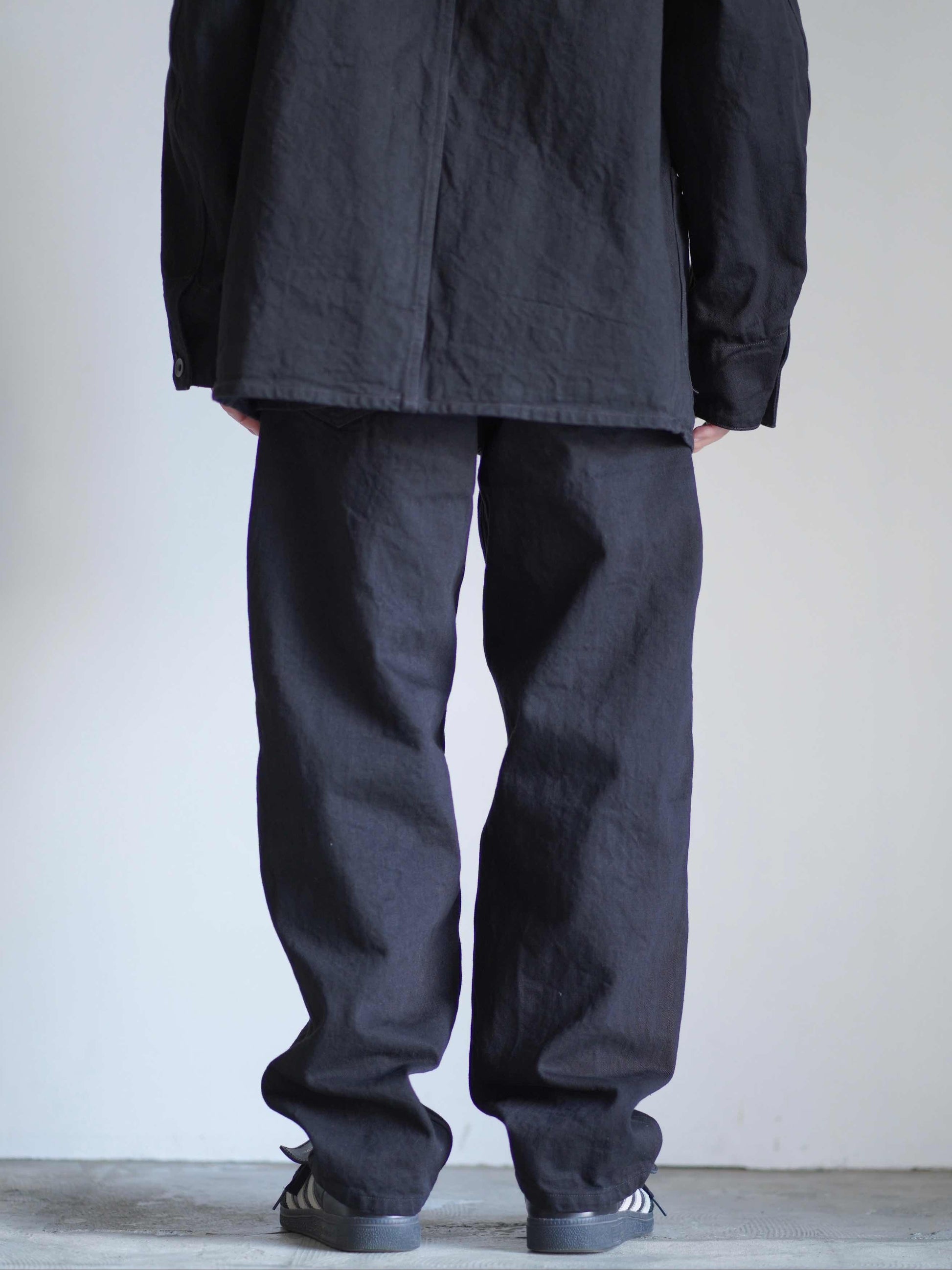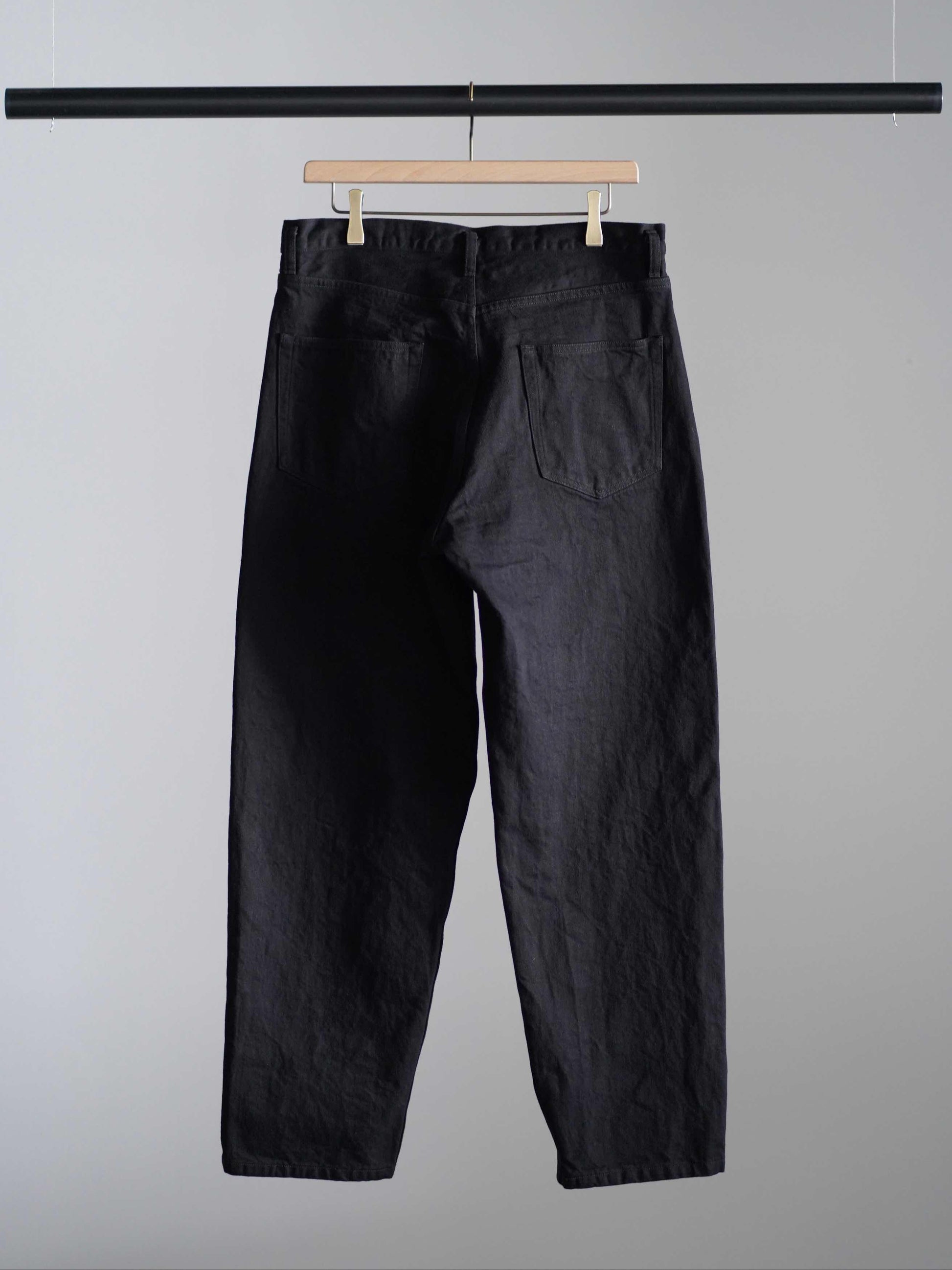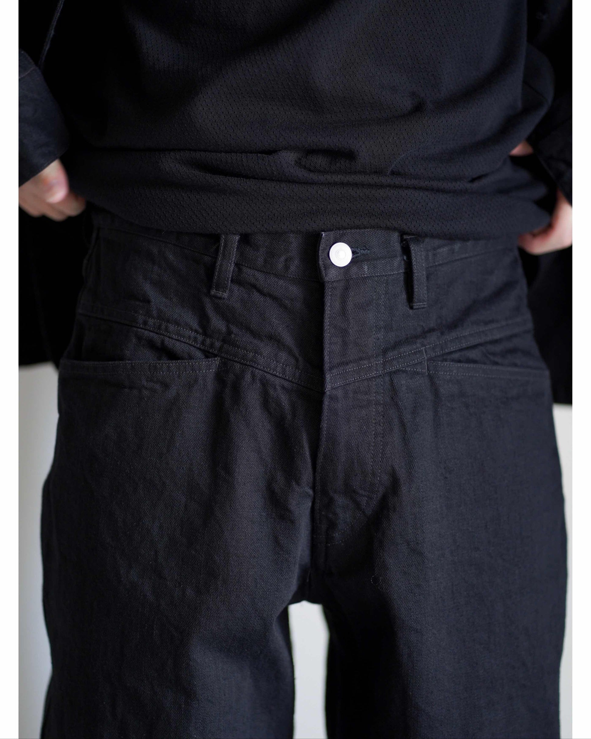 3.5ozの中白のブラックデニムで制作したテーパードパンツ。