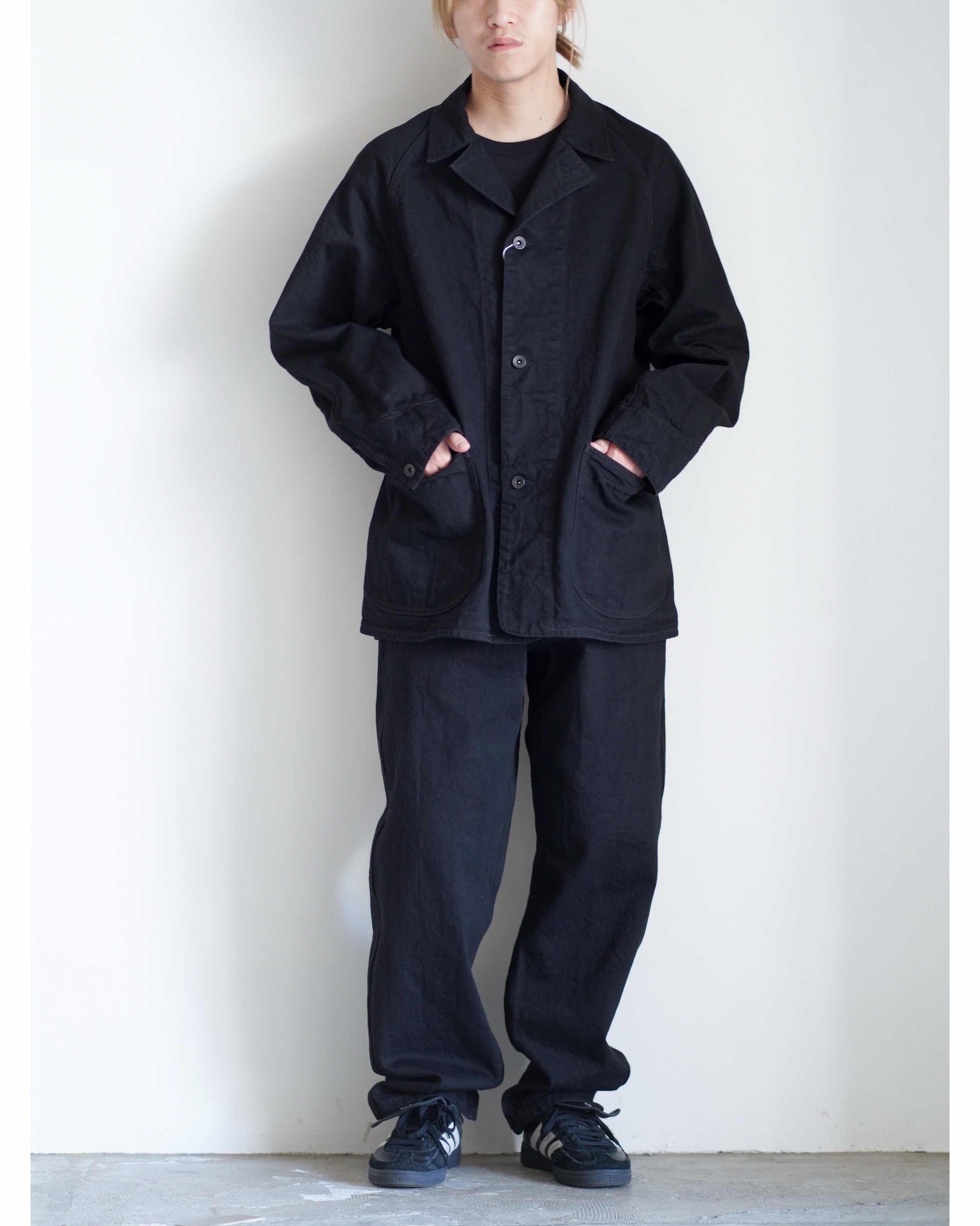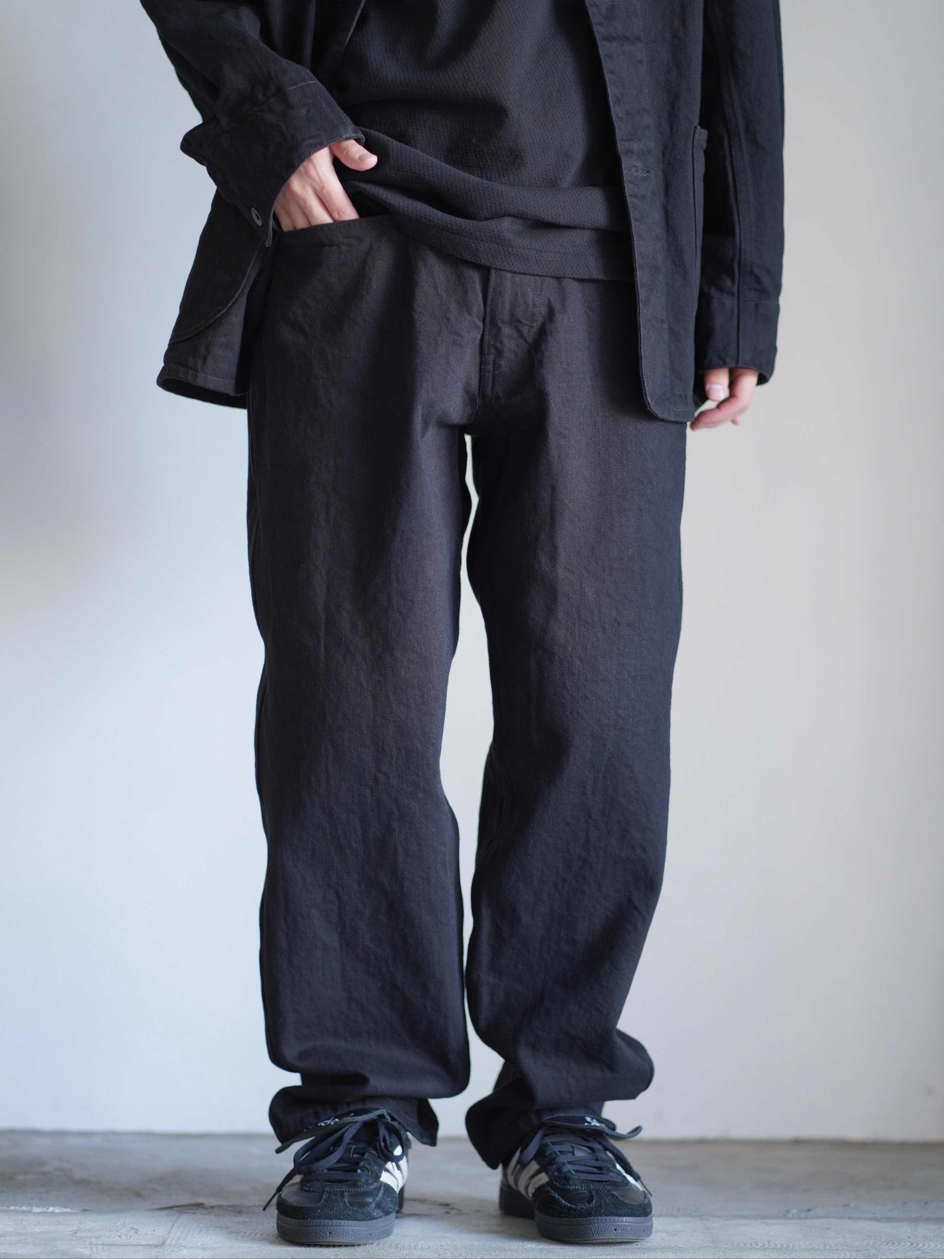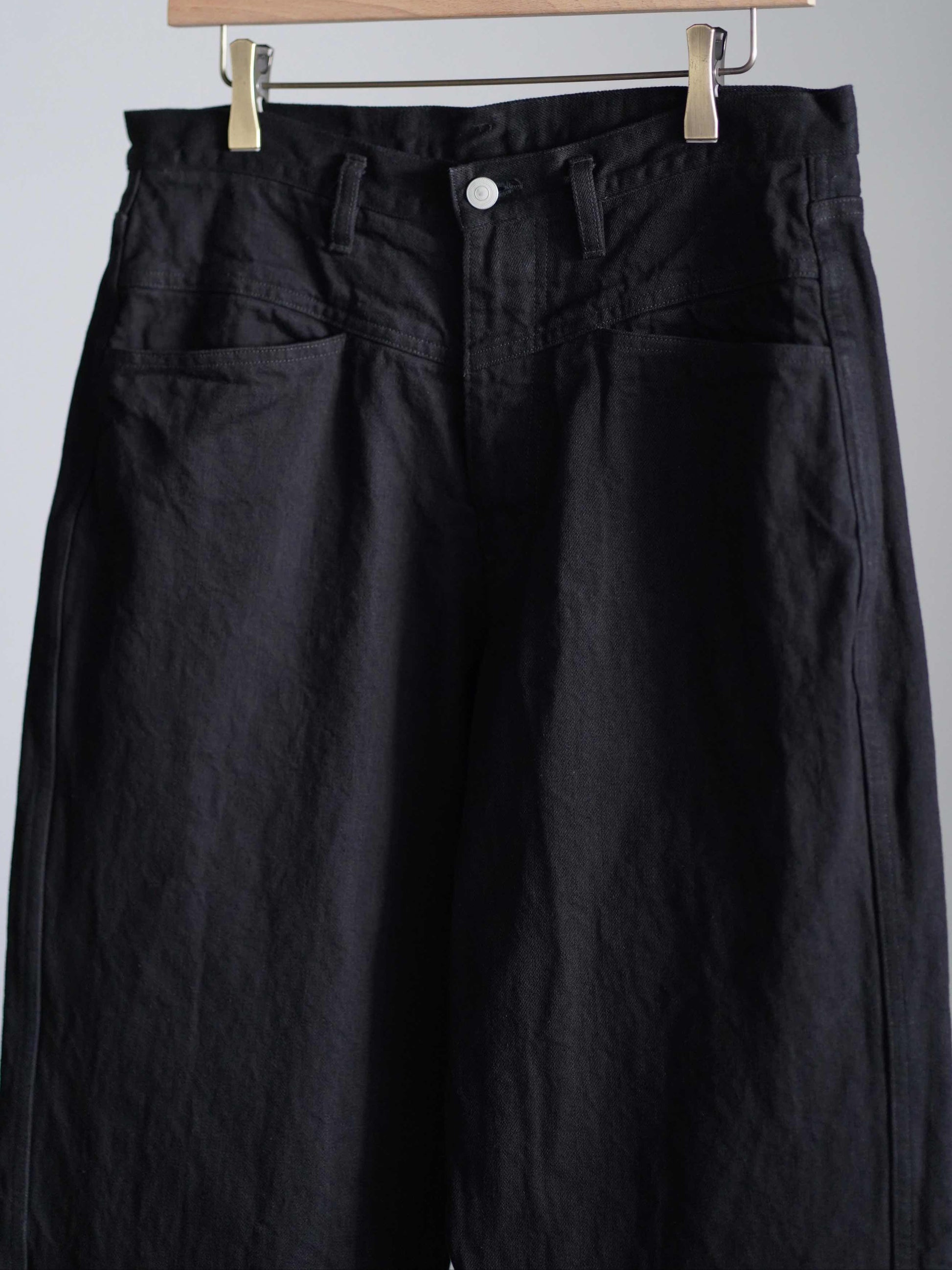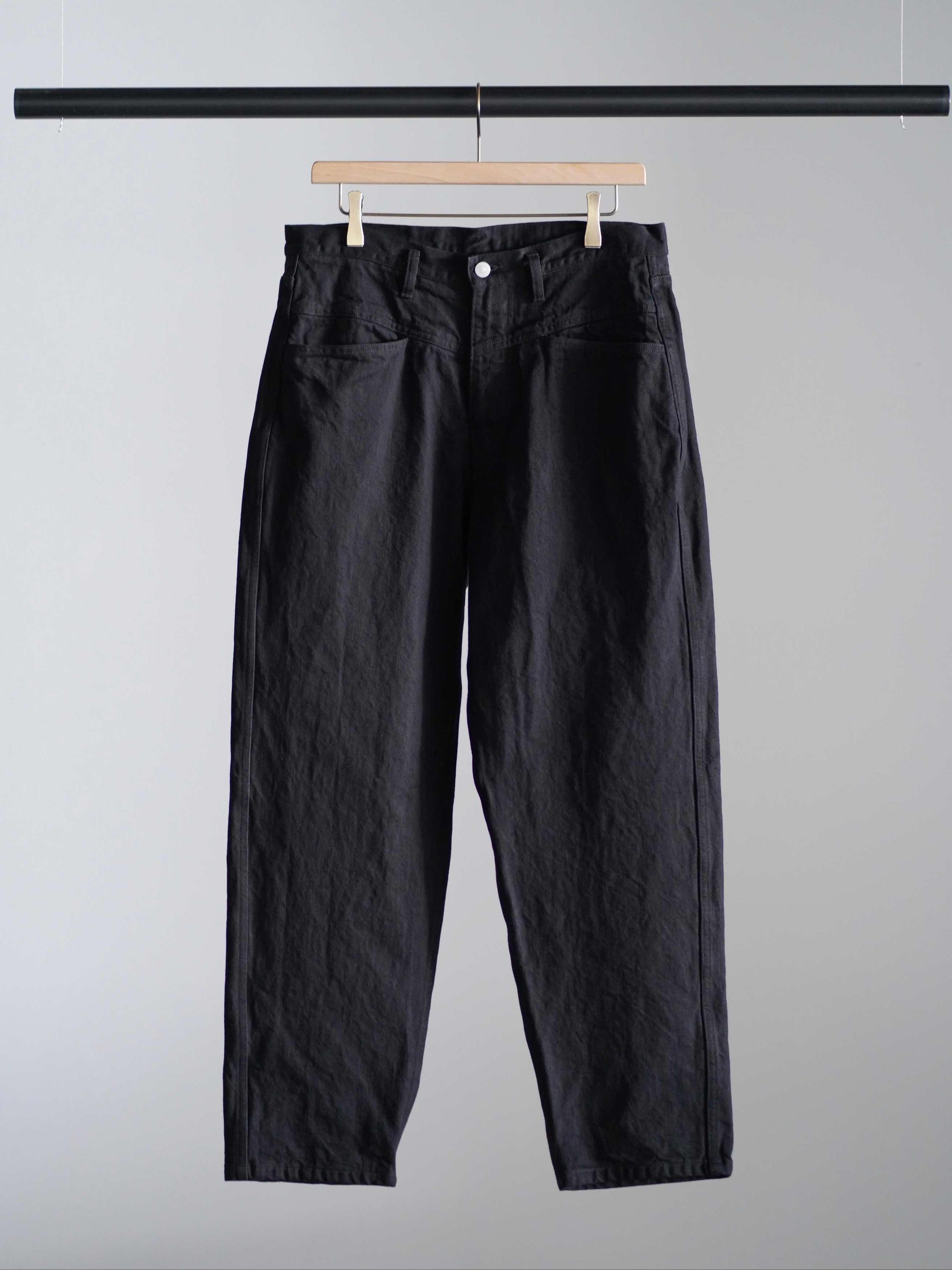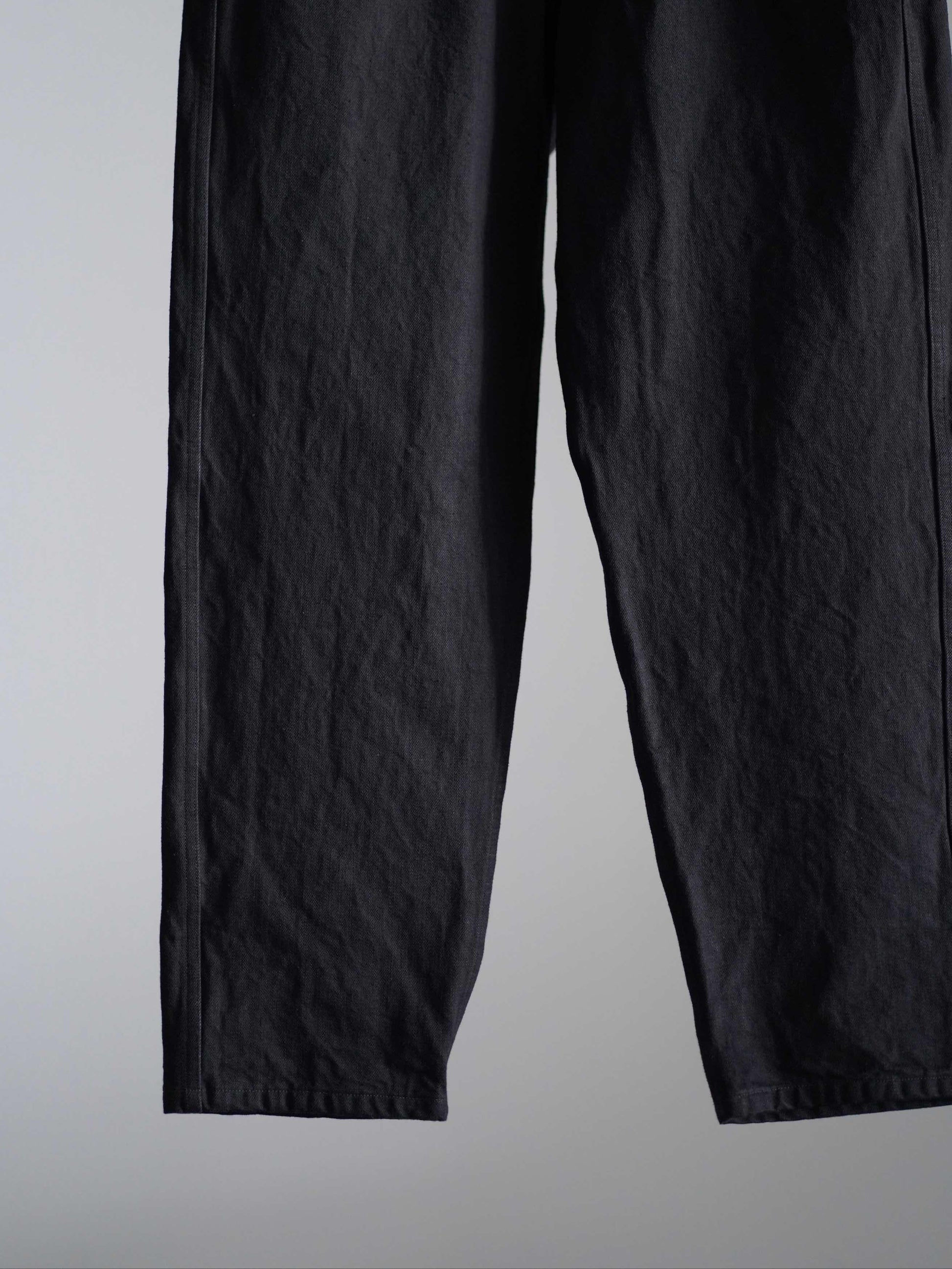 3.5ozの中白のブラックデニムで制作したテーパードパンツ。