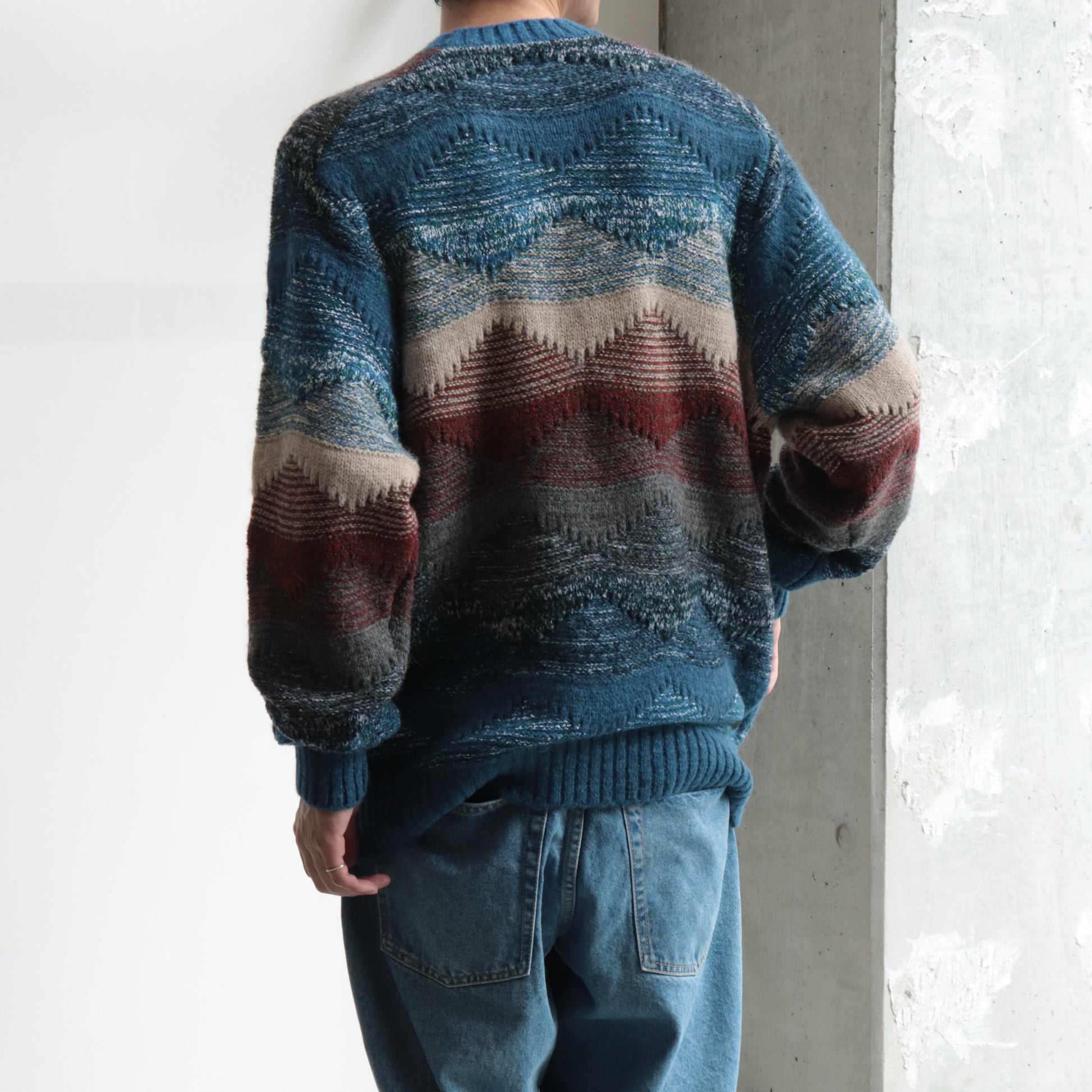 太さや色の異なる糸によってアブストラクトなパターンを表現したクルーネックニット。