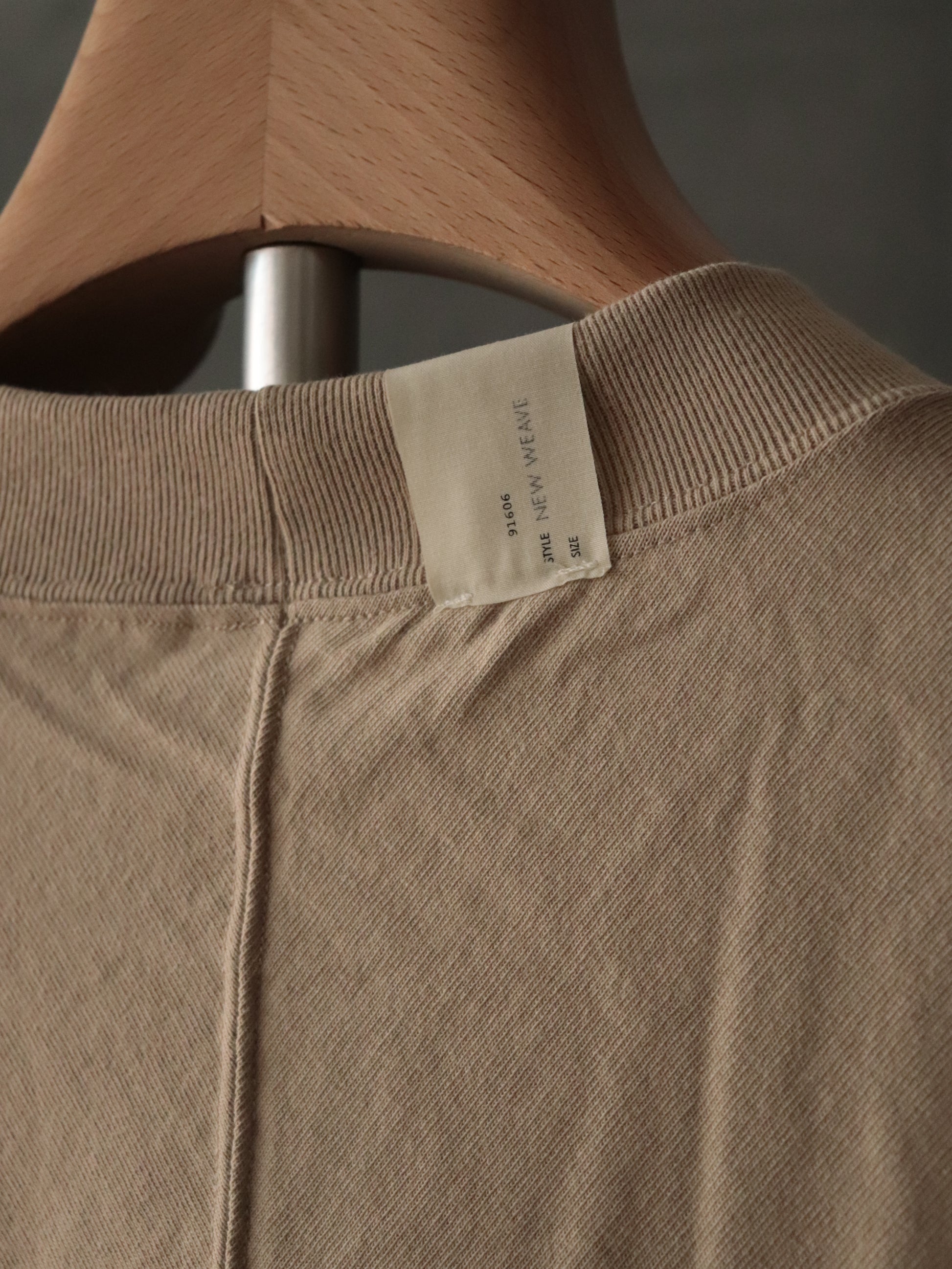 前身頃からスリーブを通り、後見頃まで一枚の生地で製作。袖リブ仕様。裾の折り返しを太めに設定し上品な印象に。