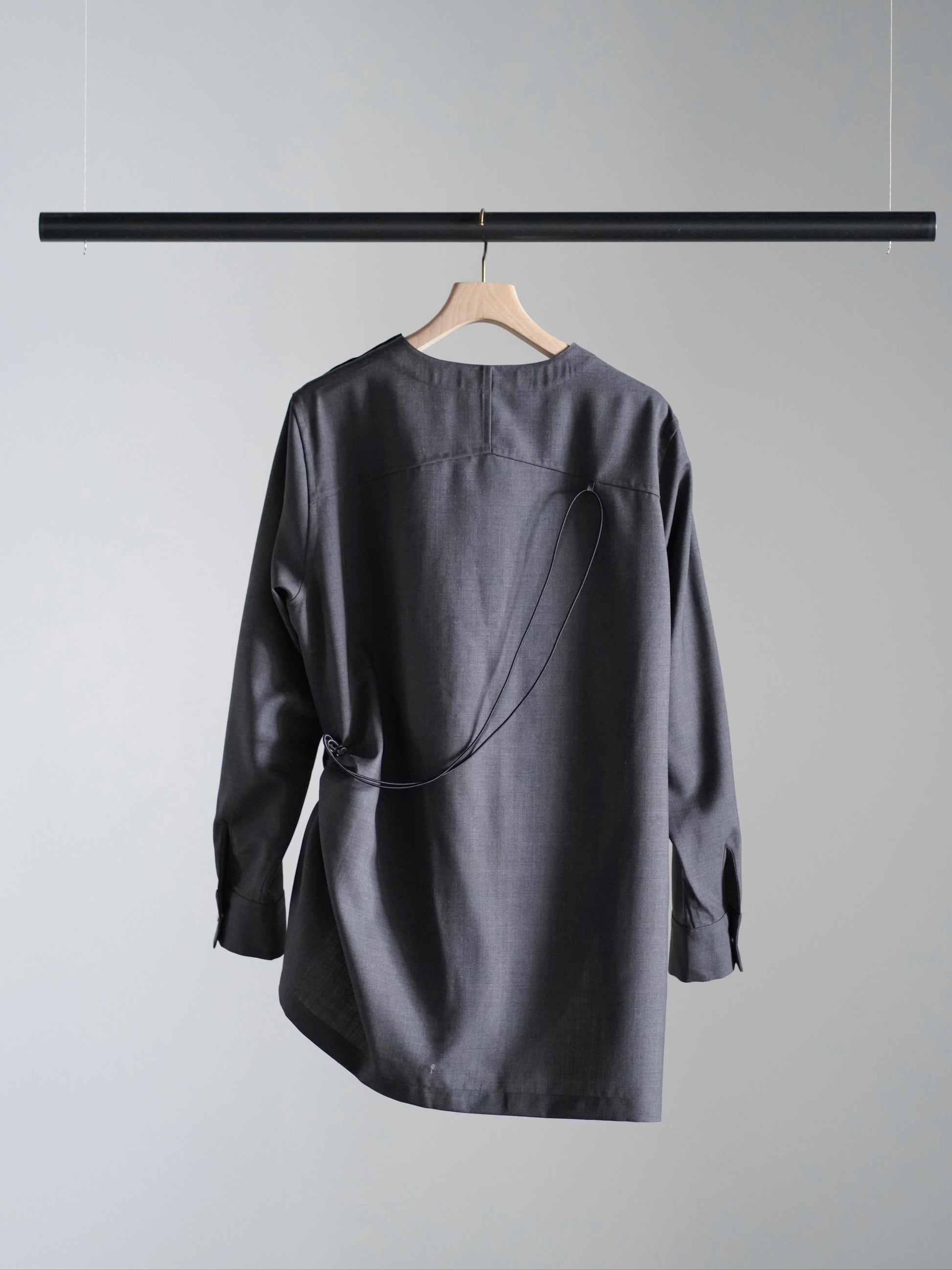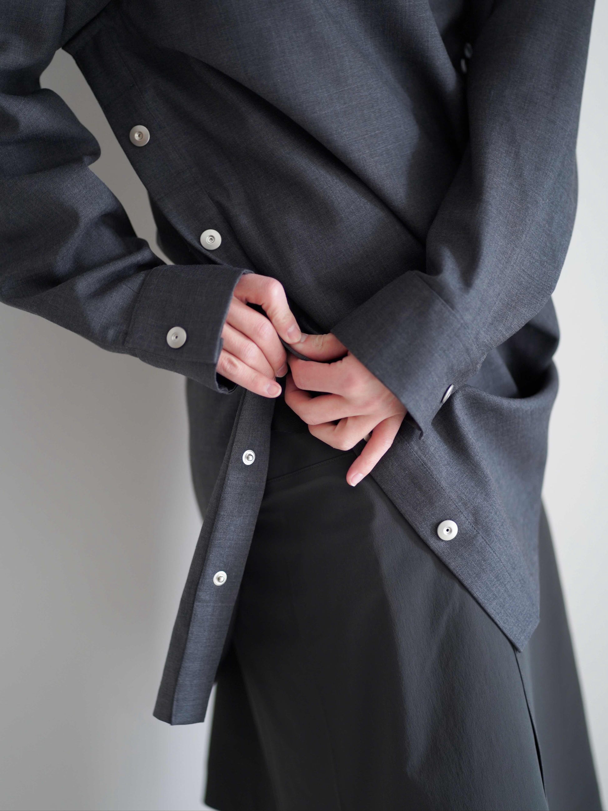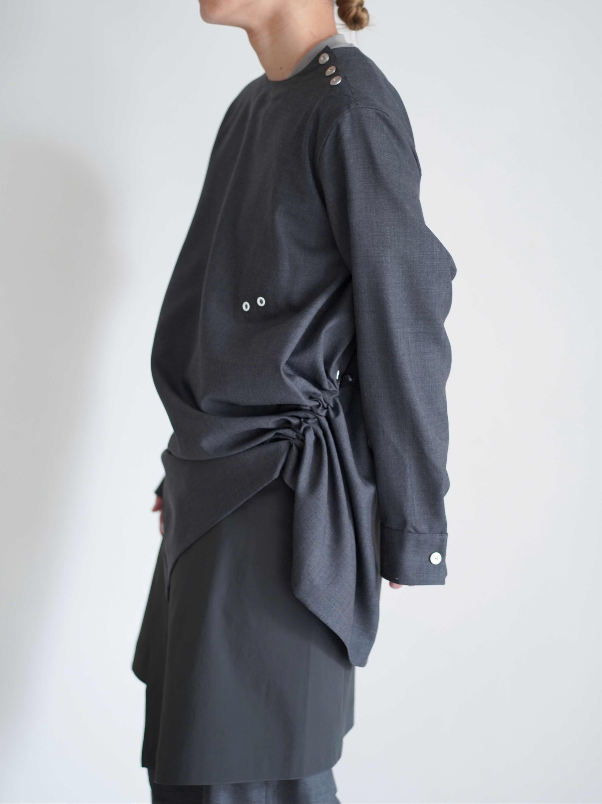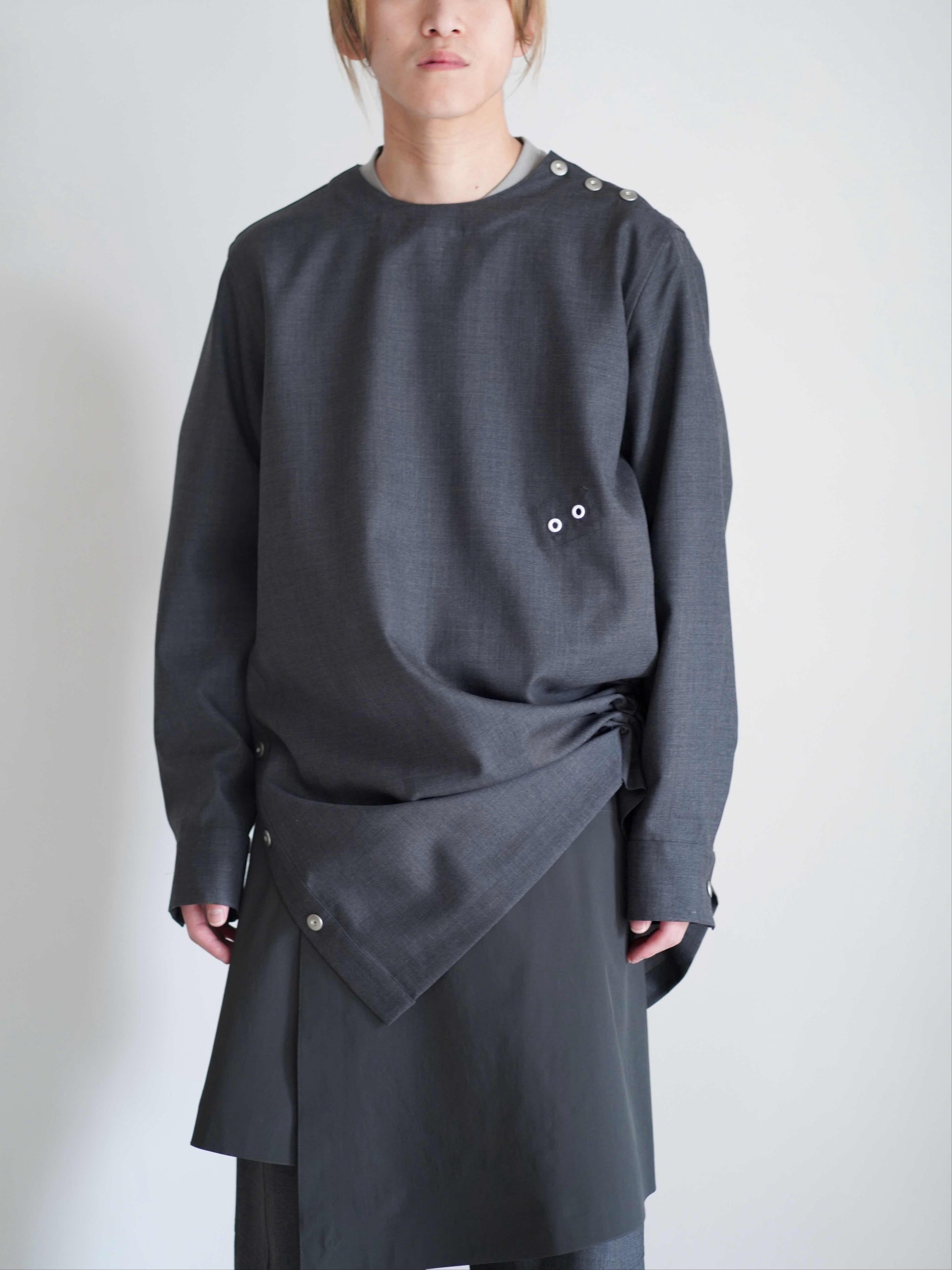オフスケール加工の肌離れの良いウールスーチング素材を使用したプルオーバーシャツ。