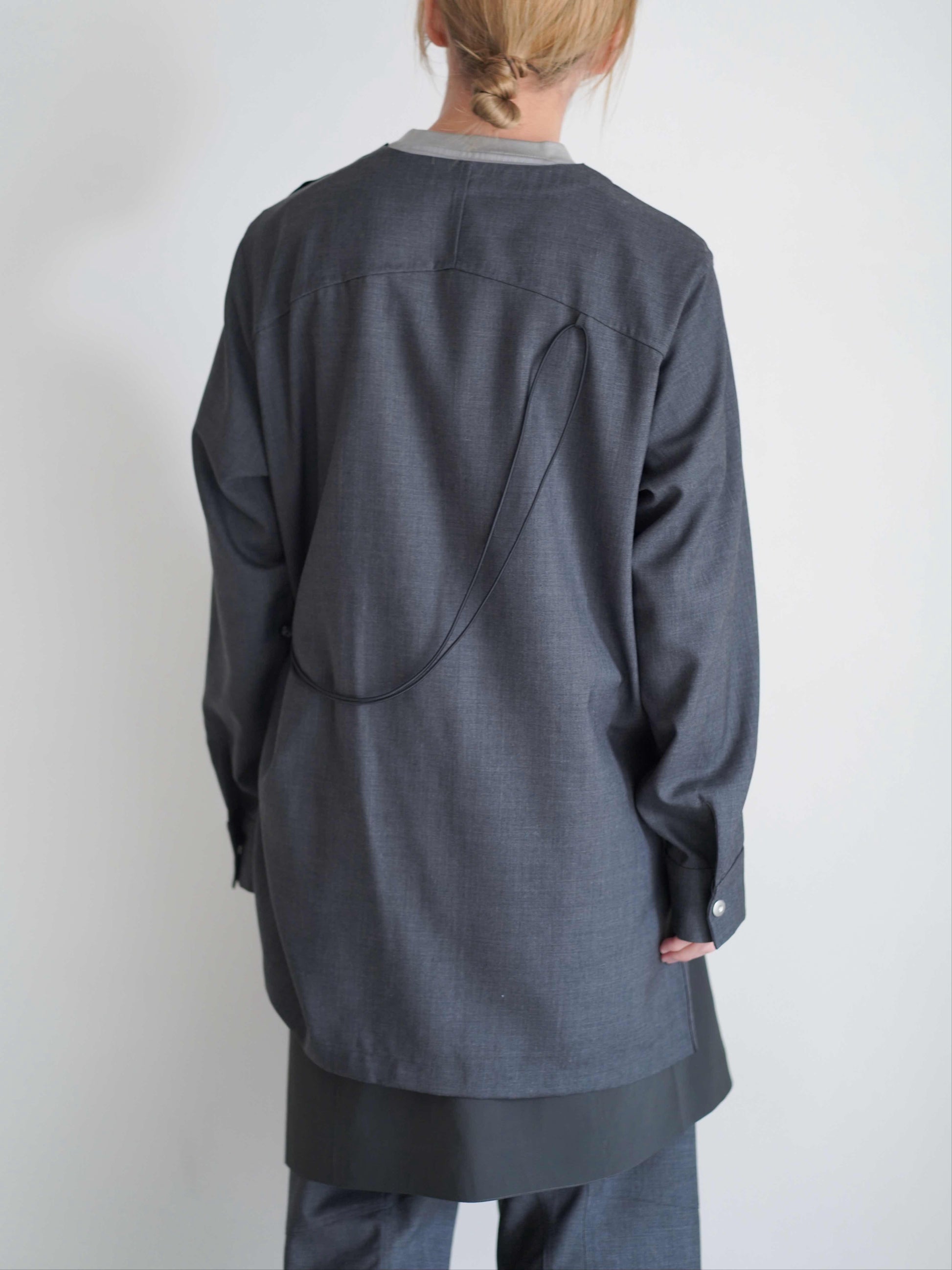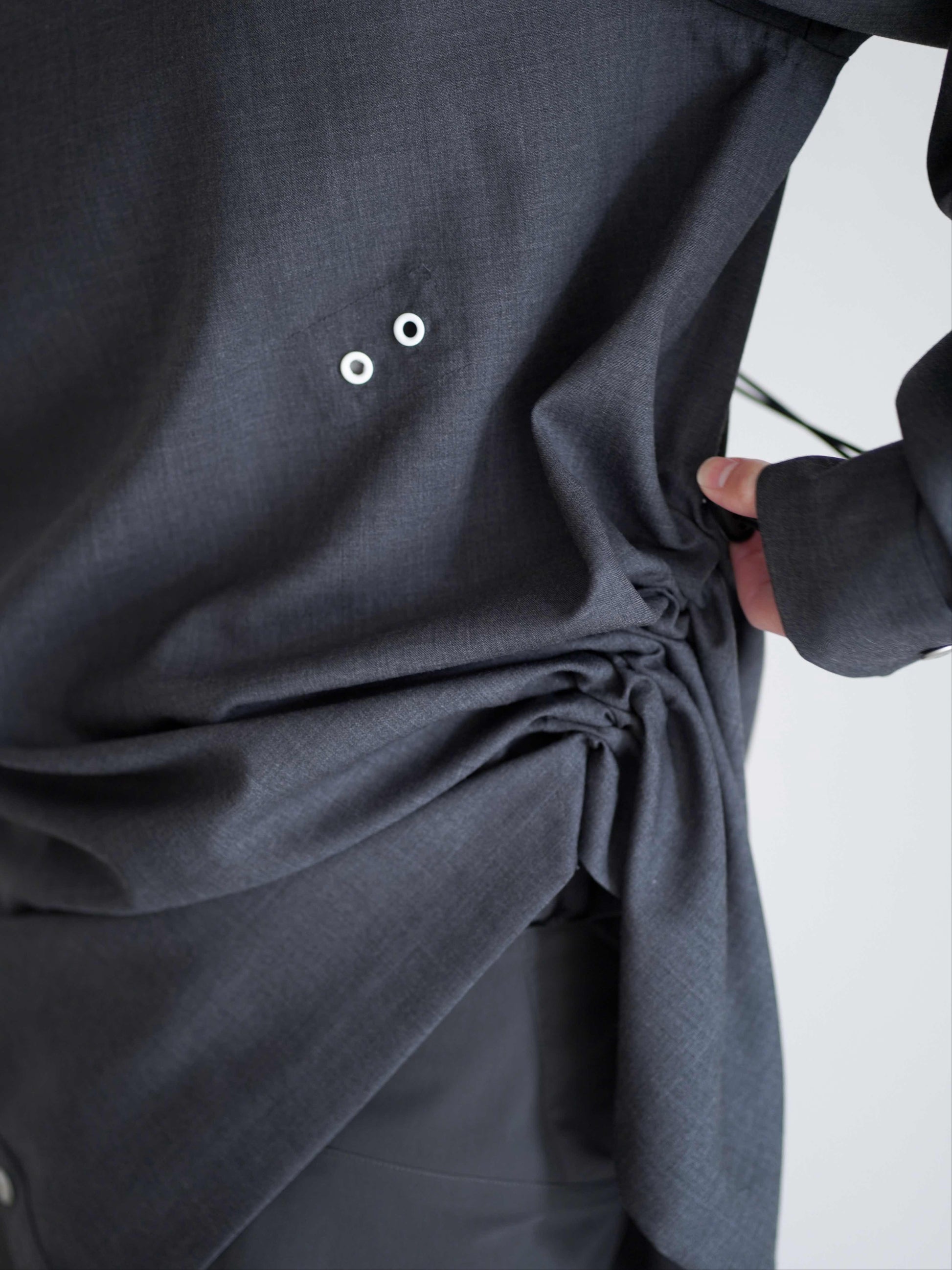 また、ドローコードを通すためのアイレットがグラフィック的なベンチレーションの役割も果たしています。今シーズンのテーマ「デザインされた機能美」を象徴するシャツになります。