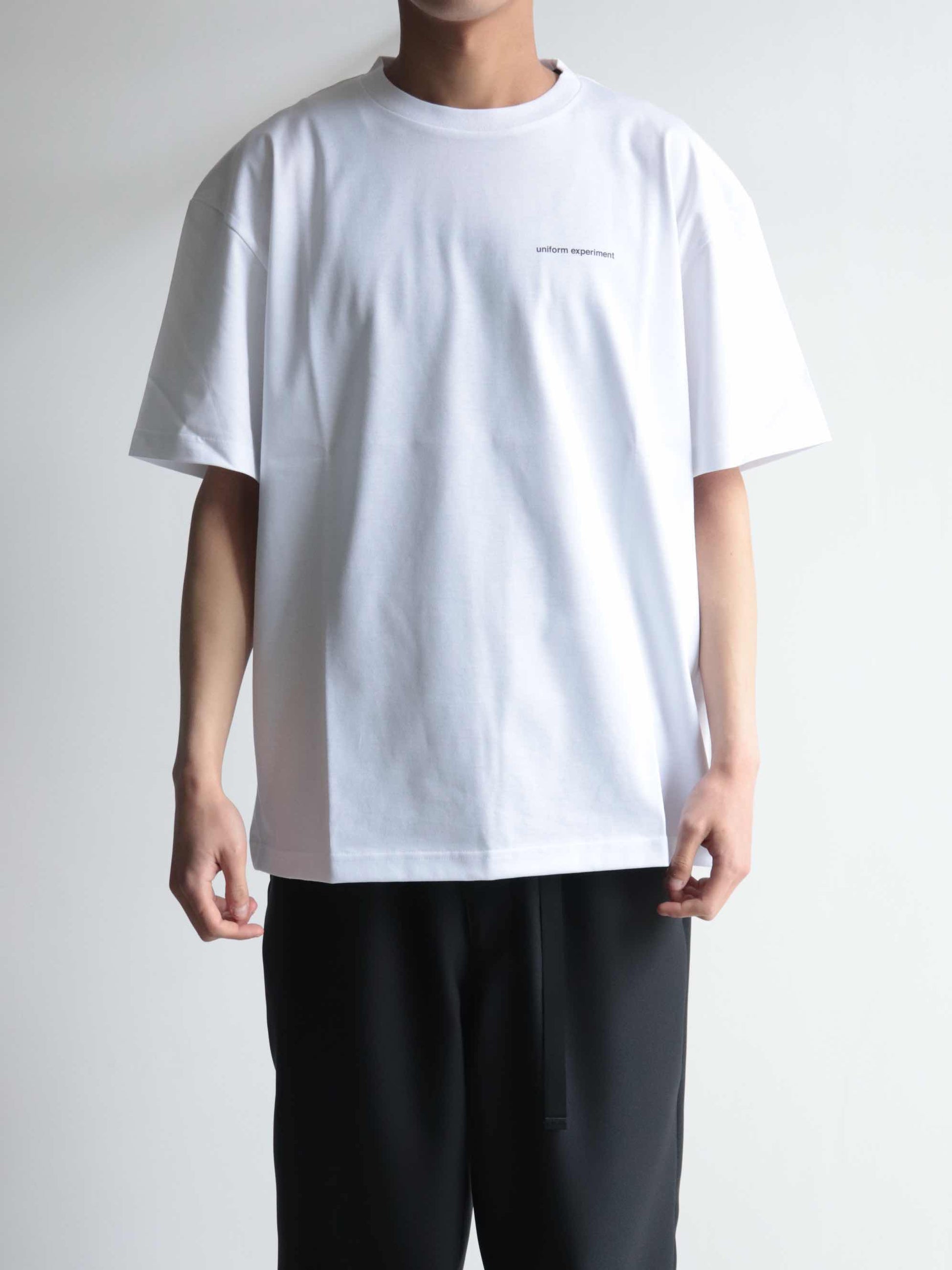 架空の暗号を散りばめて構成したサークルUEロゴ、スペルをミラー調に配置したuniform experimentロゴをバックプリントしたTシャツは今シーズン特有のアプローチである架空のフィルムシリーズ。