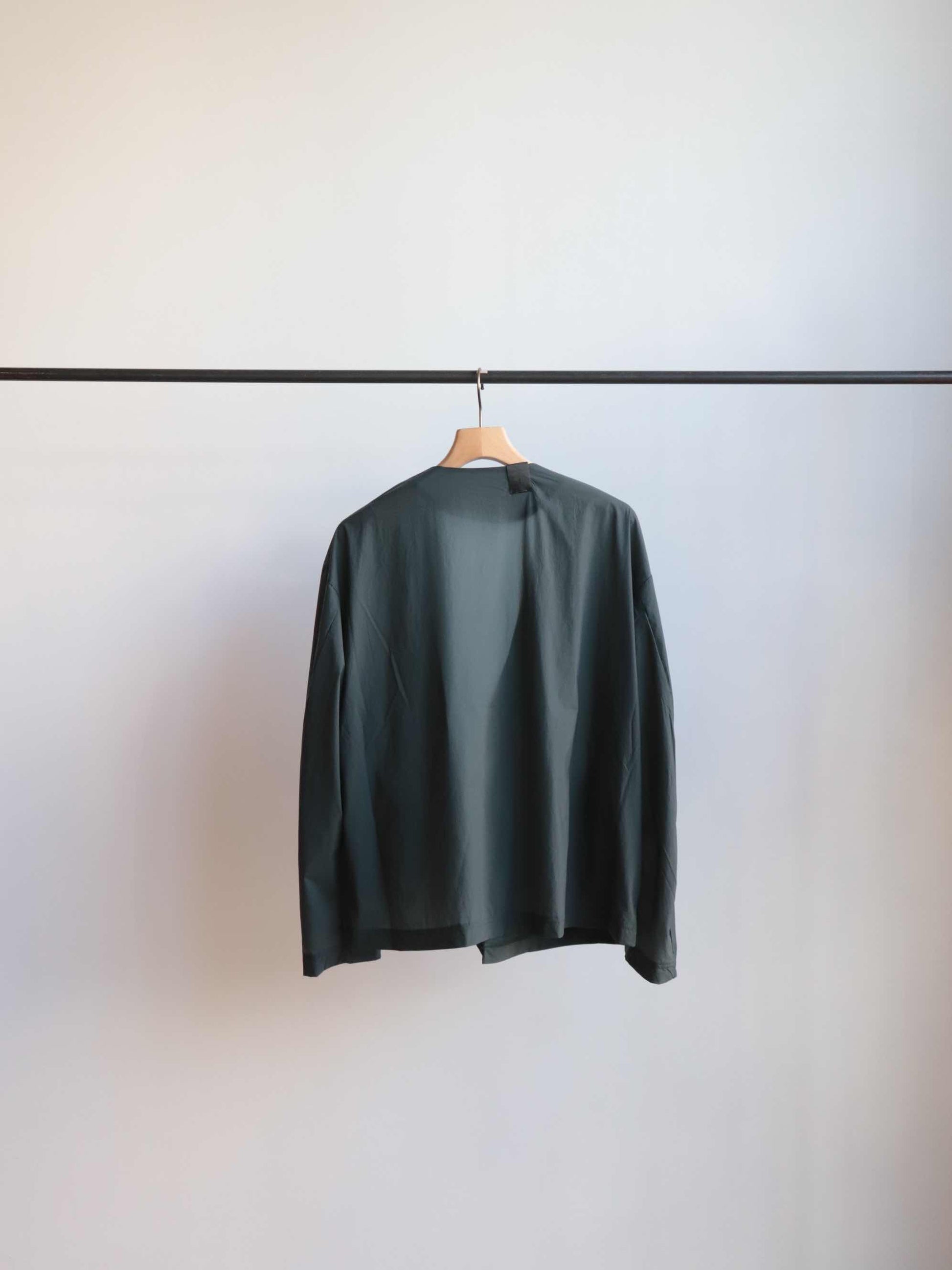 裏地なしの一枚仕立て。表にステッチのない襟元は、テーラードジャケットのラペルを内側に織り込んだときに生まれるディテールを表現。