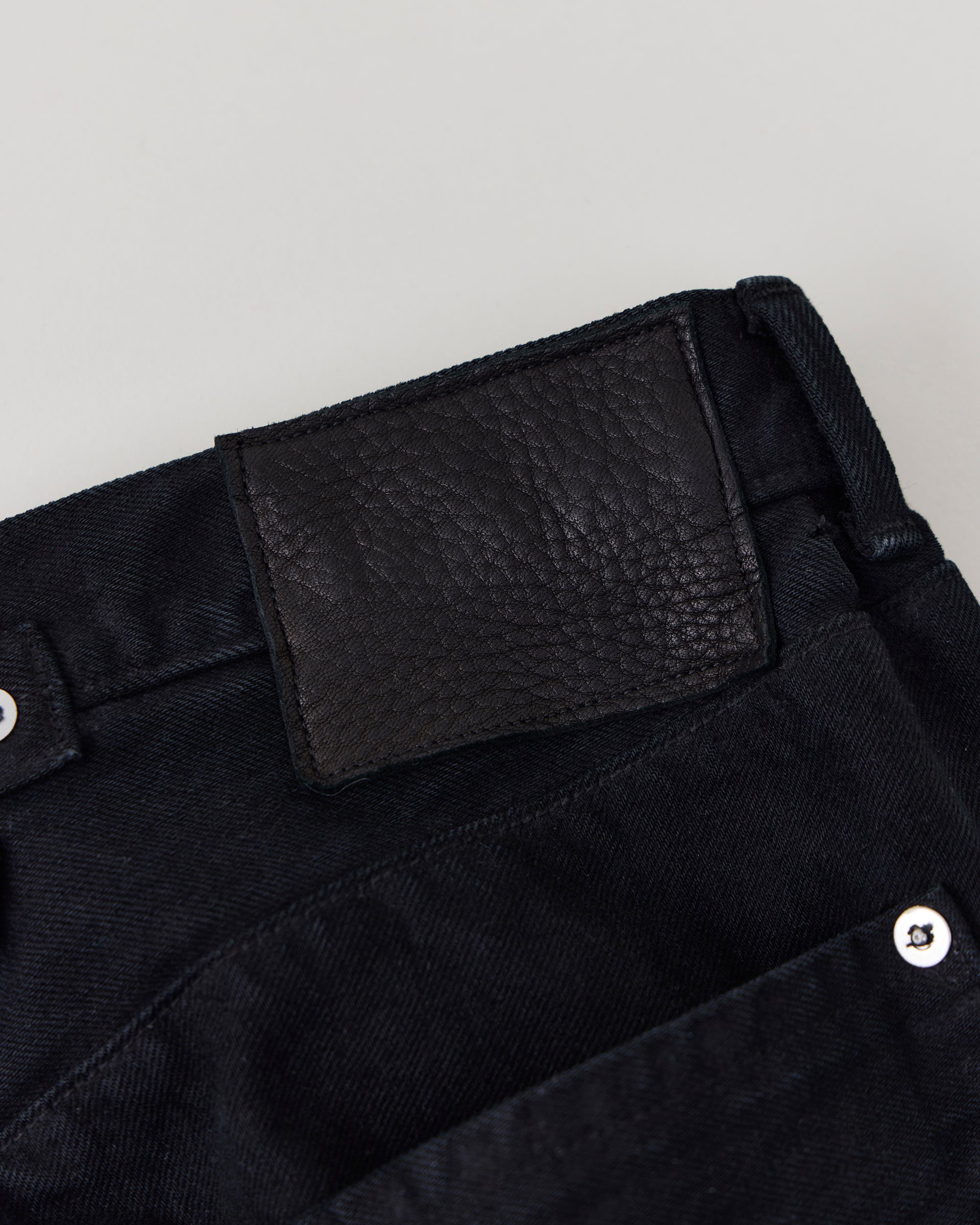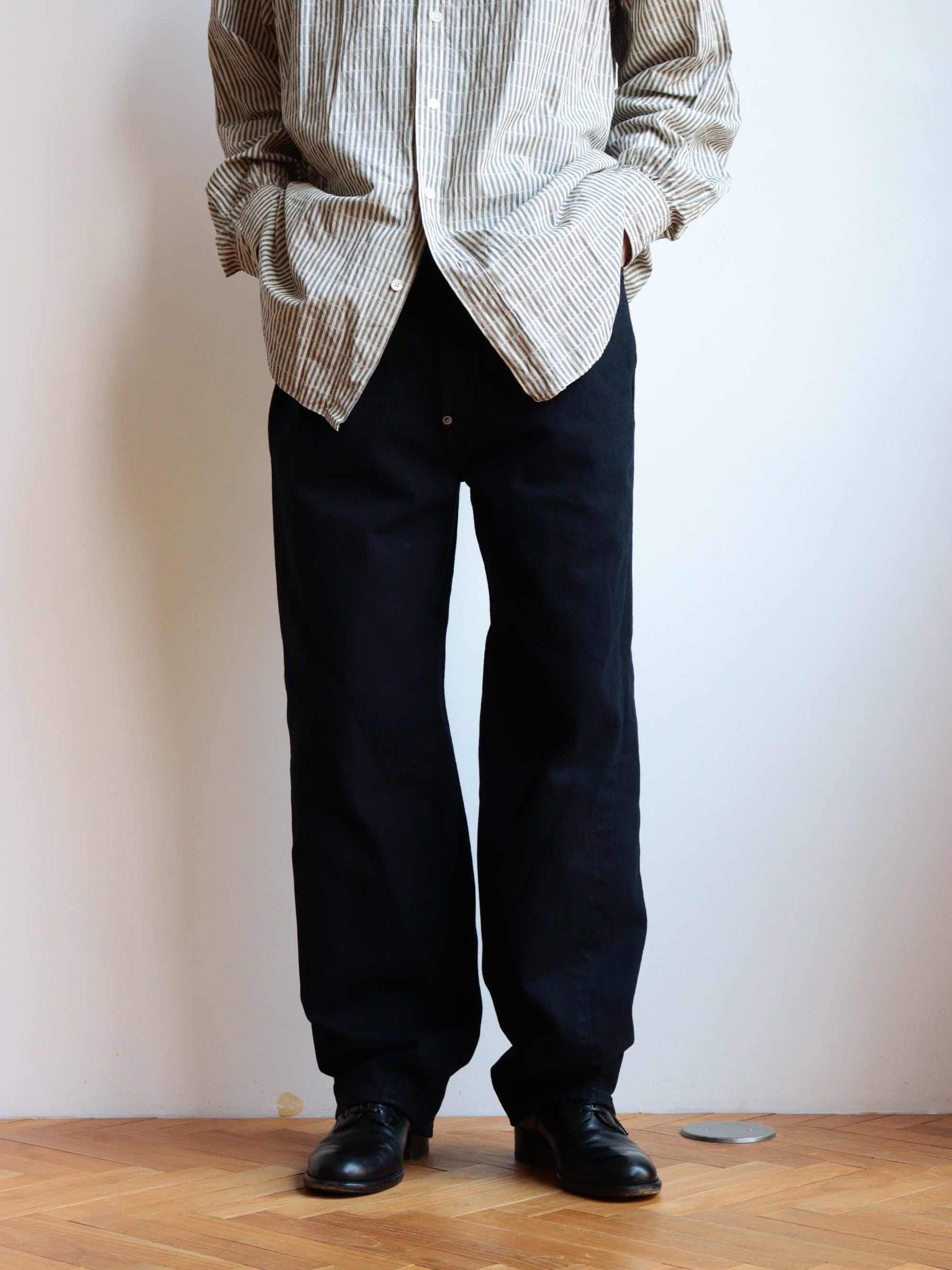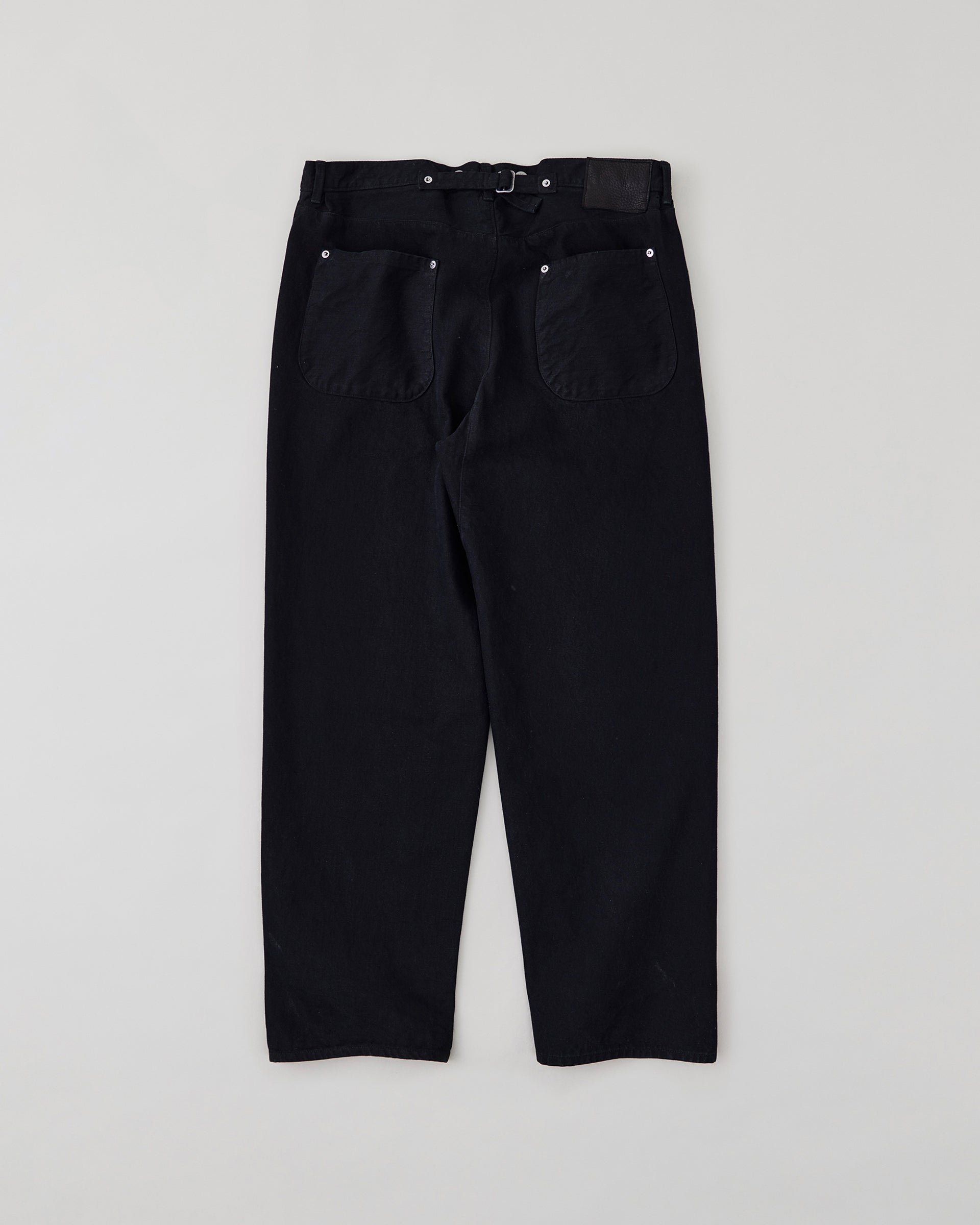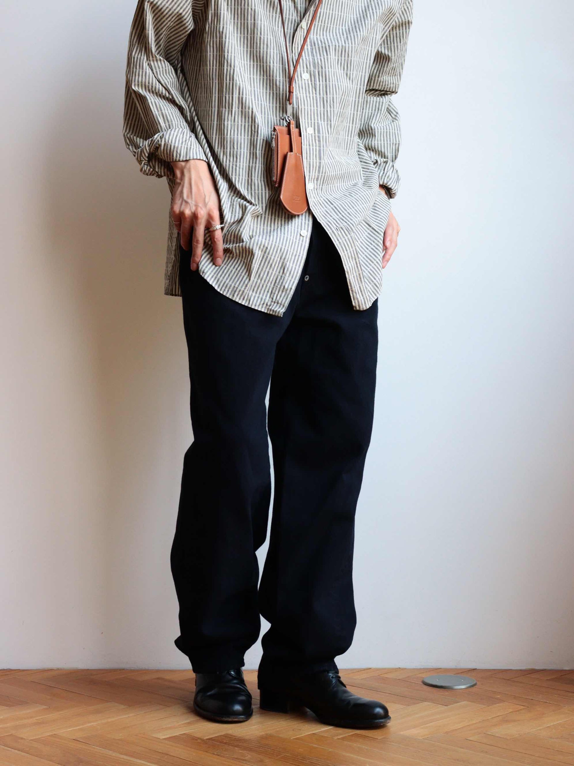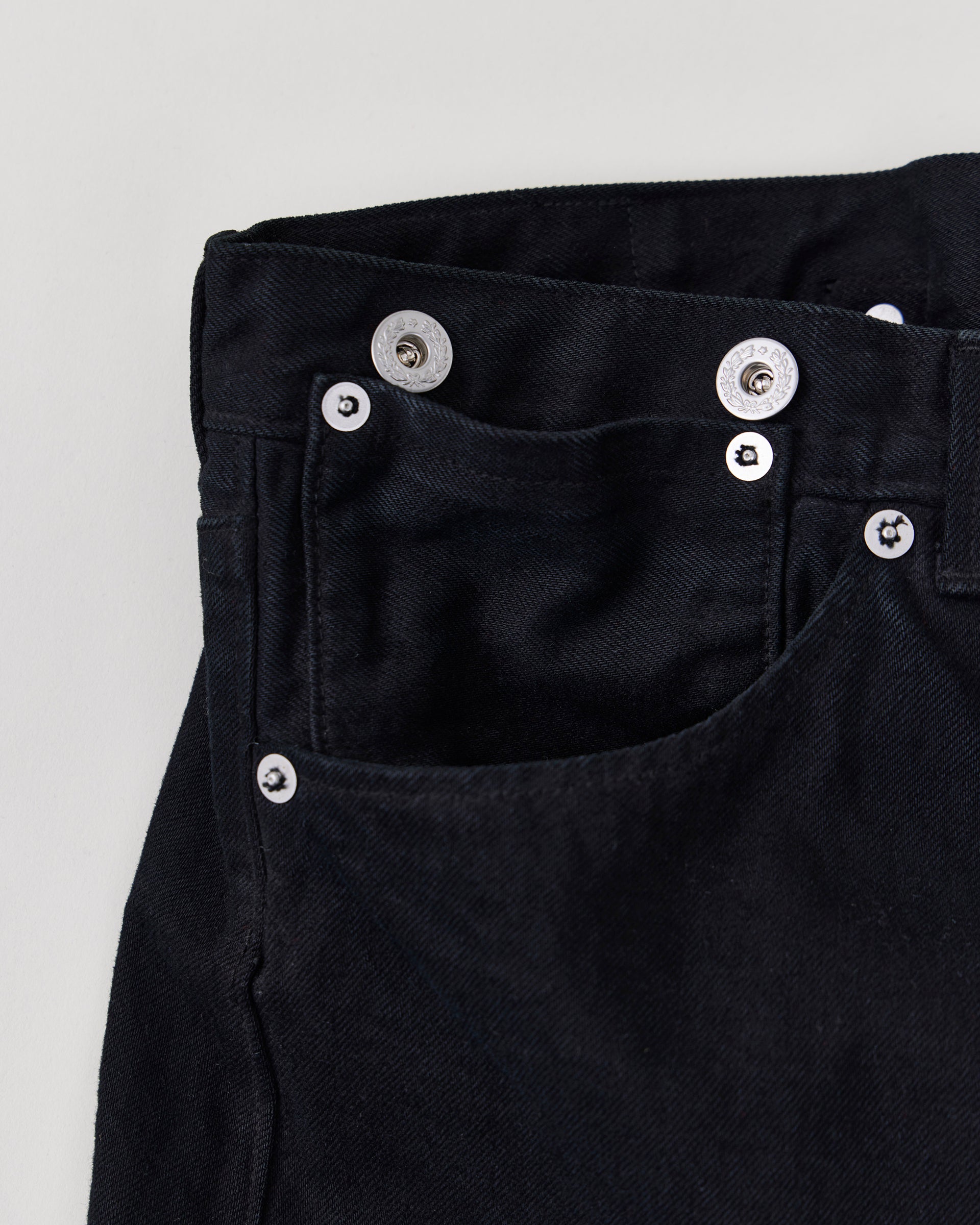 ⽣地はオーバーダイを施し1960年代デニムの歴史でもある⿊インディゴ仕上げです。使い込むと⿊⾊が落ちて中からインディゴカラーが覗くよう設計しています。ヴィンテージ感を表現するため仕上げ後の⽑焼き・スキュー加⼯無しで作り上げました。