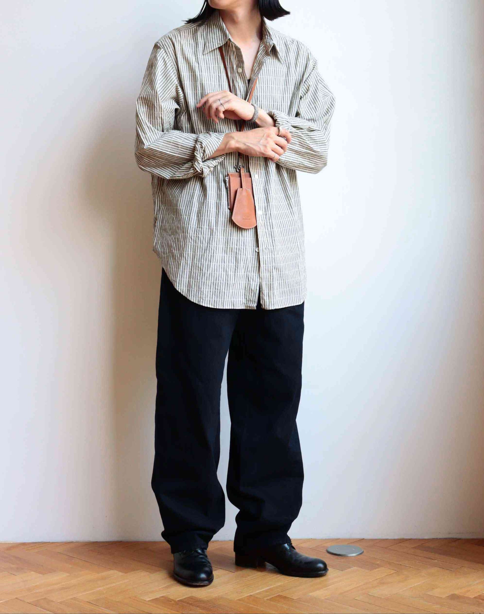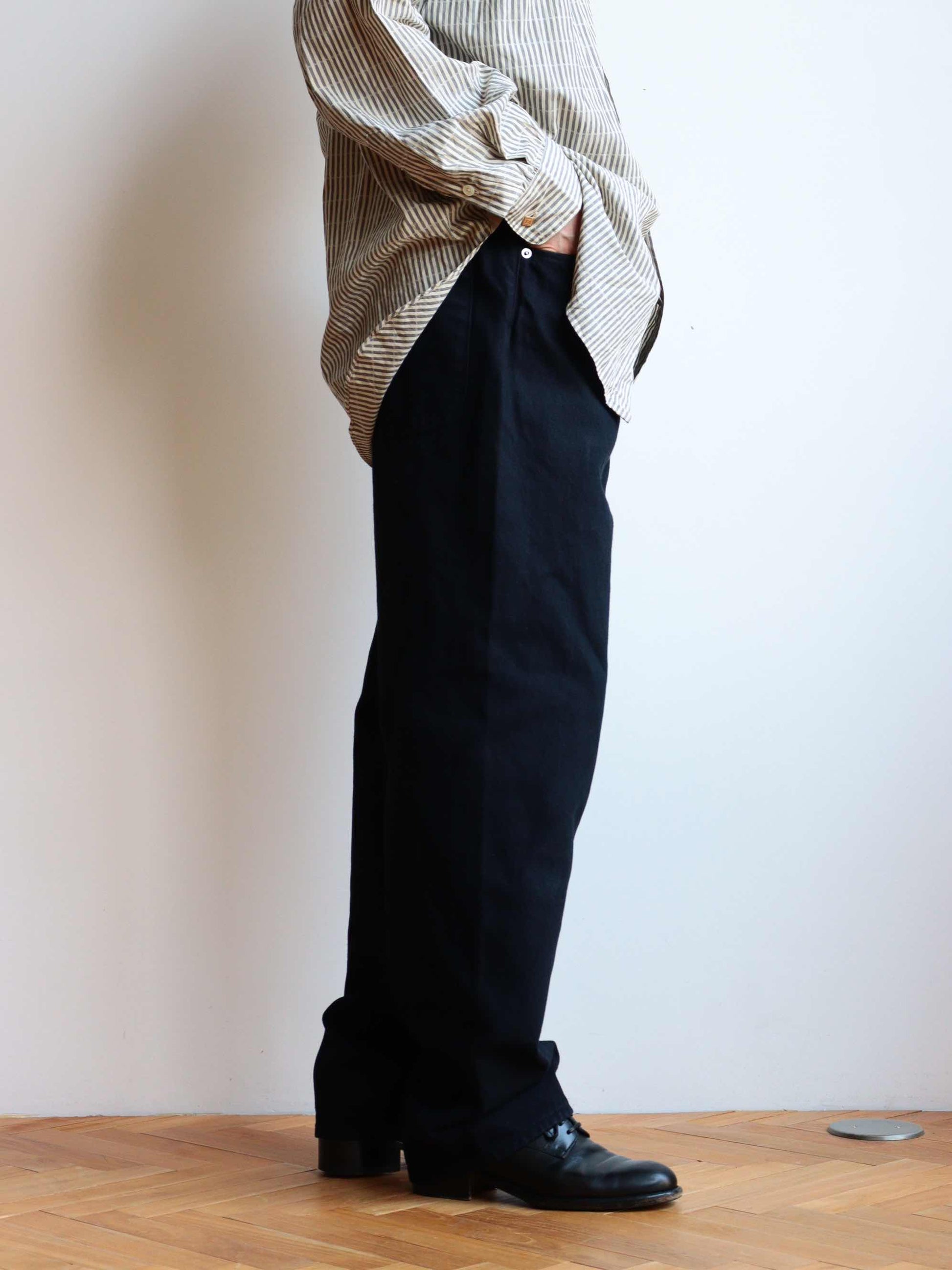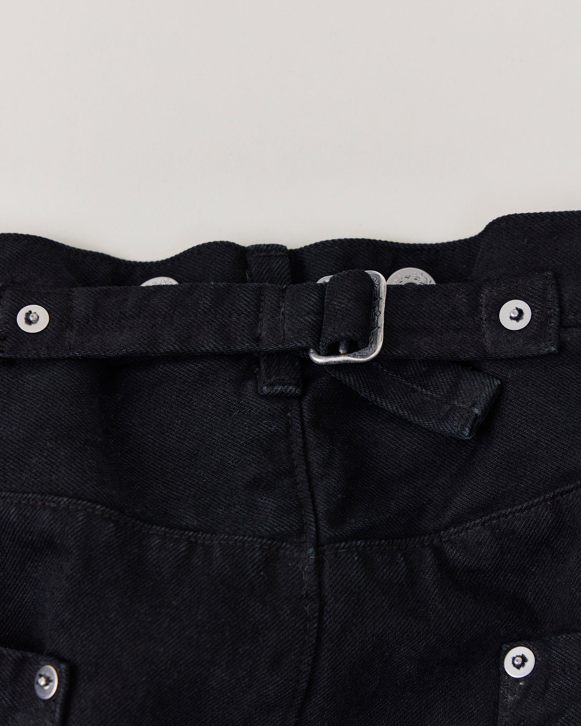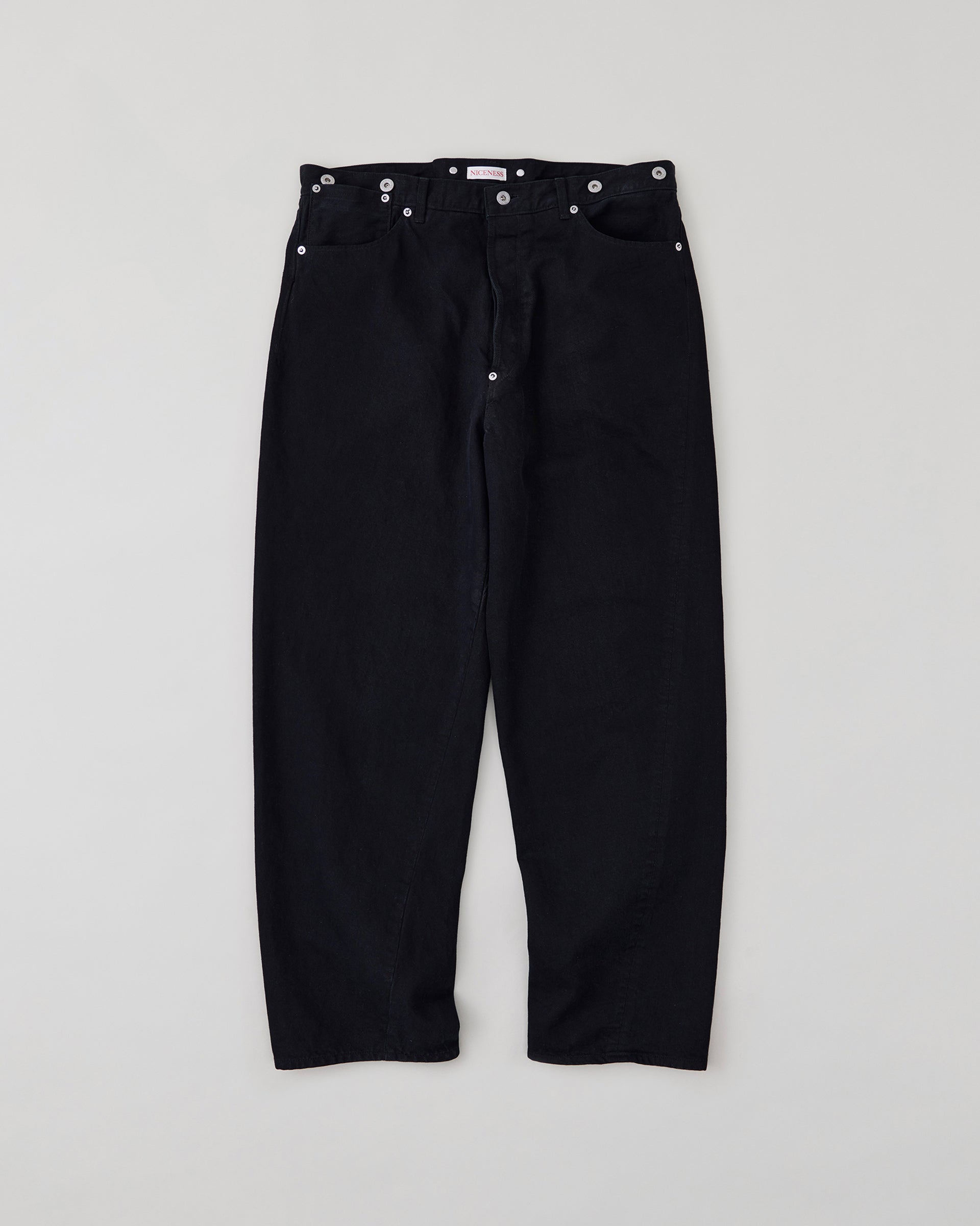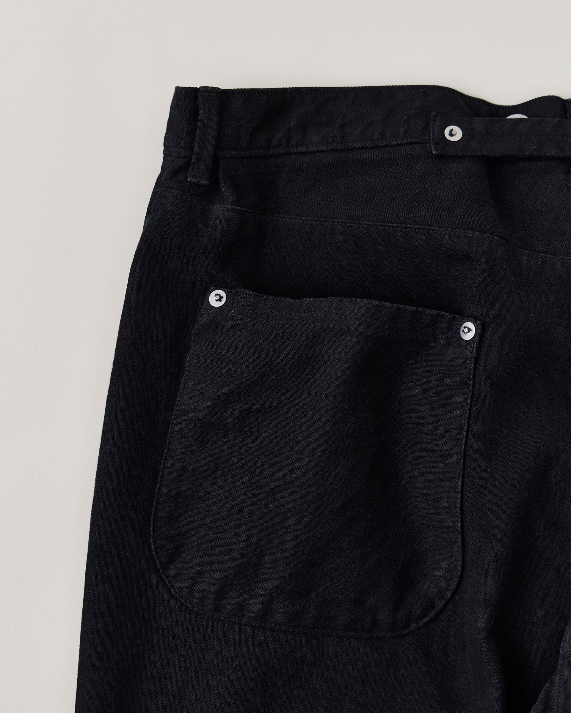 ⽣地はオーバーダイを施し1960年代デニムの歴史でもある⿊インディゴ仕上げです。使い込むと⿊⾊が落ちて中からインディゴカラーが覗くよう設計しています。ヴィンテージ感を表現するため仕上げ後の⽑焼き・スキュー加⼯無しで作り上げました。