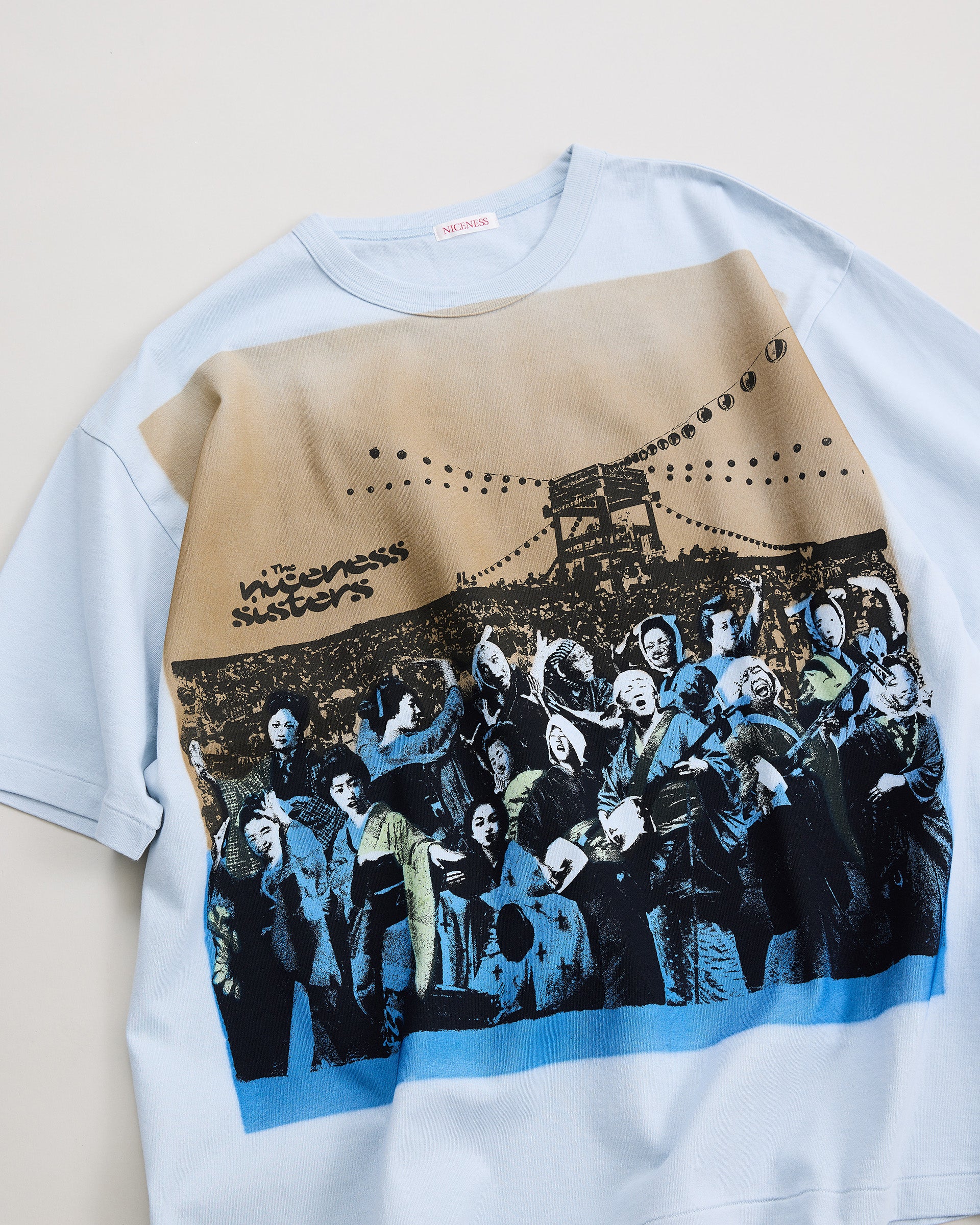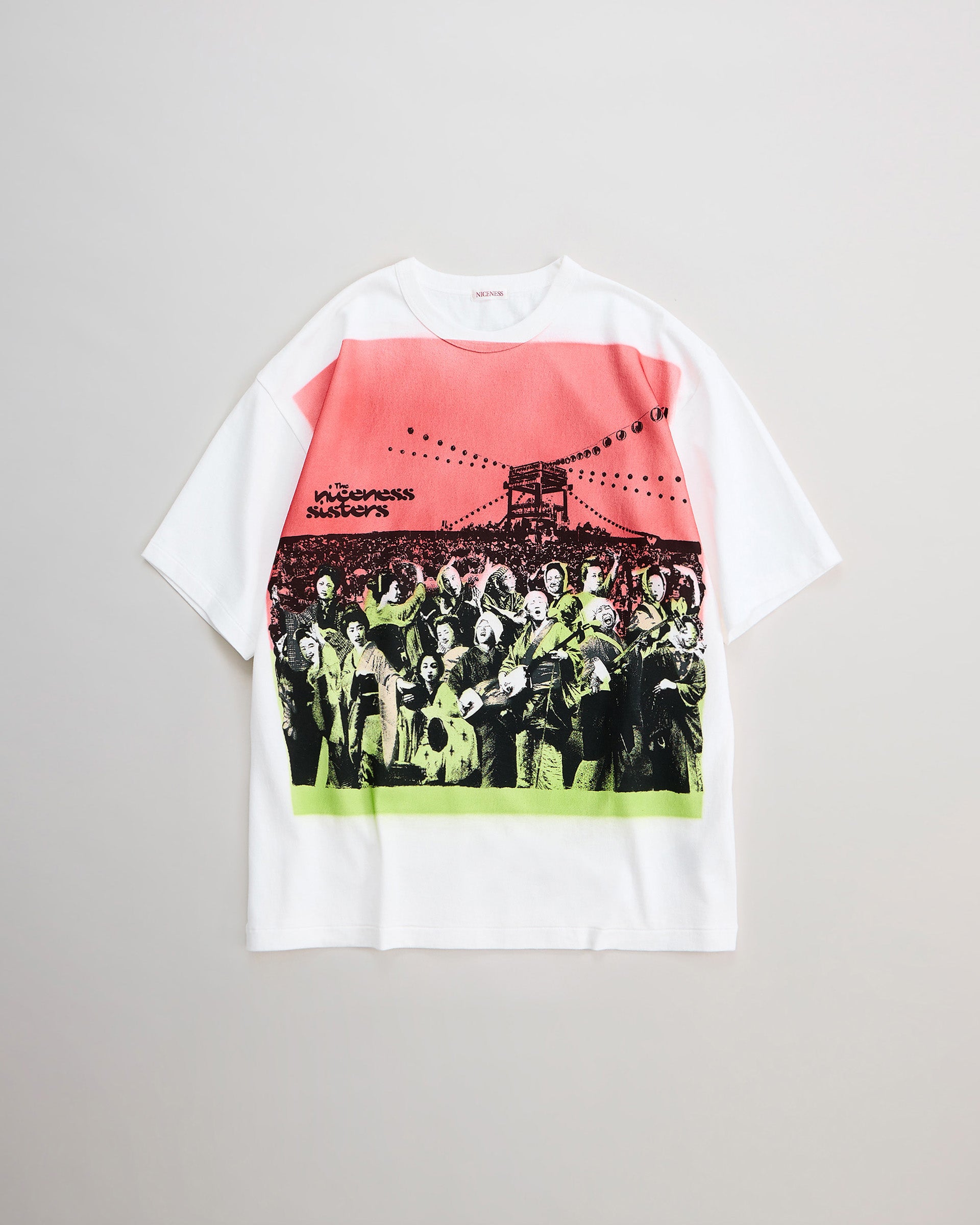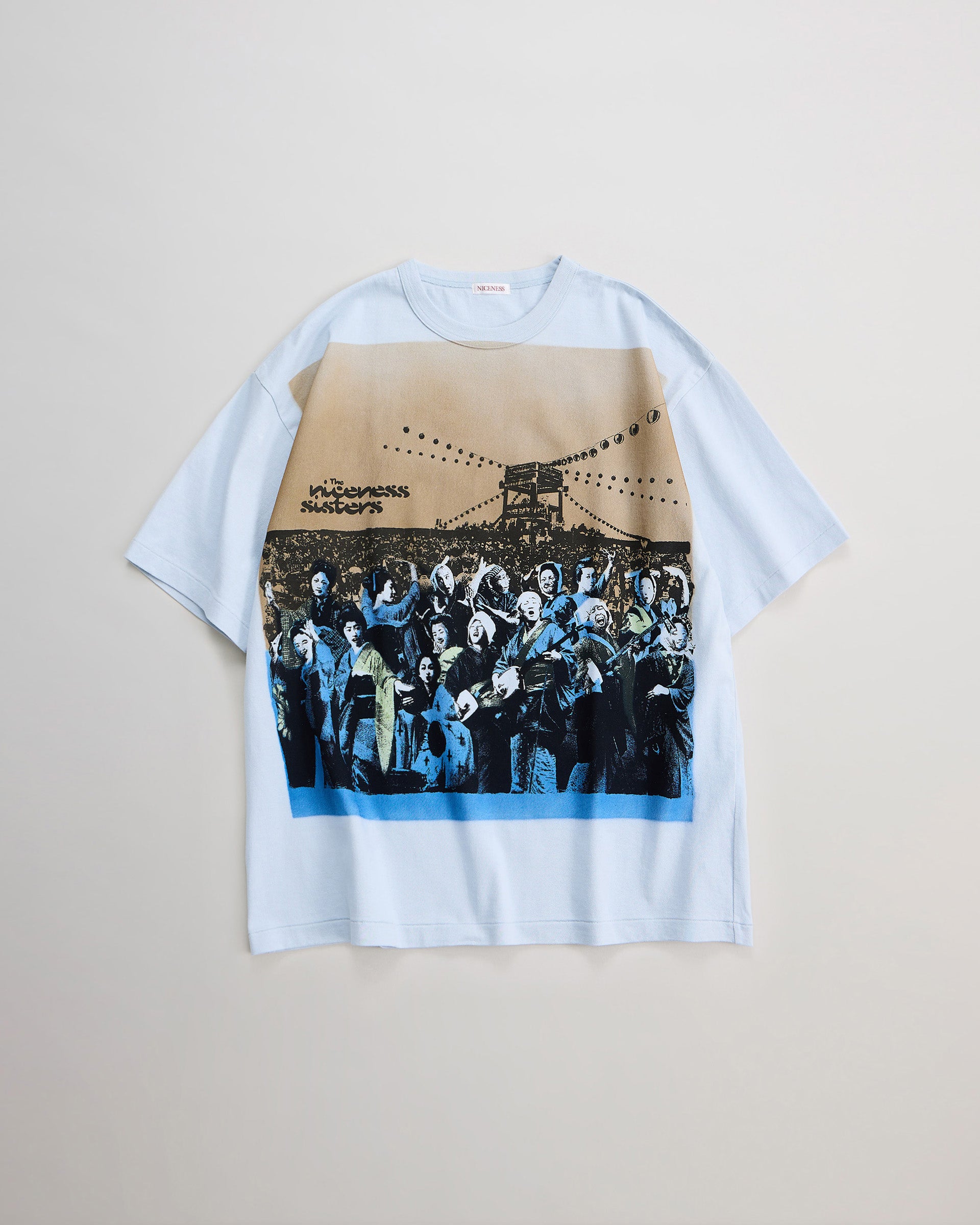 着⾊部分はエアブラシによるステンシルプリントで⼀点⼀点職⼈の⼿作業にて施されています。幕末〜明治期の「横浜写真」から着想を得て⾊彩を甦らせるという試み。記憶と現実が交差する夏の⾵物詩のような⼒強きTシャツ。