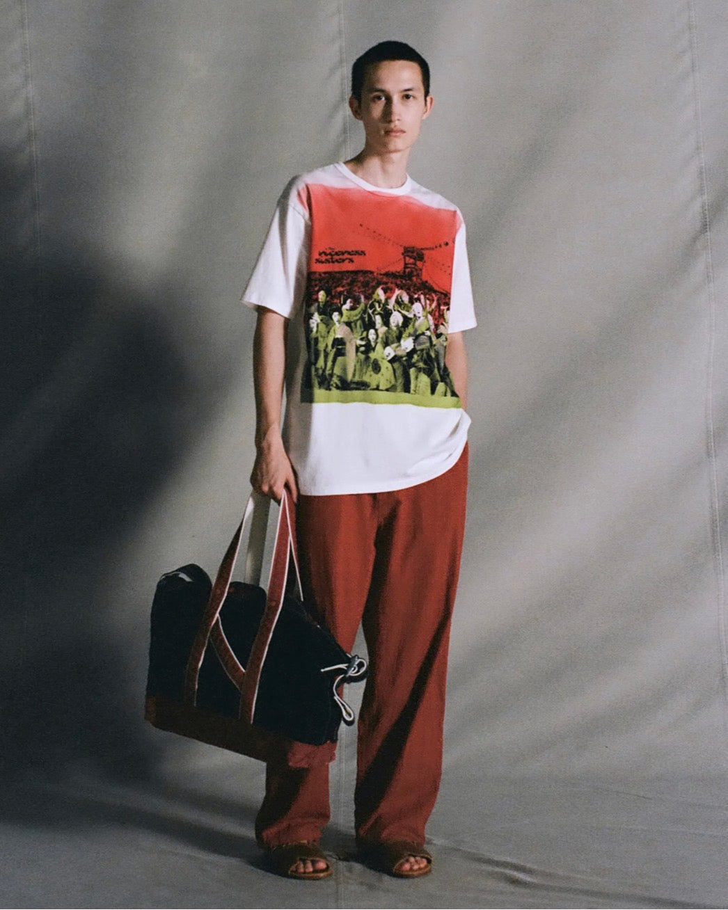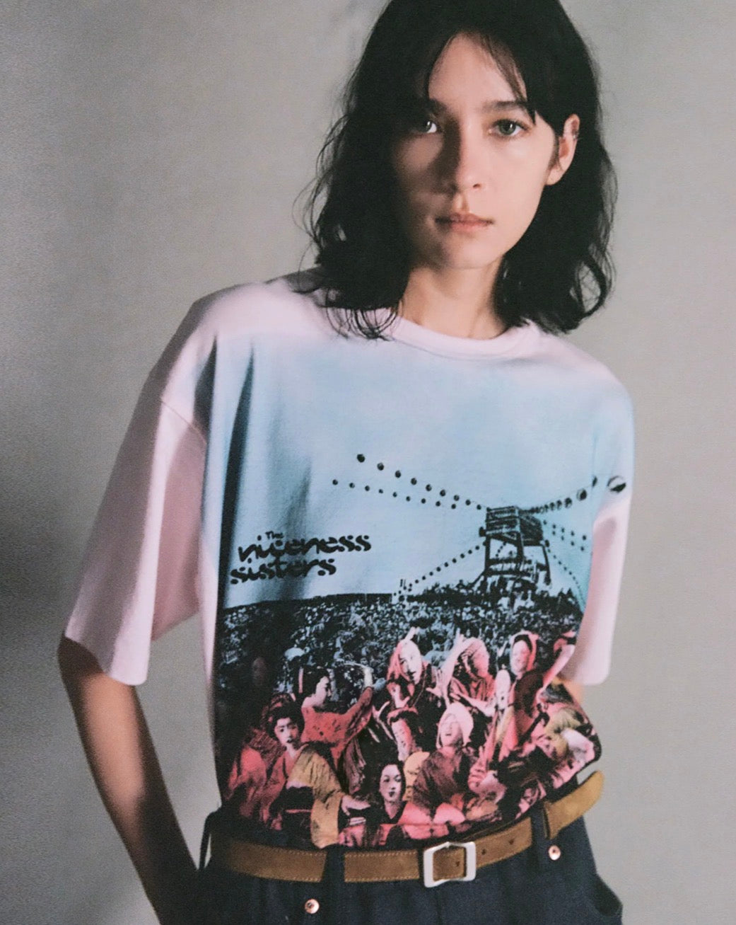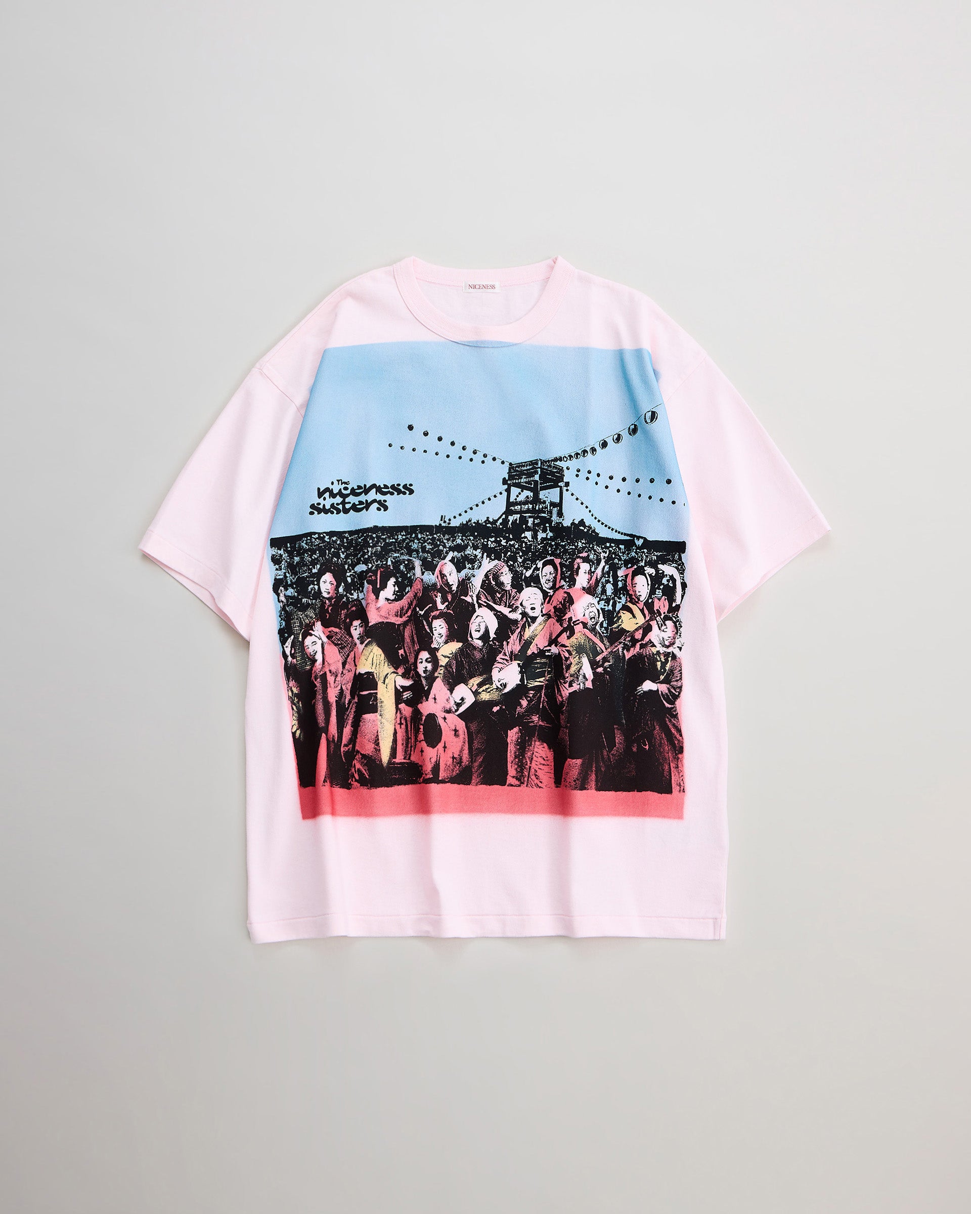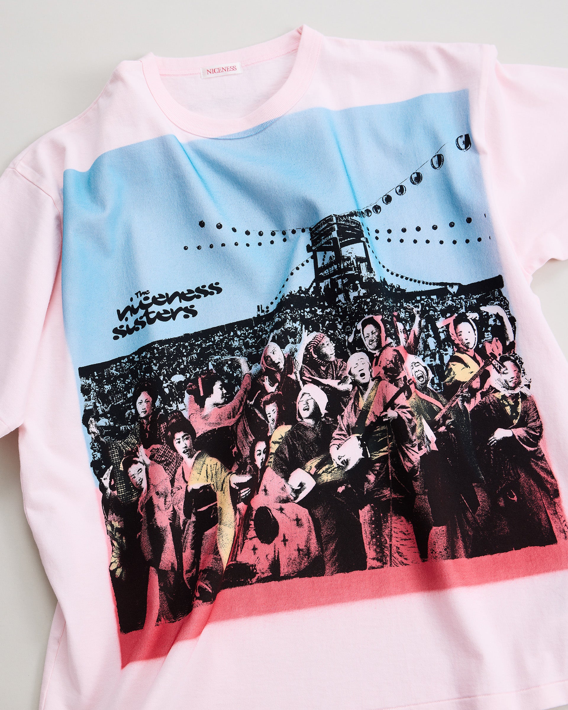 着⾊部分はエアブラシによるステンシルプリントで⼀点⼀点職⼈の⼿作業にて施されています。幕末〜明治期の「横浜写真」から着想を得て⾊彩を甦らせるという試み。記憶と現実が交差する夏の⾵物詩のような⼒強きTシャツ。