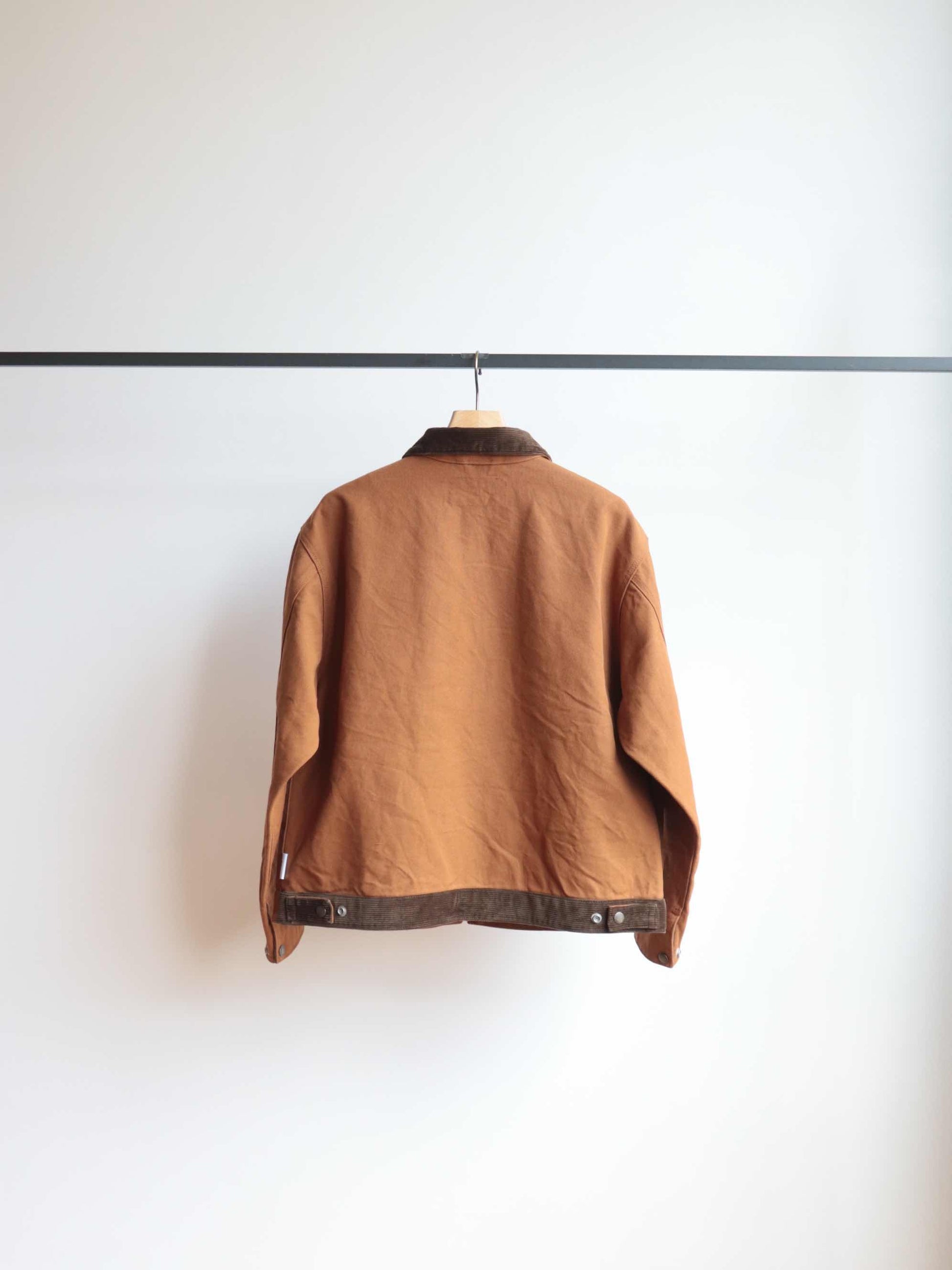 襟、ポケット口布、背面の腰帯、袖口の内側にコーデュロイを切り替えた仕様。
