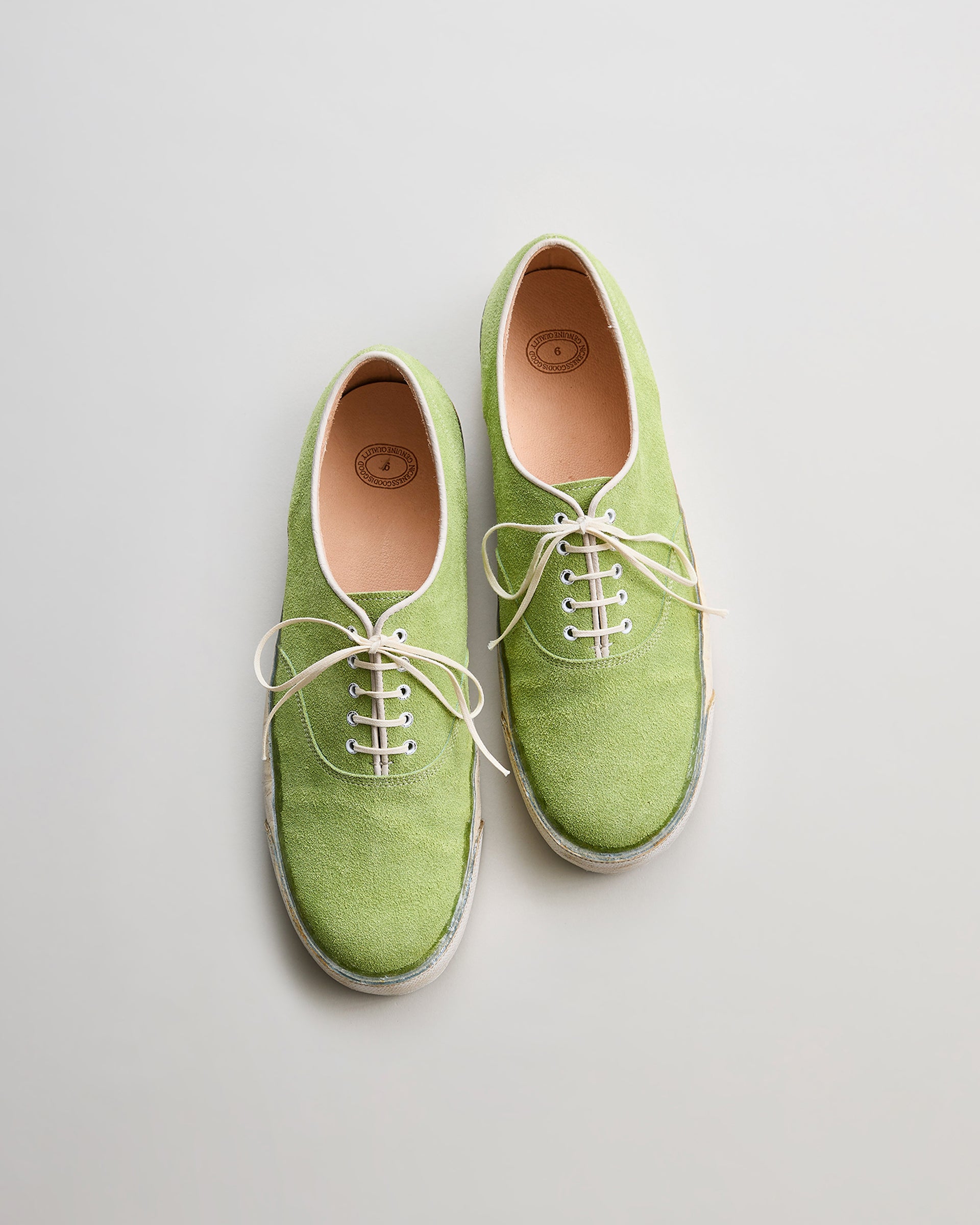USミリタリーのボートシューズとジョージア・オキーフの汚れたコモドールをイメージし、ベロア、ピッグヌメ、ステアなど多様な⾰素材と伊SVIG社の合成ゴムソールを組み合わせています。
