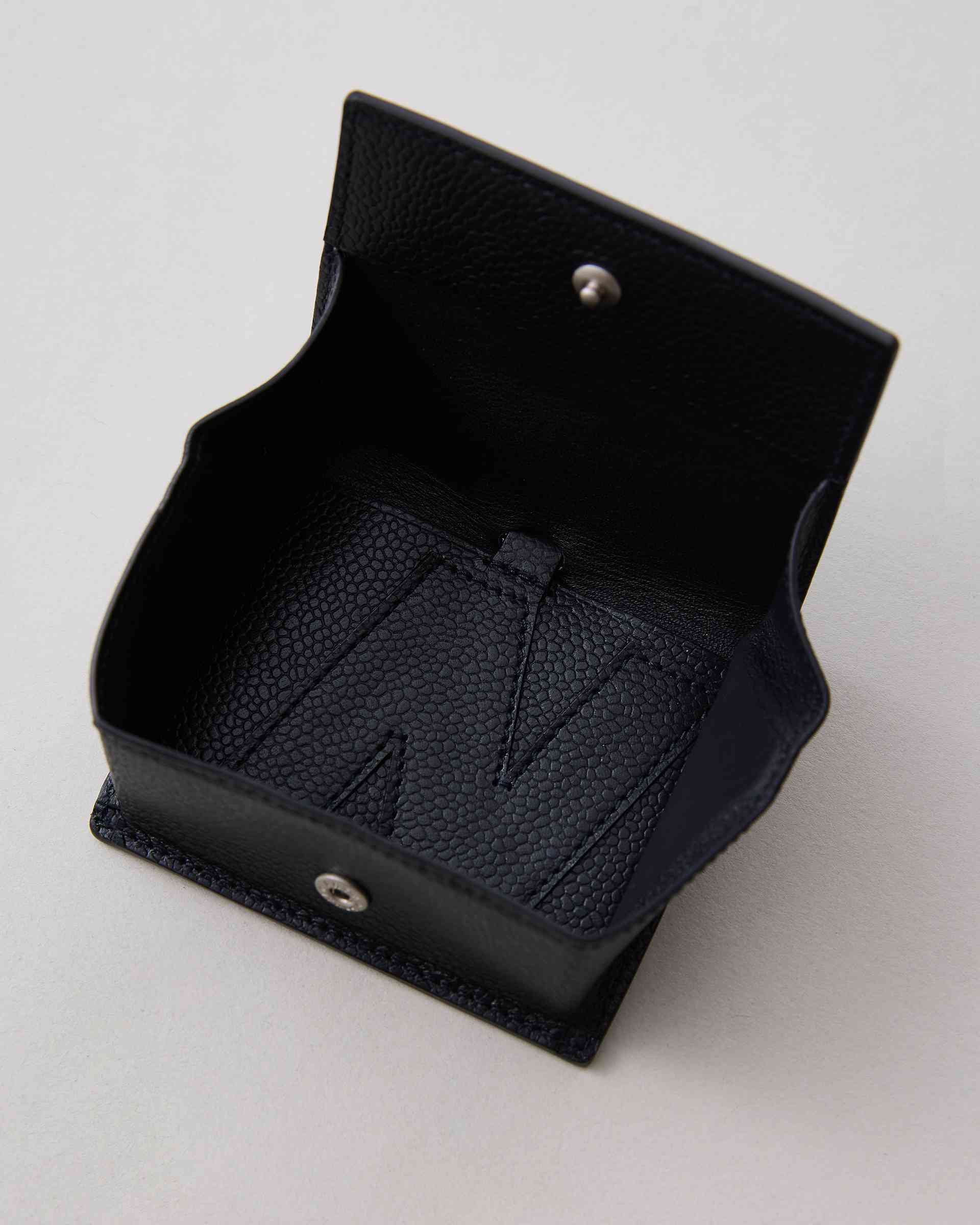 HAAS社のアルザスレザーを使用したコインケース。ブラウンカラーには仔牛皮革のベジタブルとミネラルのハイブリッド鞣しを使用し、ブラックカラーにはキャビアに似た質感の「ブラックダイヤ」と呼ばれる特徴的なシボ感のあるレザーを採用しています。