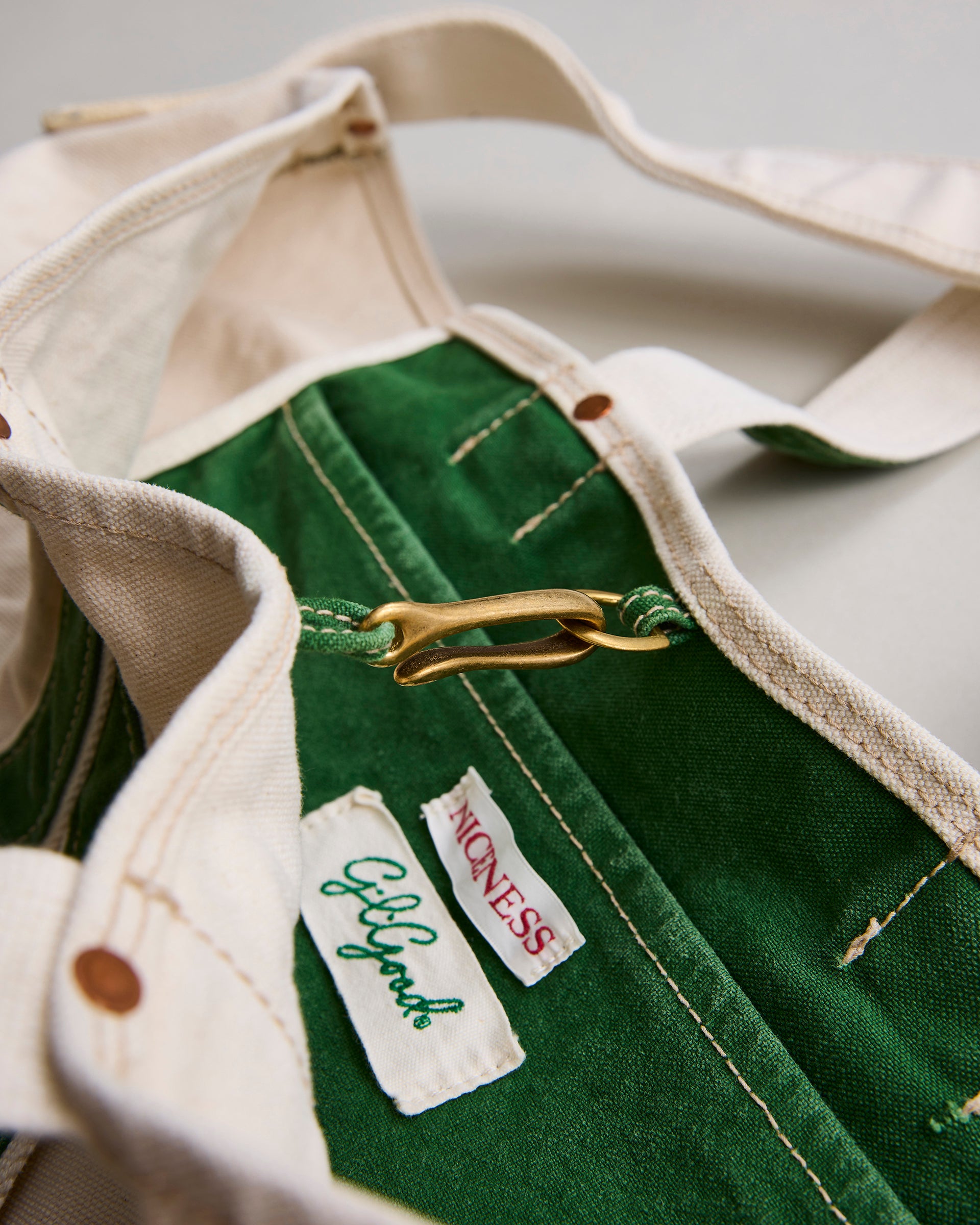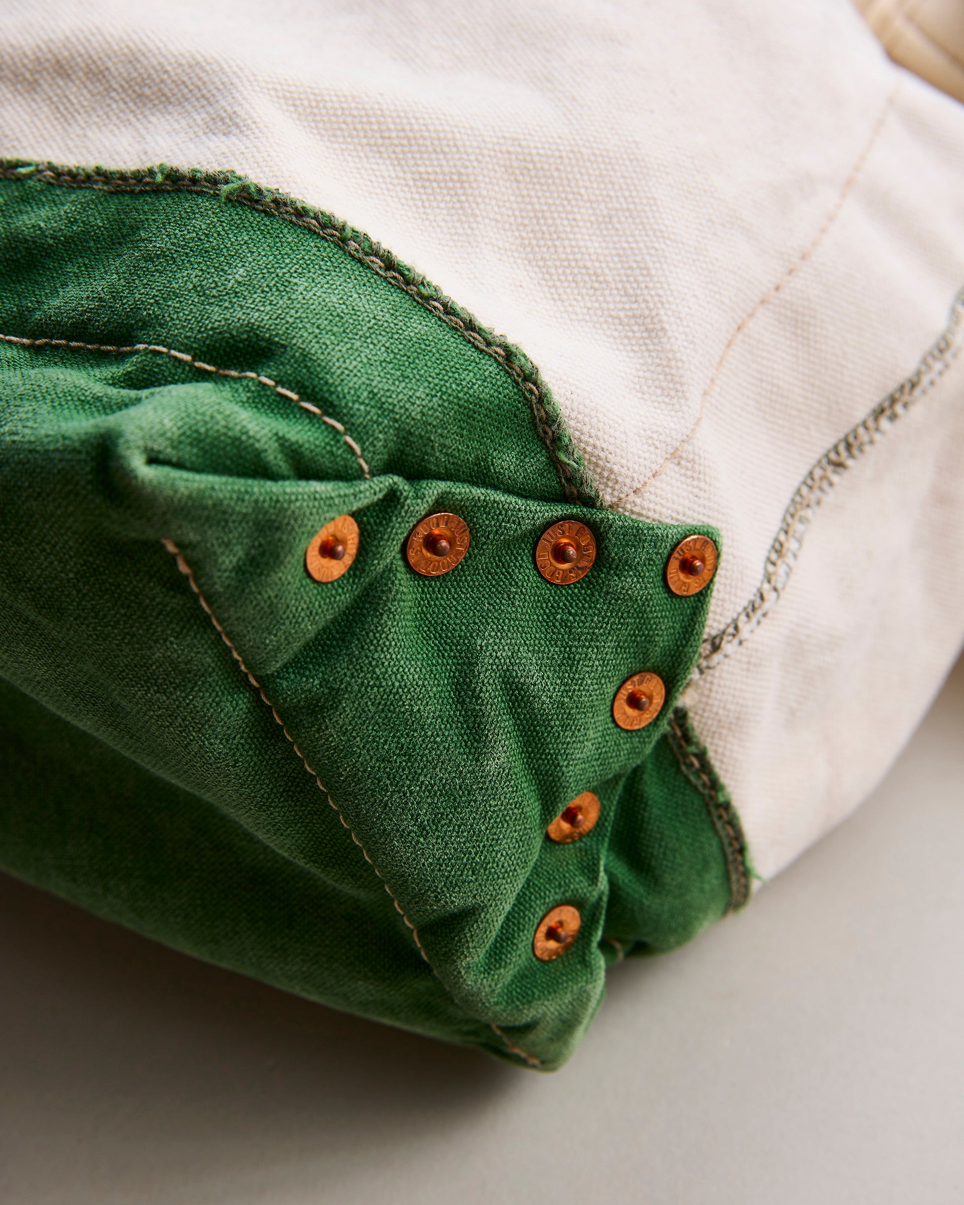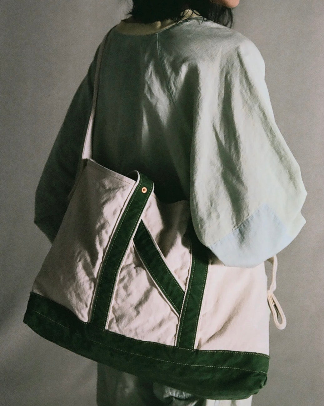 1920〜1950年代に登場した⽶国のツールバッグからインスピレーションを得てデザインしたショルダーストラップ付きトートバッグ。⽣地はシャトル織機で織り上げられた6号と10号帆布にワッシャー加⼯を施し、製品後にストーンウォッシュで仕上げてヴィンテージライクなアタリを演出しています。