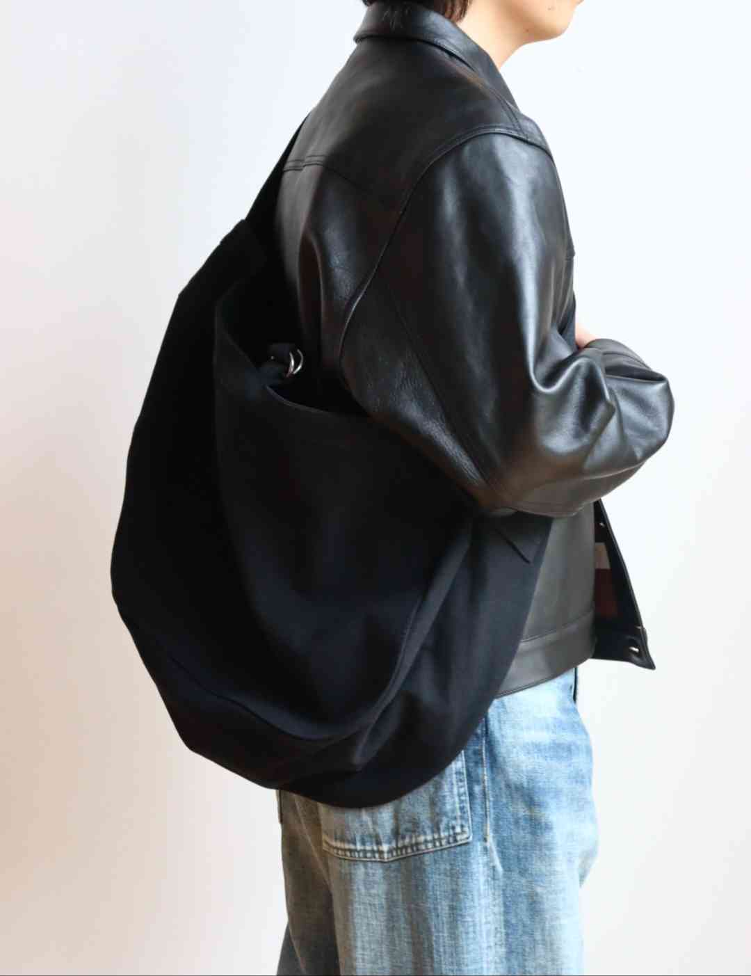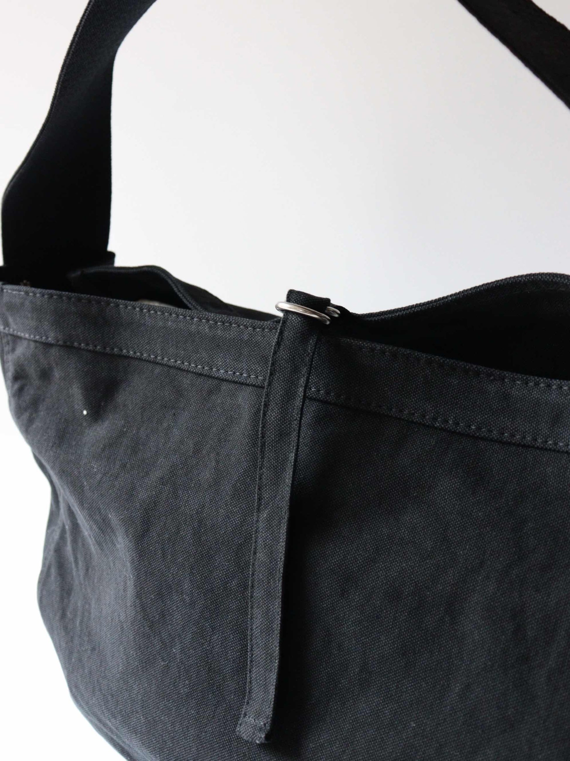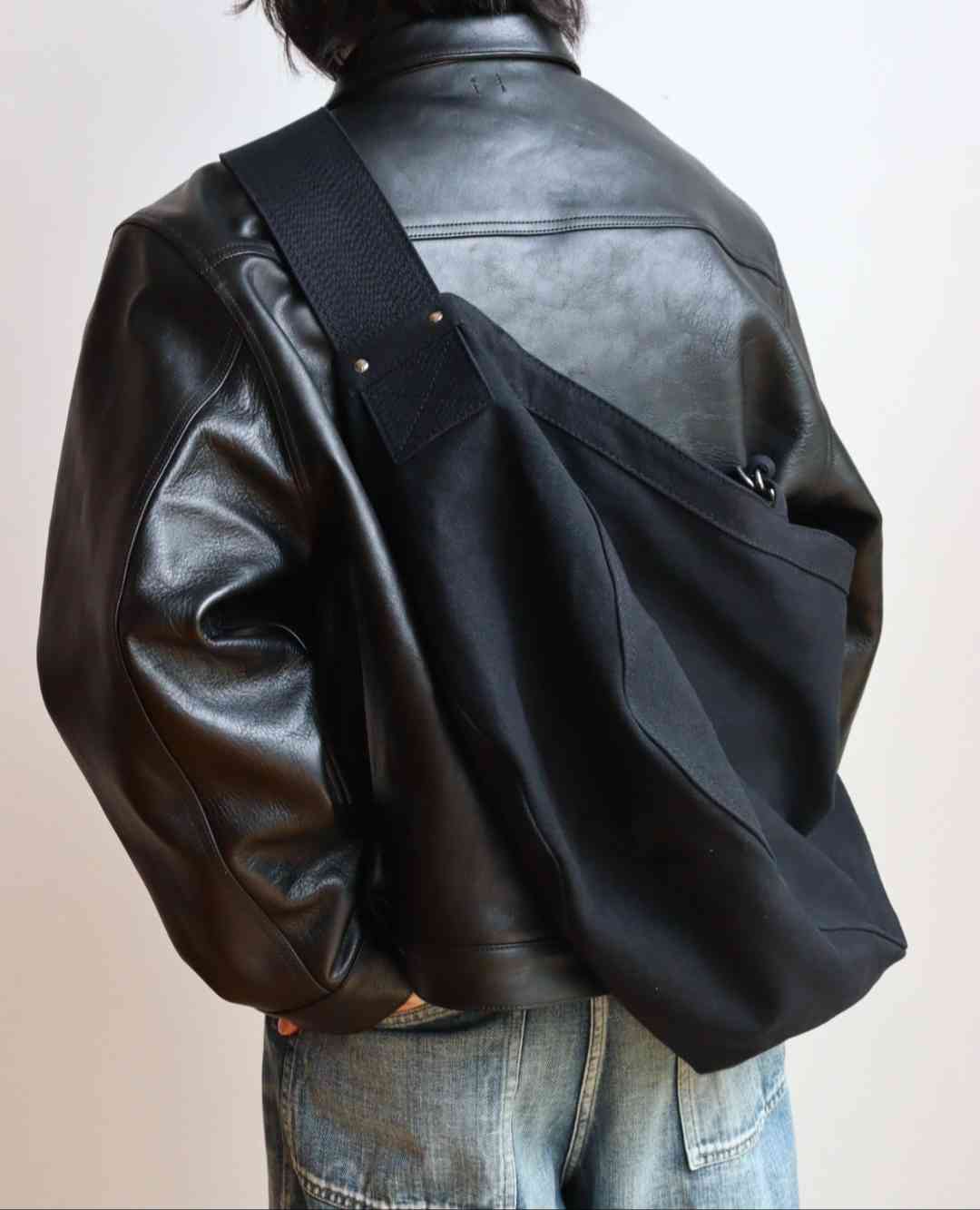 肩への負担を軽減する幅広のショルダーハンドルと、広いマチは当時の作りのまま、ショルダーハンドルの長さを短く調整し、ボディバッグのように再構築した。