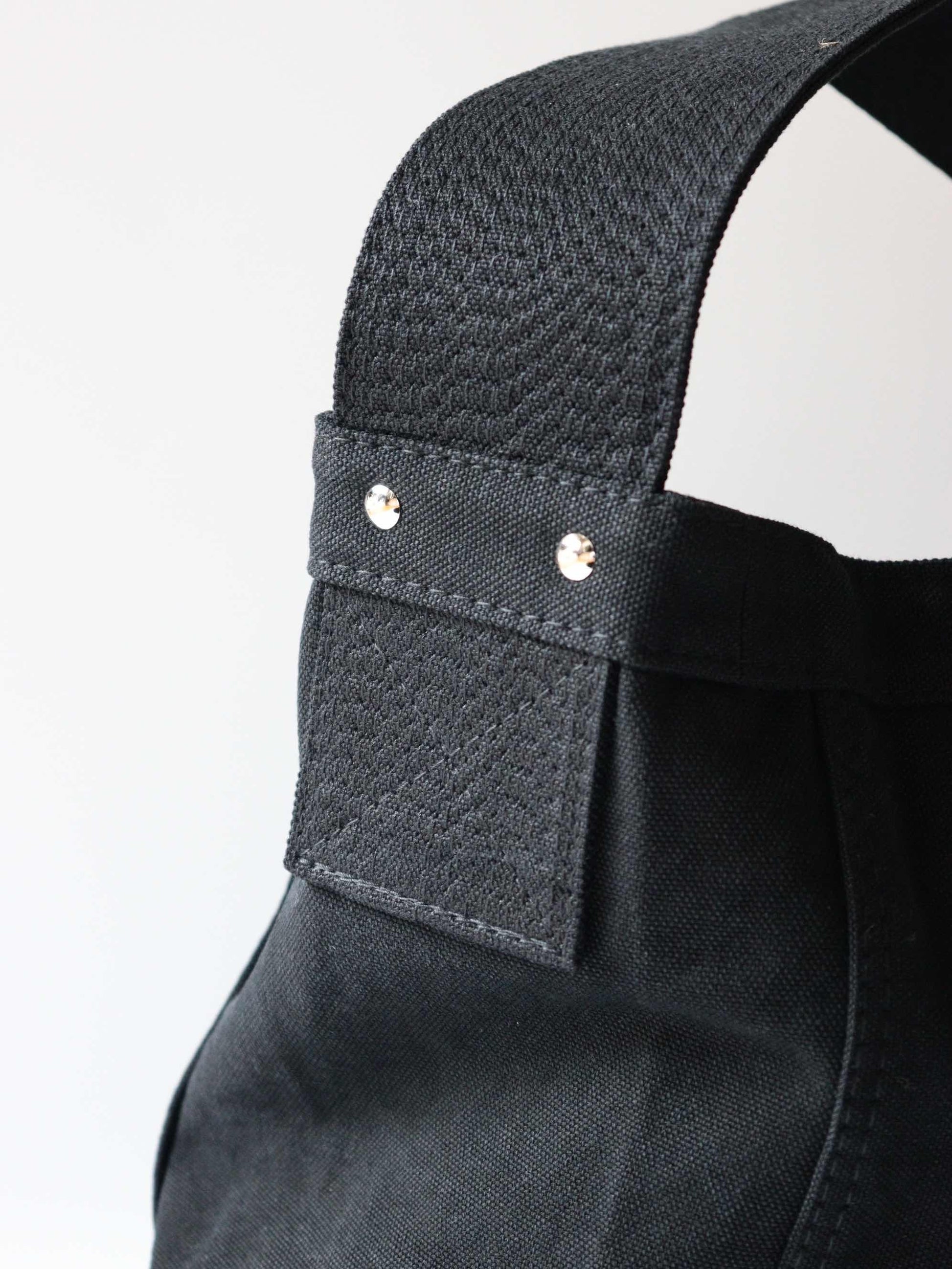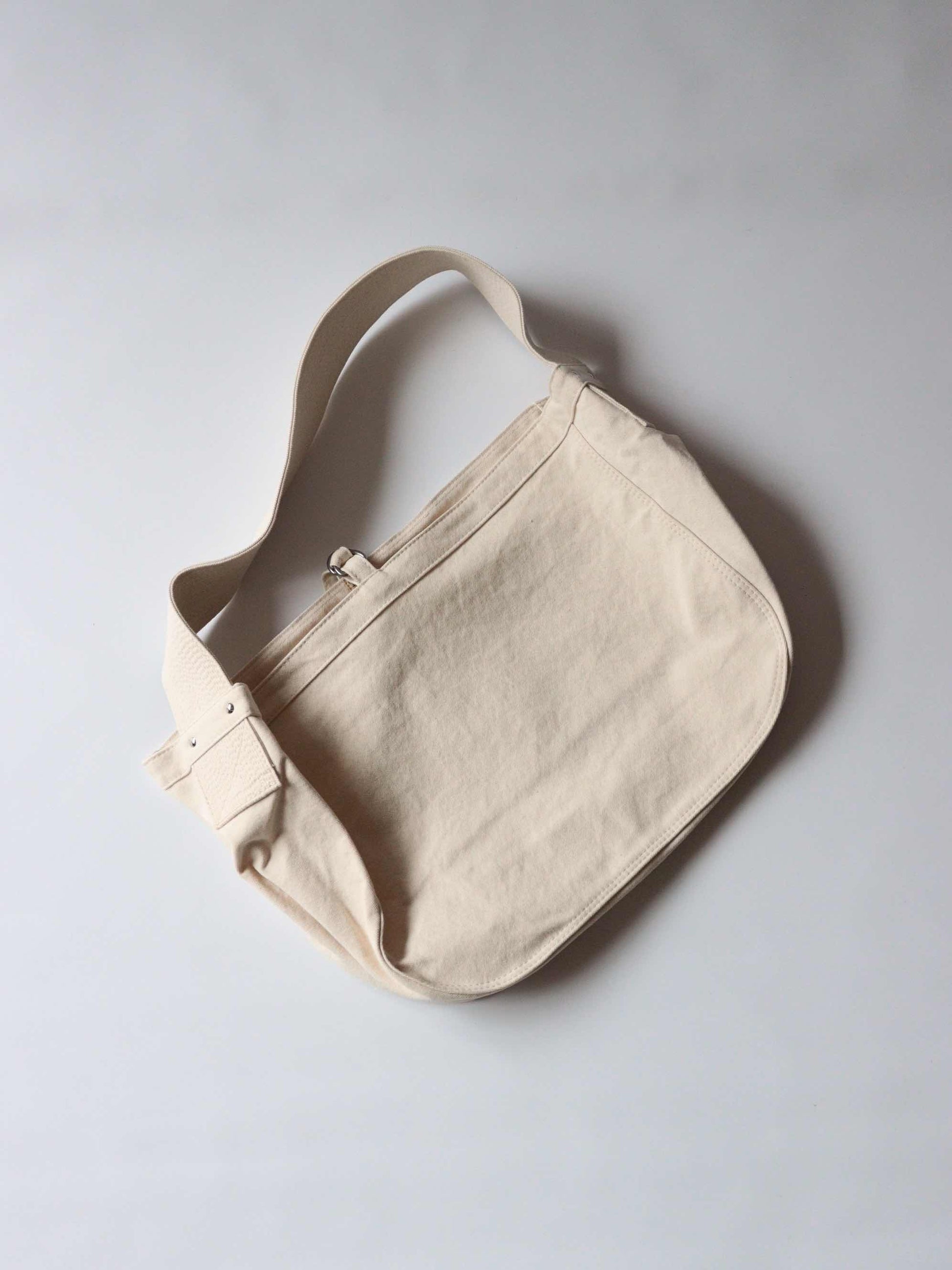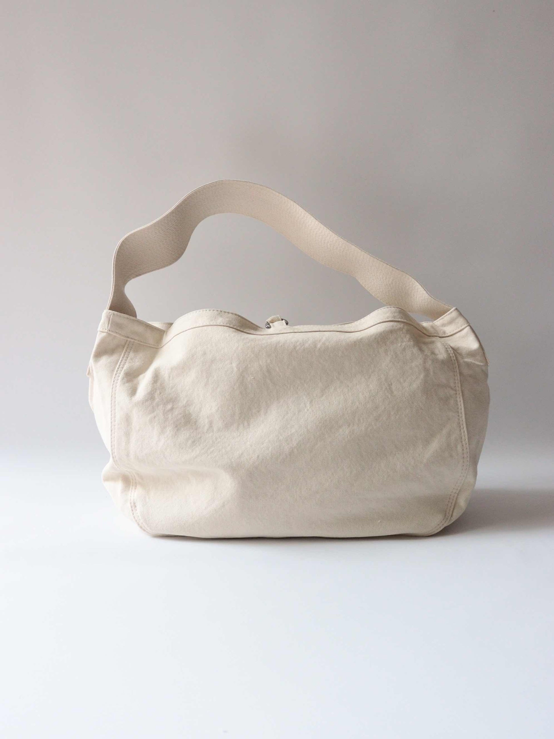 肩への負担を軽減する幅広のショルダーハンドルと、広いマチは当時の作りのまま、ショルダーハンドルの長さを短く調整し、ボディバッグのように再構築した。