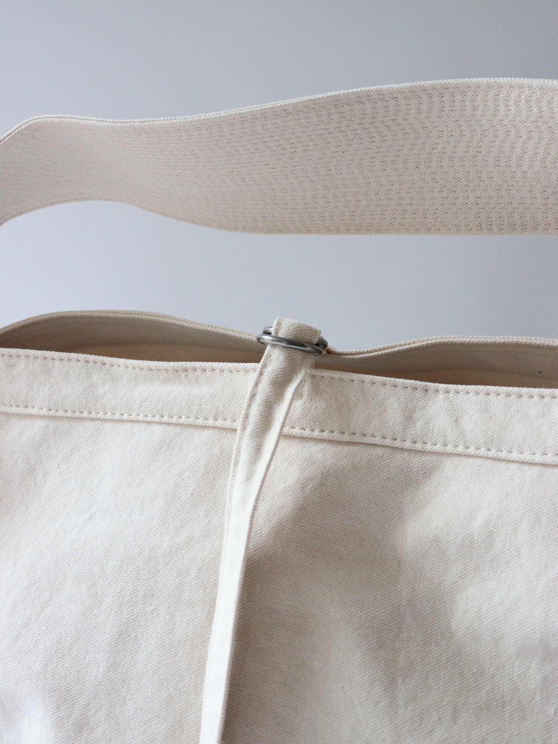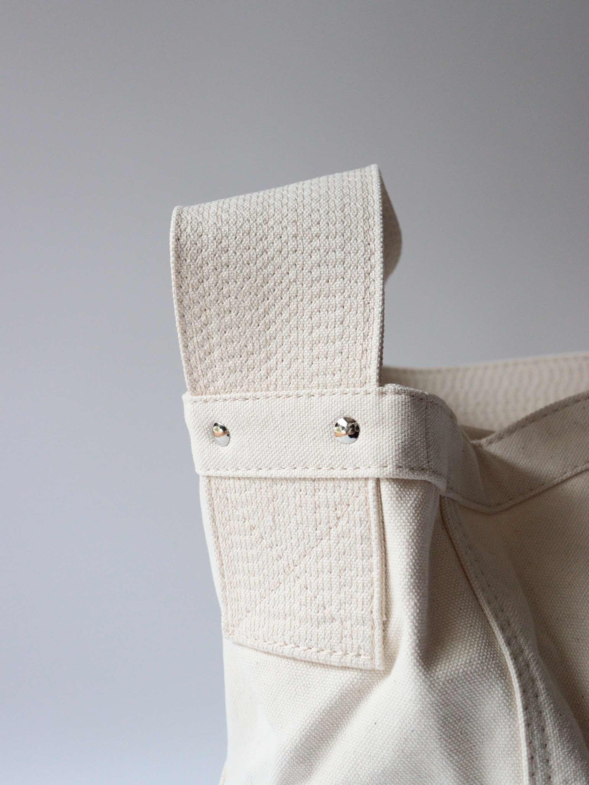 ショルダーハンドルのステッチを敢えてランダムな間隔で入れ、ヴィンテージの無骨な作りを表現。古いタイプのニュースボーイバッグに見られる、リベット留めによるディティールや、縫製などの仕様も忠実に再現した。 ウォッシュ加工を施したヴィンテージ調のキャンバス地と鉄製のパーツを使用。