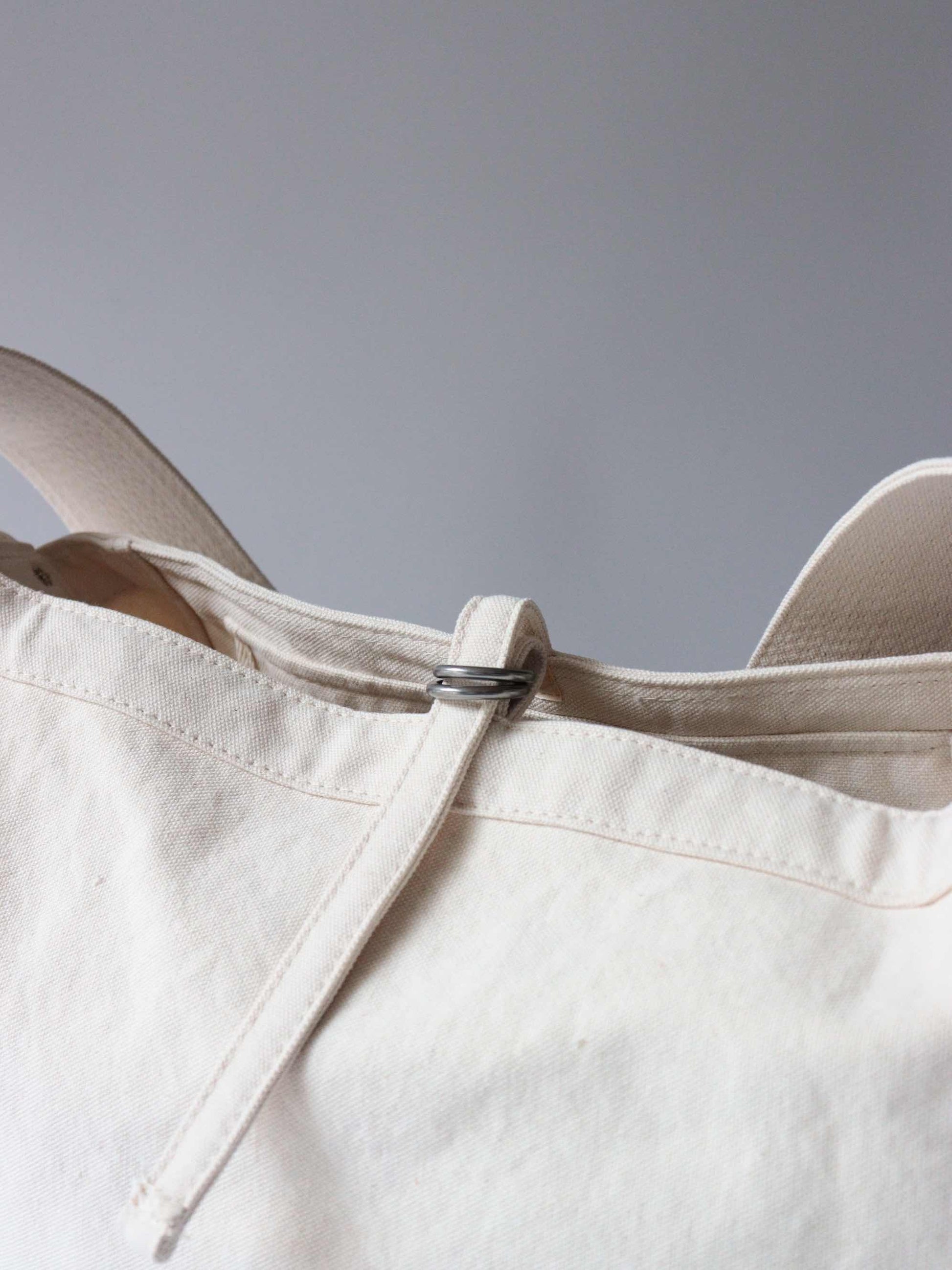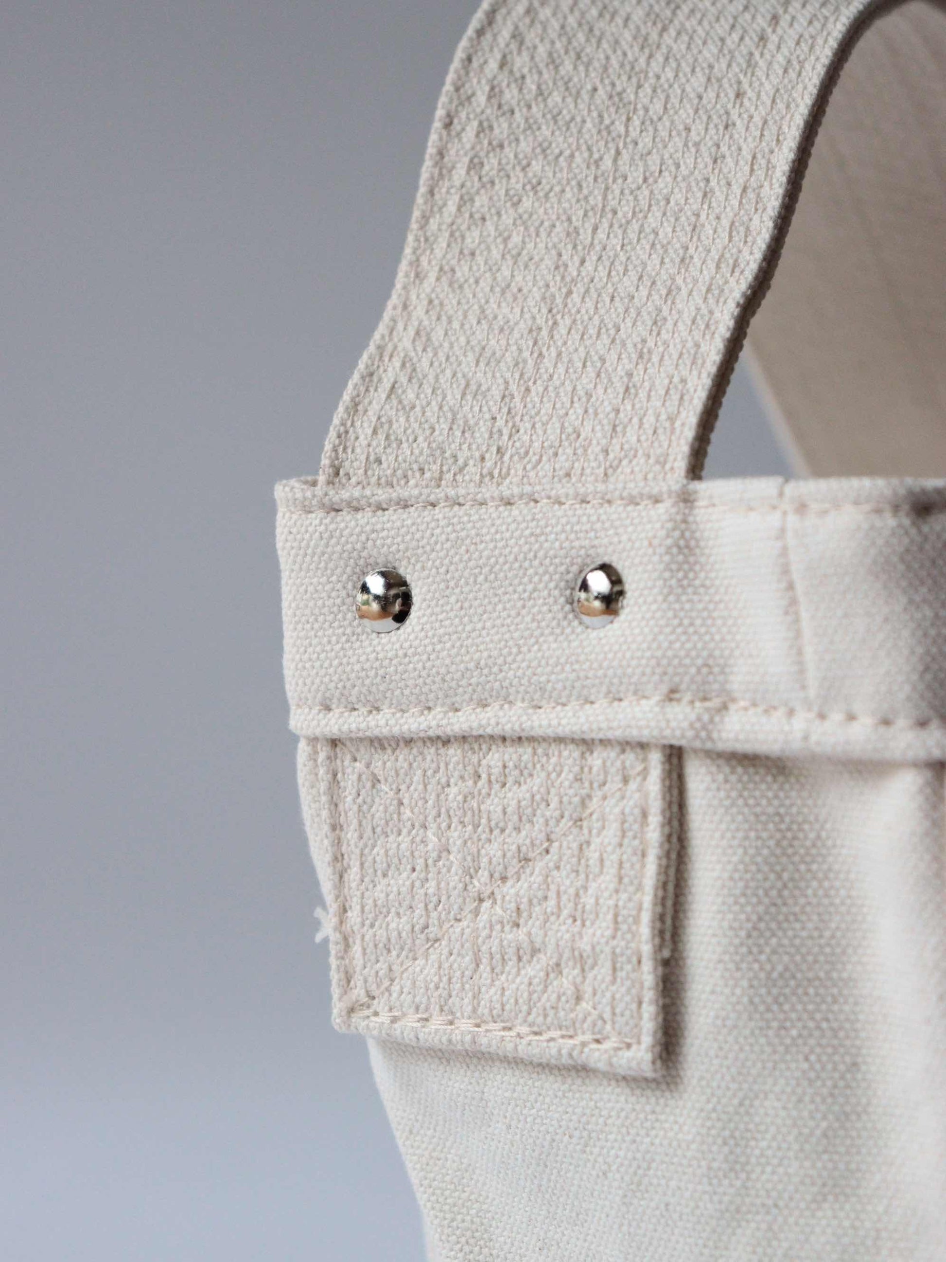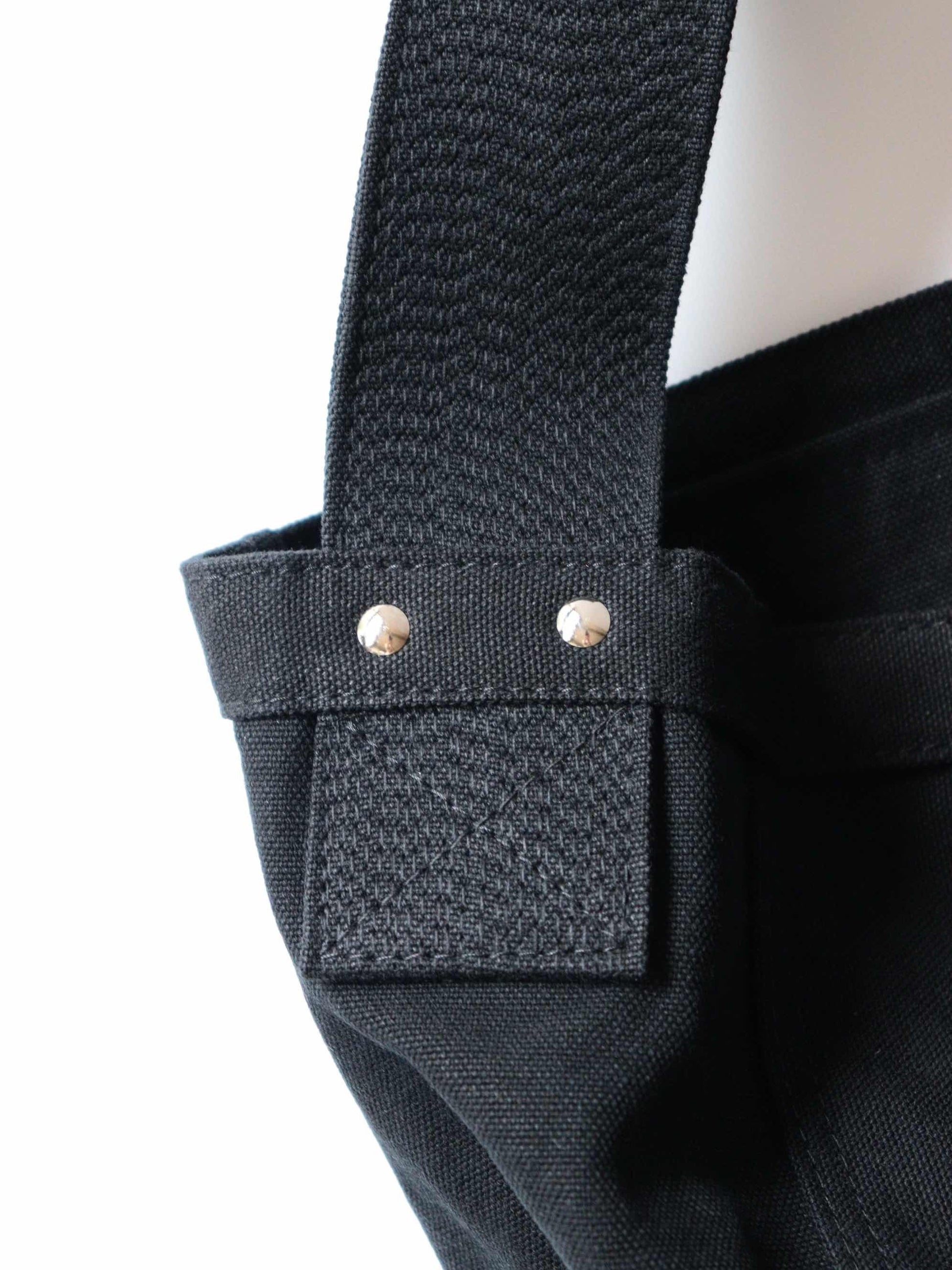 ショルダーハンドルのステッチを敢えてランダムな間隔で入れ、ヴィンテージの無骨な作りを表現。古いタイプのニュースペーパーバッグに見られる、リベット留めによるディティールや、縫製などの仕様も忠実に再現した。ウォッシュ加工を施したヴィンテージ調のキャンバス地と鉄製のパーツを使用。