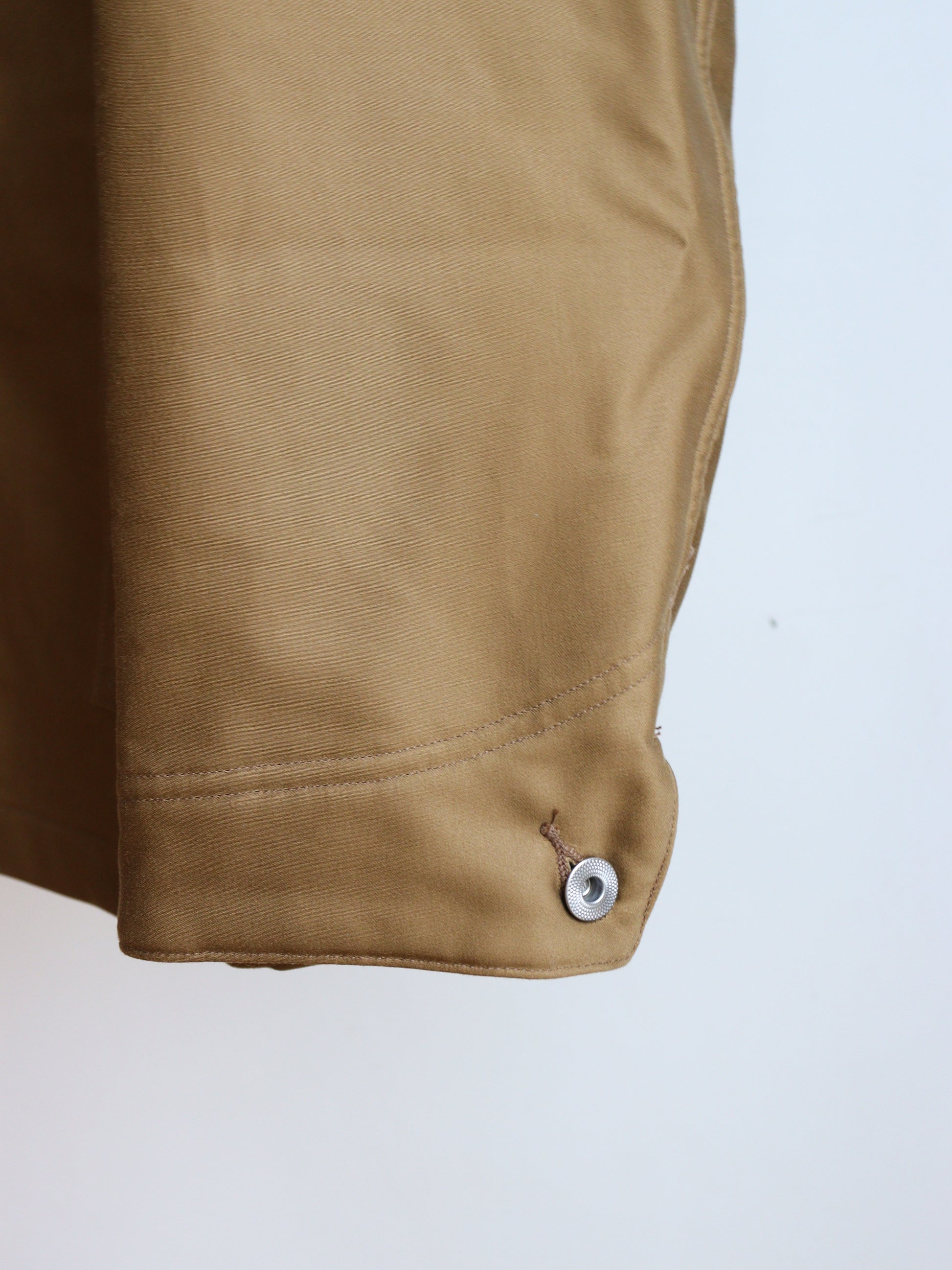 素材はヨコ糸にGIZAコットンを使用し限界まで打ち込んだモールスキン生地を使用。通常ここまで打ち込むと生地が堅くなりやすいが、GIZAコットンを贅沢に使用することにより柔らかい仕上がりと光沢感が実現できた。
