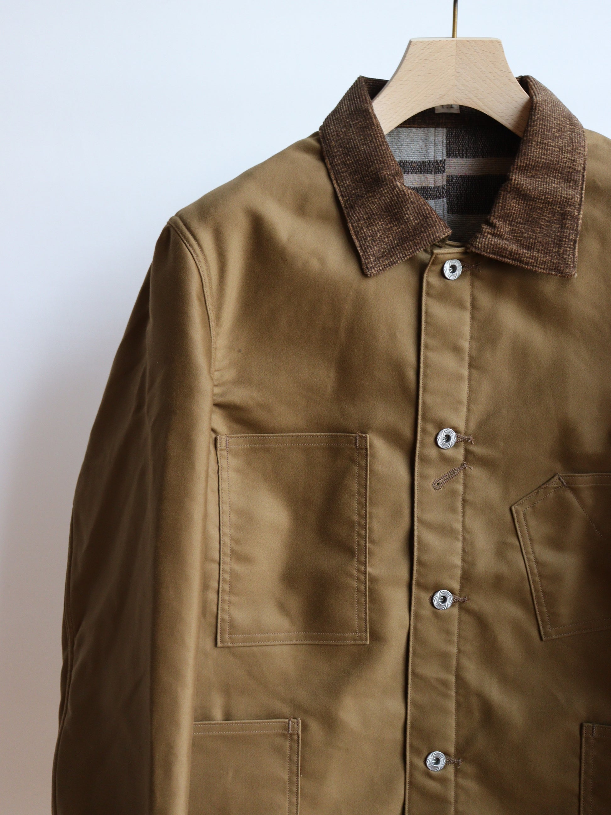 ライニングには再生ウールをあまく織ったオリジナルブランケット生地を、衿には「ツィーデュロイ」を再現したオリジナルプリント生地を使用している。