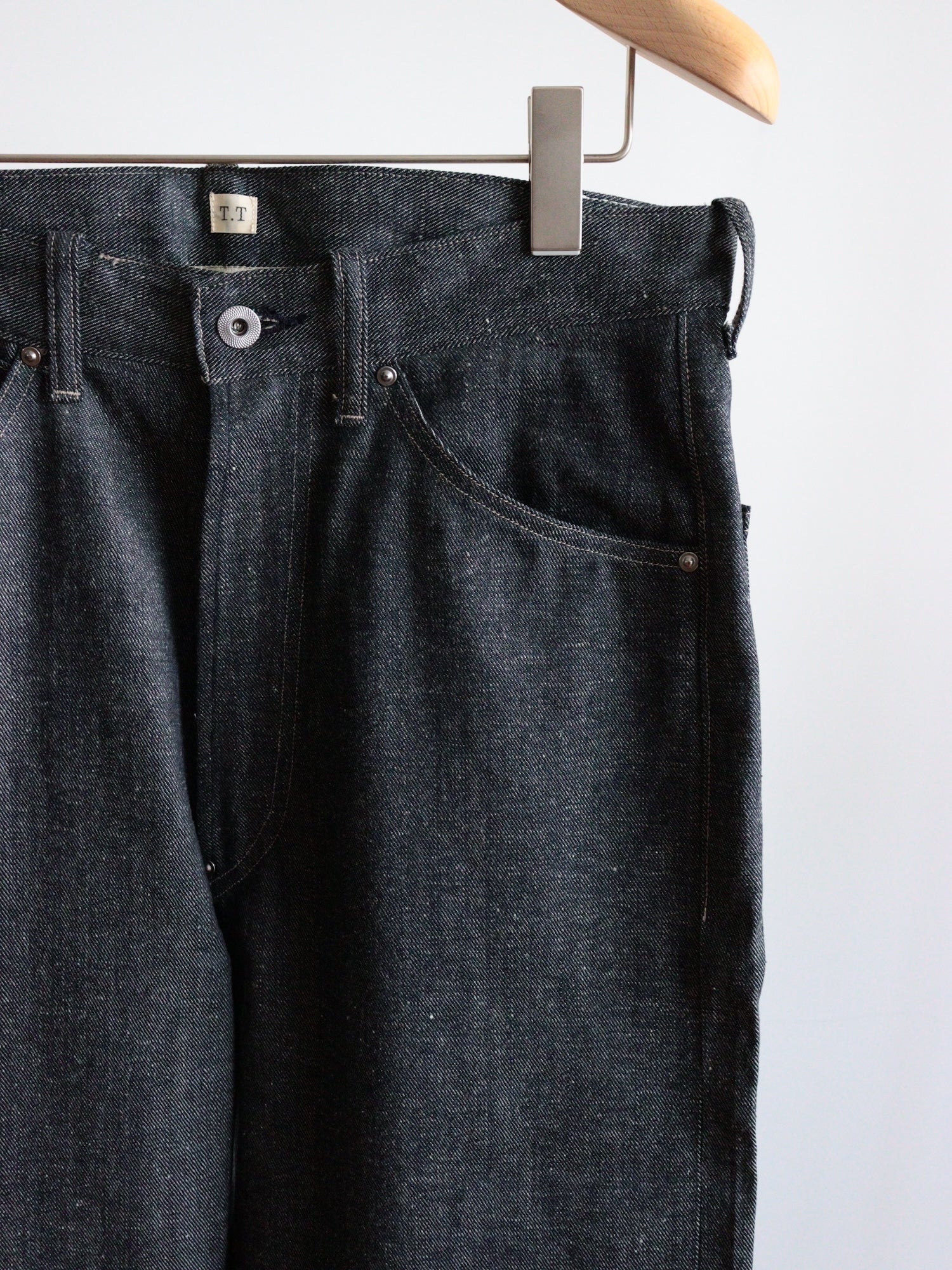コインポケットではなく流し込みのポケットにするなどペインターパンツのデイティールを取り入れている。薄いグレーとネイビーの配色ステッチ使いで、ステッチワークに細心の注意をはらい当時の粗い縫製を再現した。