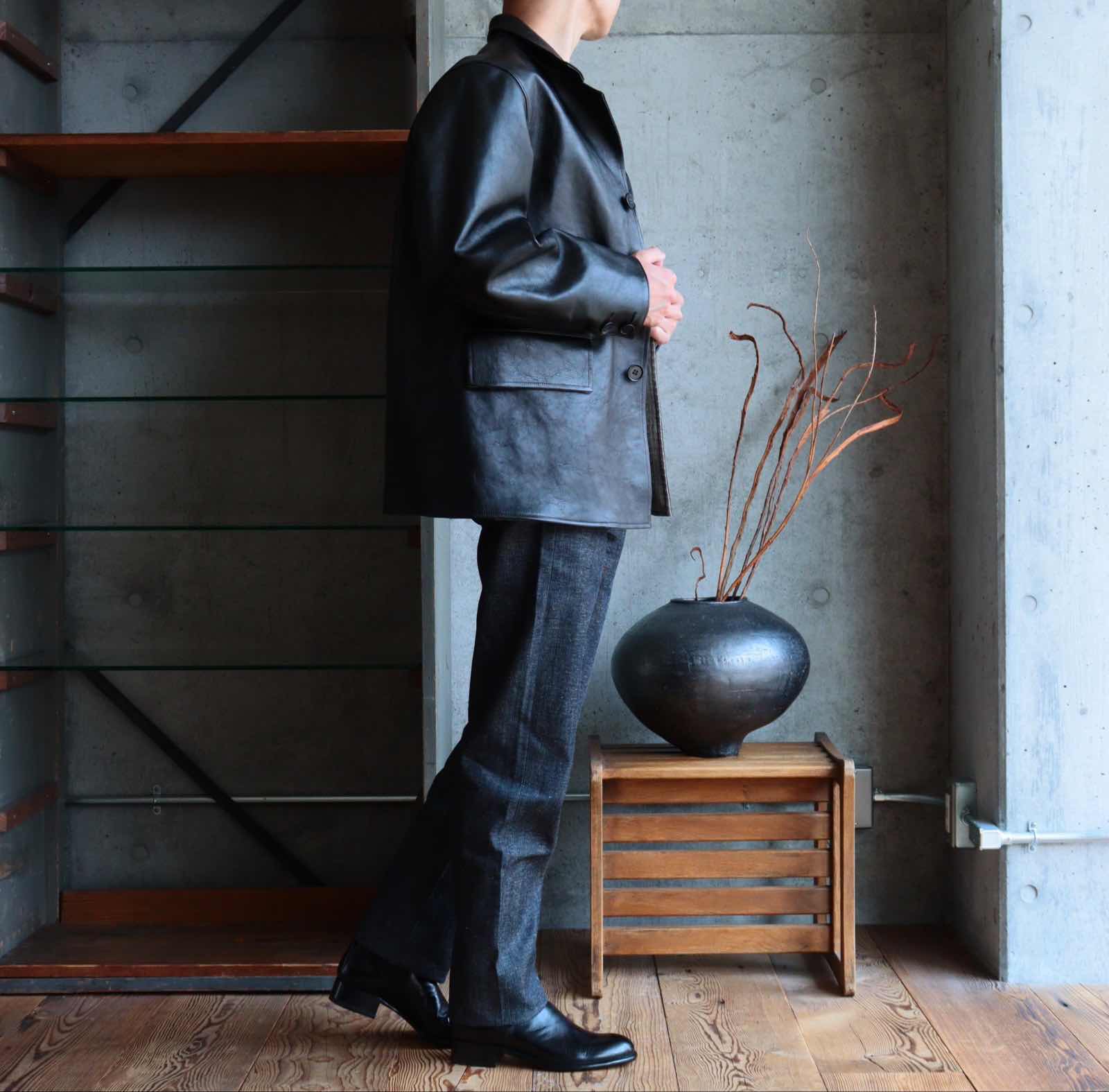 このシーンズは股上がかなり深く、わたりから福まで真っ直ぐに落ちた太めのシルエットが特徴。丸くカーブしたフロントのポケットに、明き部分に付いたリベット、後ろ側についてあるバックルパックなど残すべき部分は残した設計となっている。