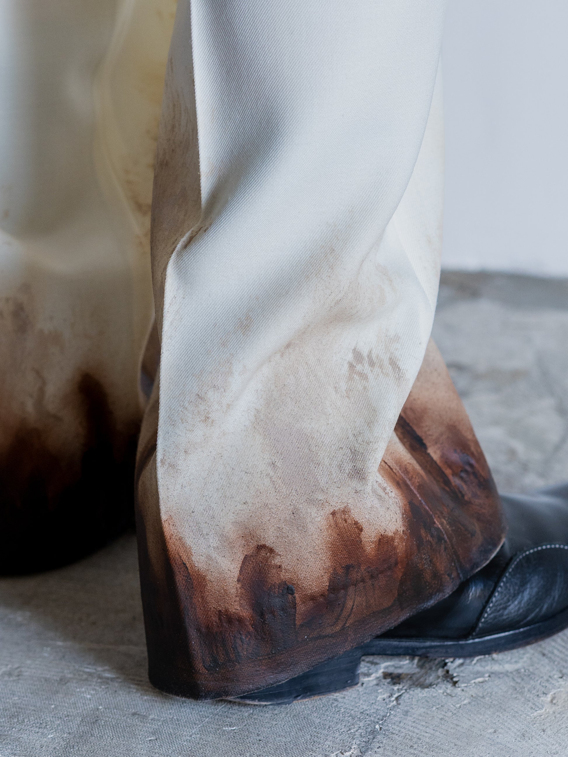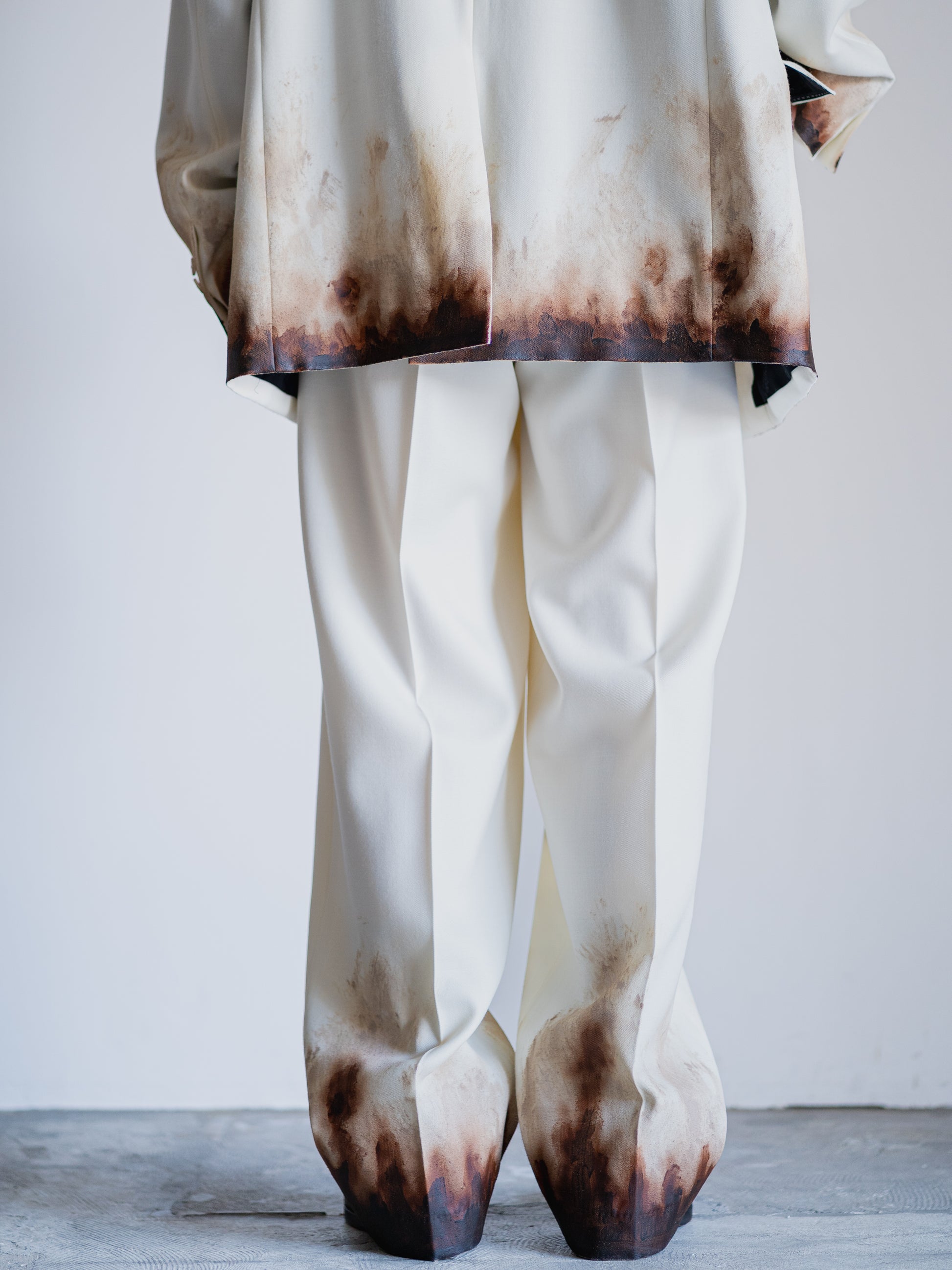 TAILORED TROUSERS MADE FROM THE SAME DENSE YET SOFT SUIT FABRIC AS THE JACKET.AIRBRUSHED AND HAND-PAINTED MUD STAINS MARK THE HEMS, WHILE A VEGETABLE-LIKE EMBROIDERED CHARACTER HIDES IN THE BACK POCKET. CLEAN IN FORM, RICH IN FABRIC—AND STILL, IT CARRIES TRACES OF THE EARTH.