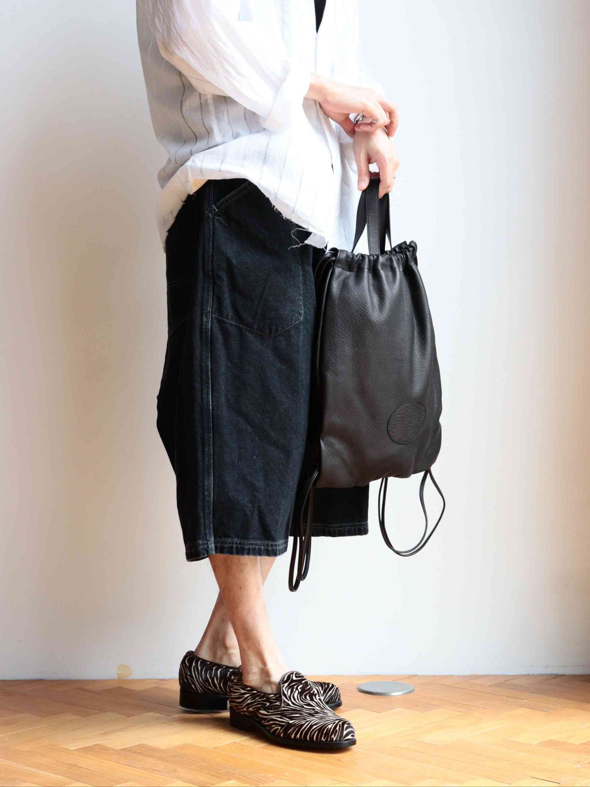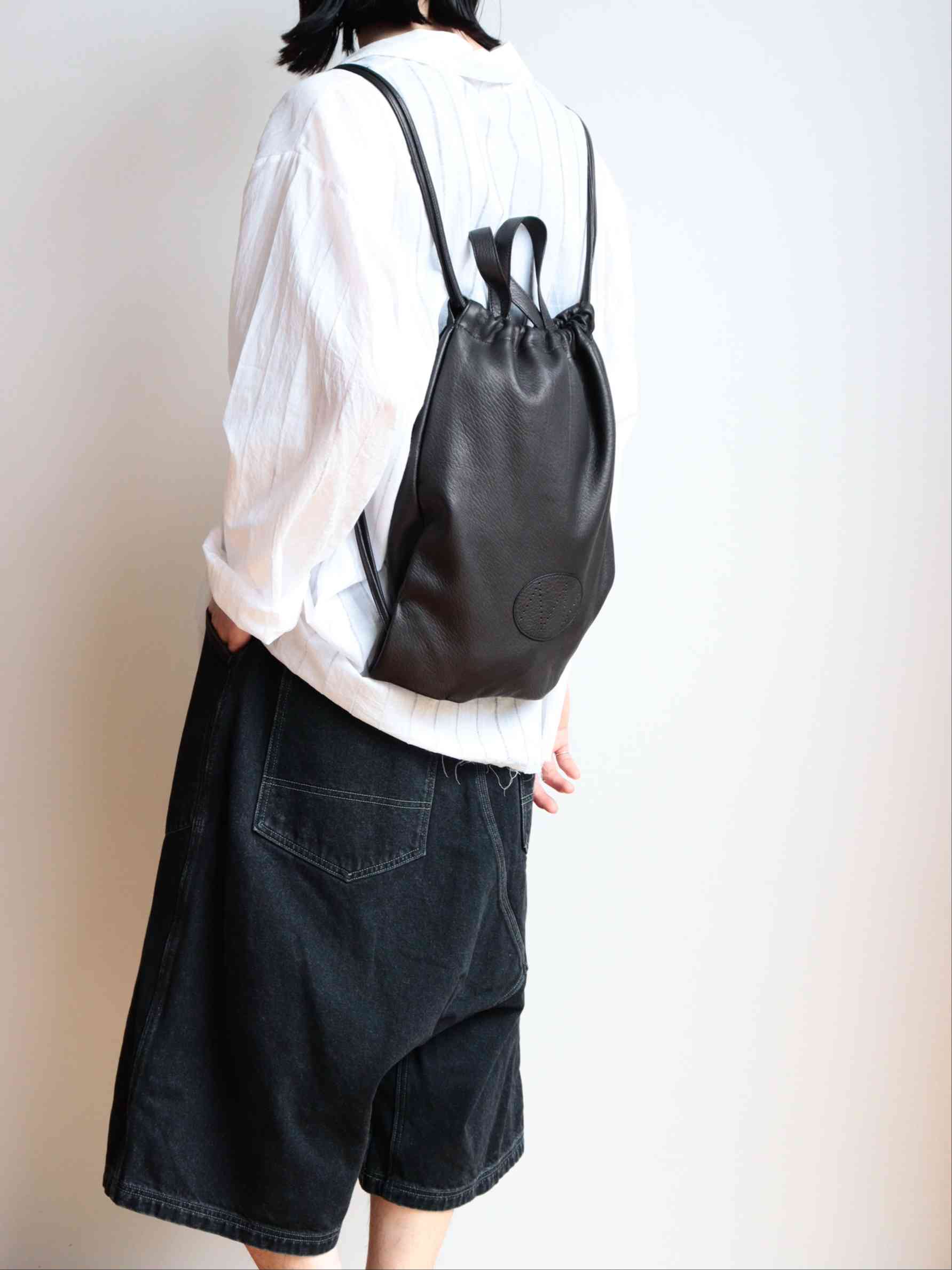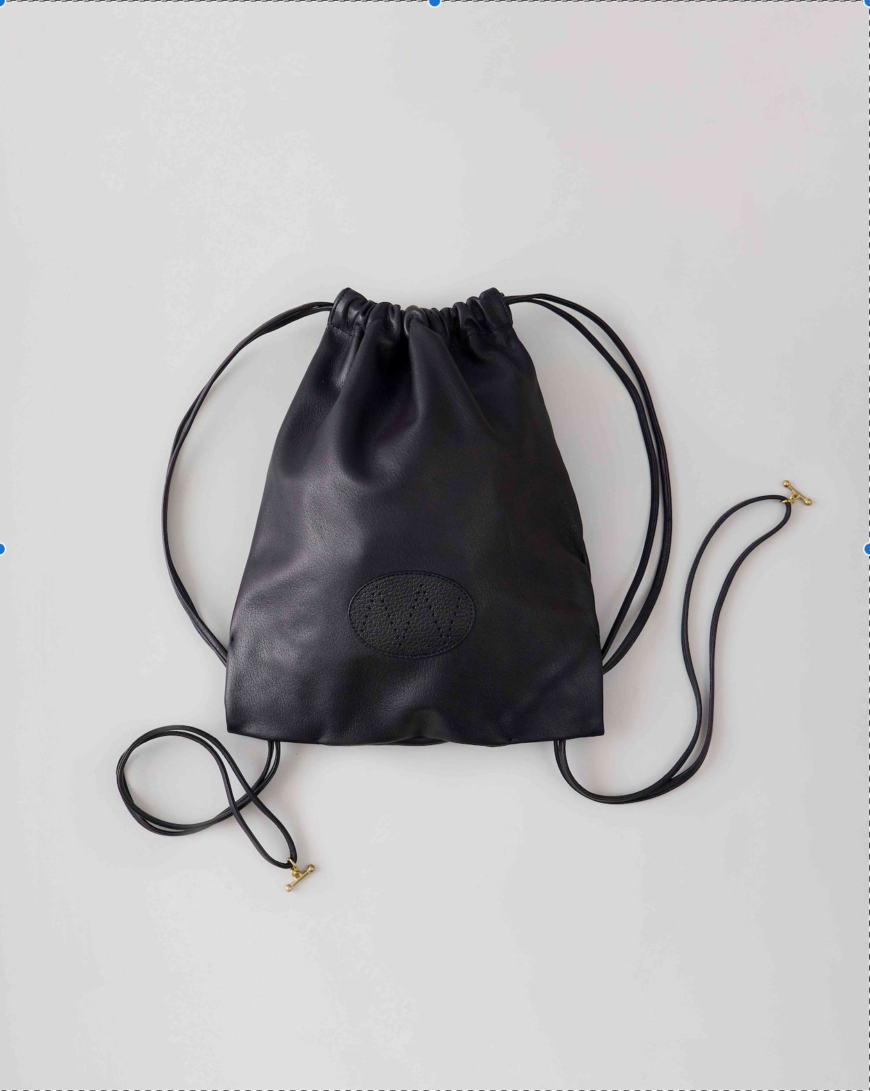 上質な鹿革から丁寧に作られた贅沢なナップサック。底の角に隠されたジョイントを外すことで入口の紐を絞ることができる2wayデザインです。