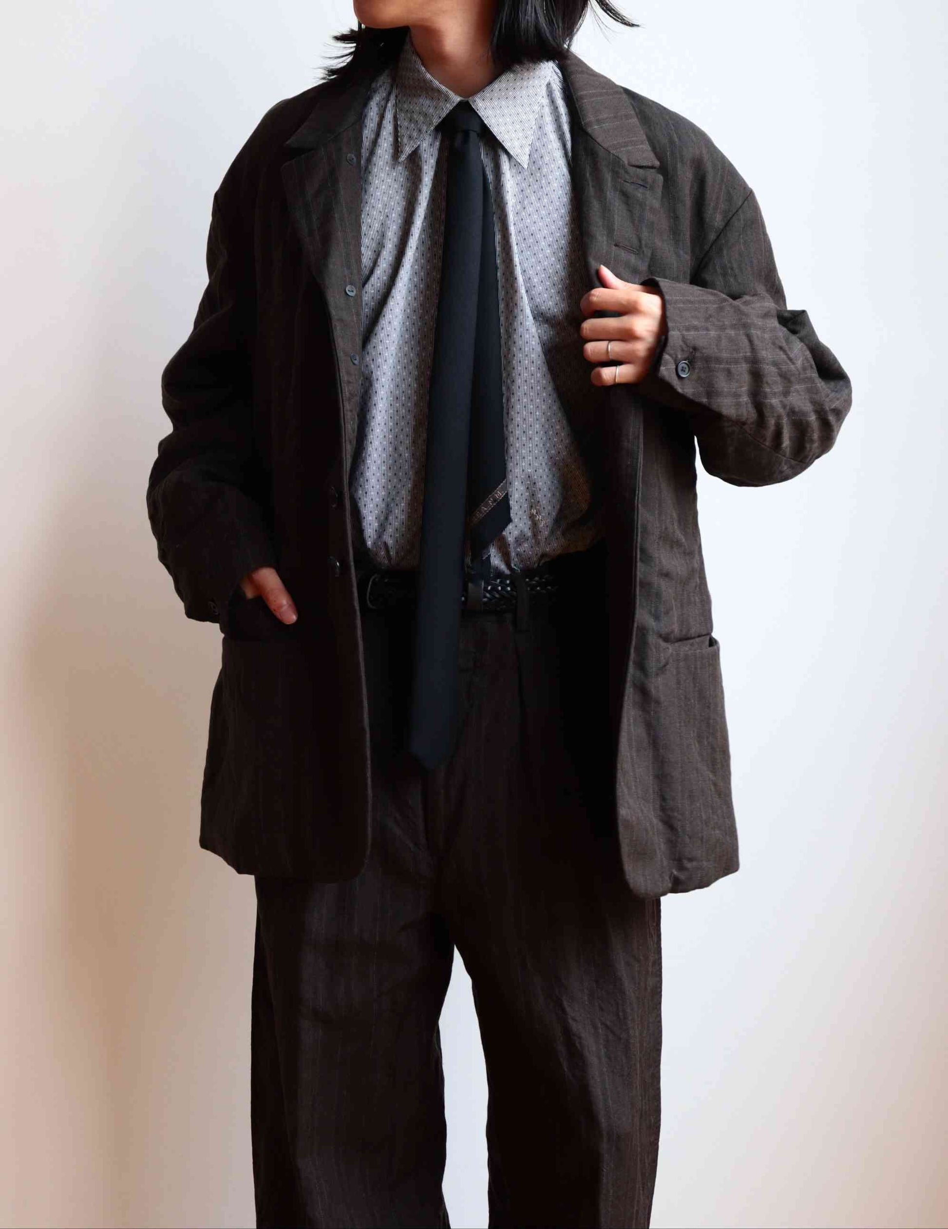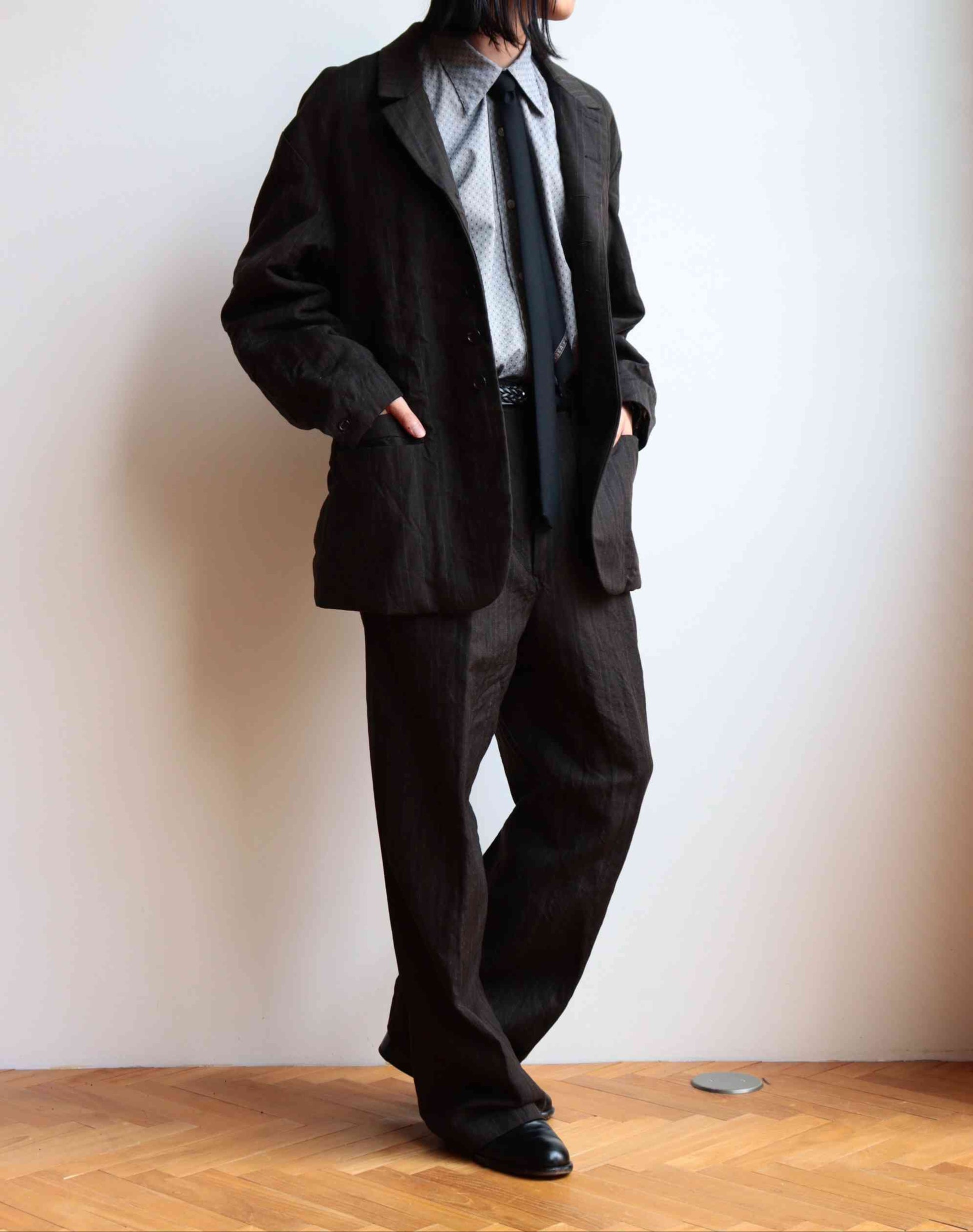 脇線は意図的に傾斜をかけ肩幅も⼤きめに設計。映画⾐装のような時代を超越した作りを⽬指して制作しました。