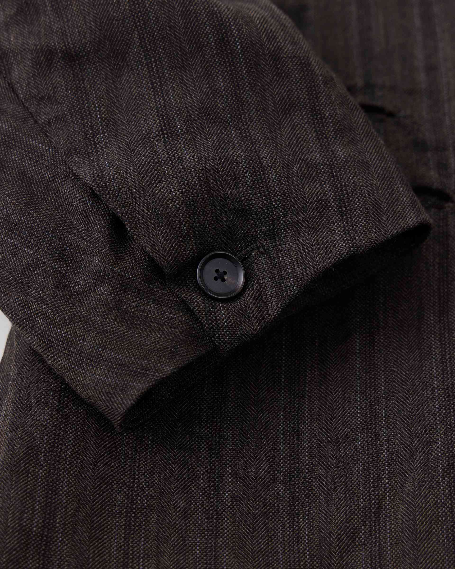 メリノウールのTOPカラーと先染めのブラックリネンを使⽤したストライプのアーミッシュジャケット。