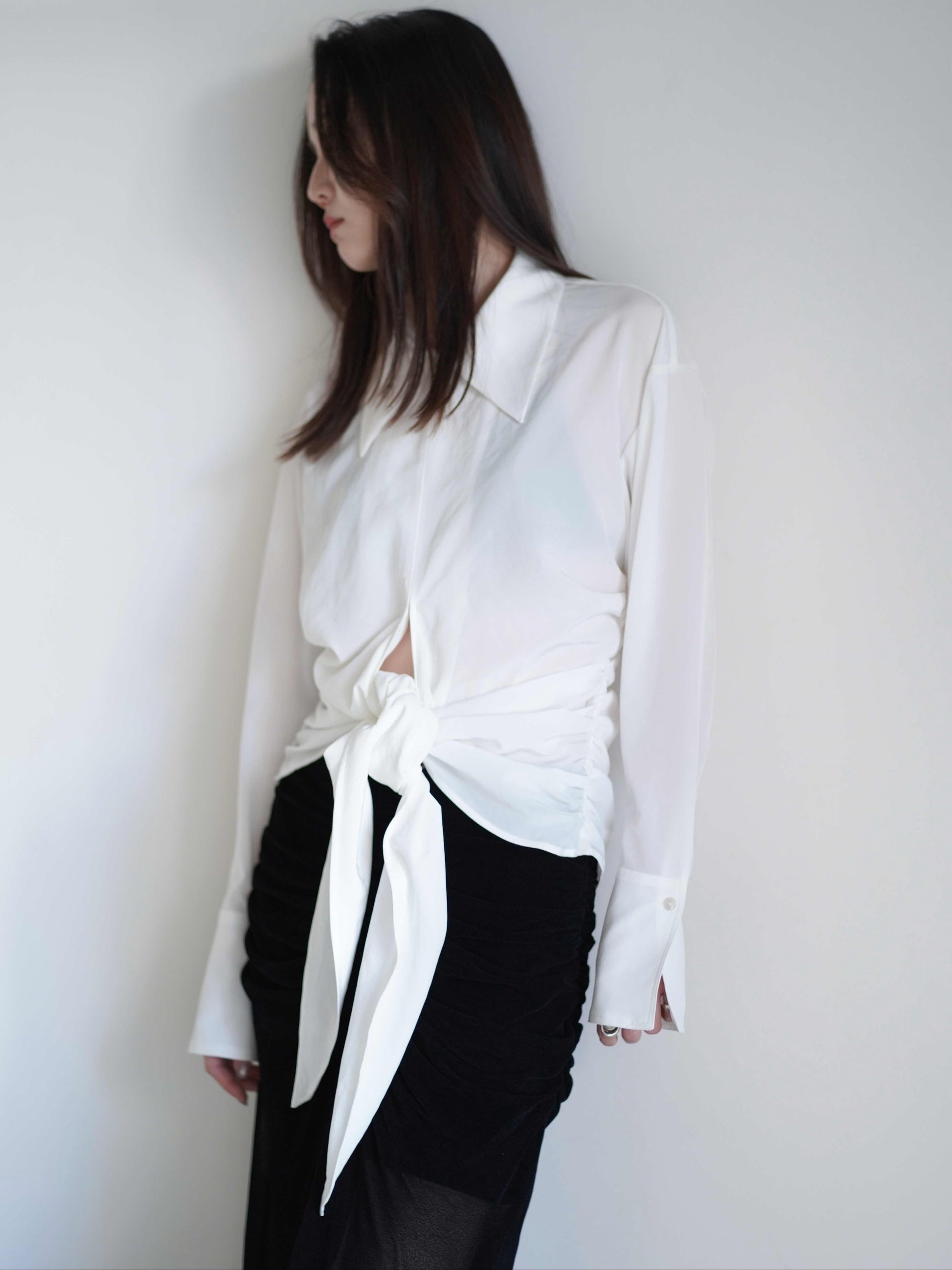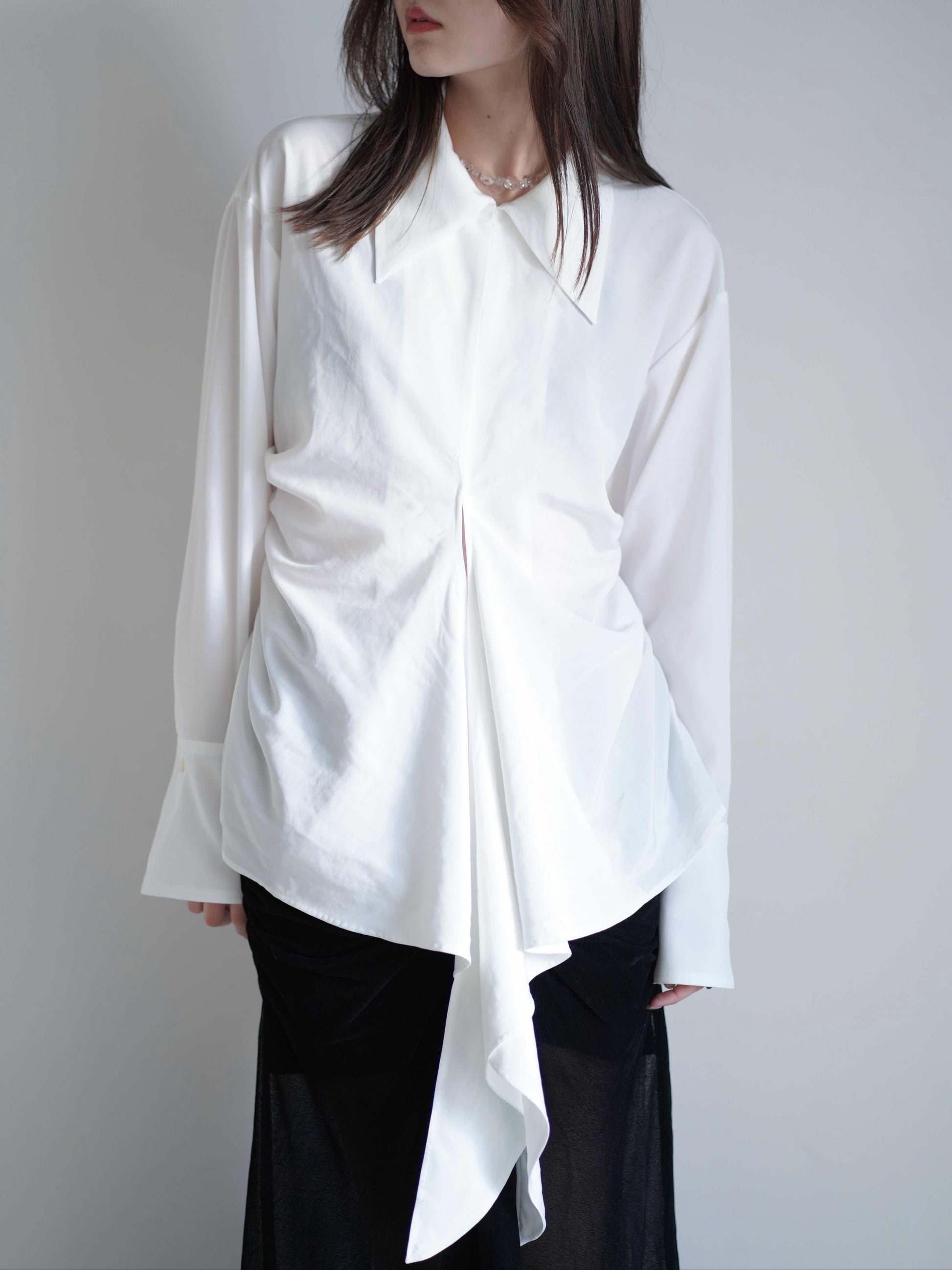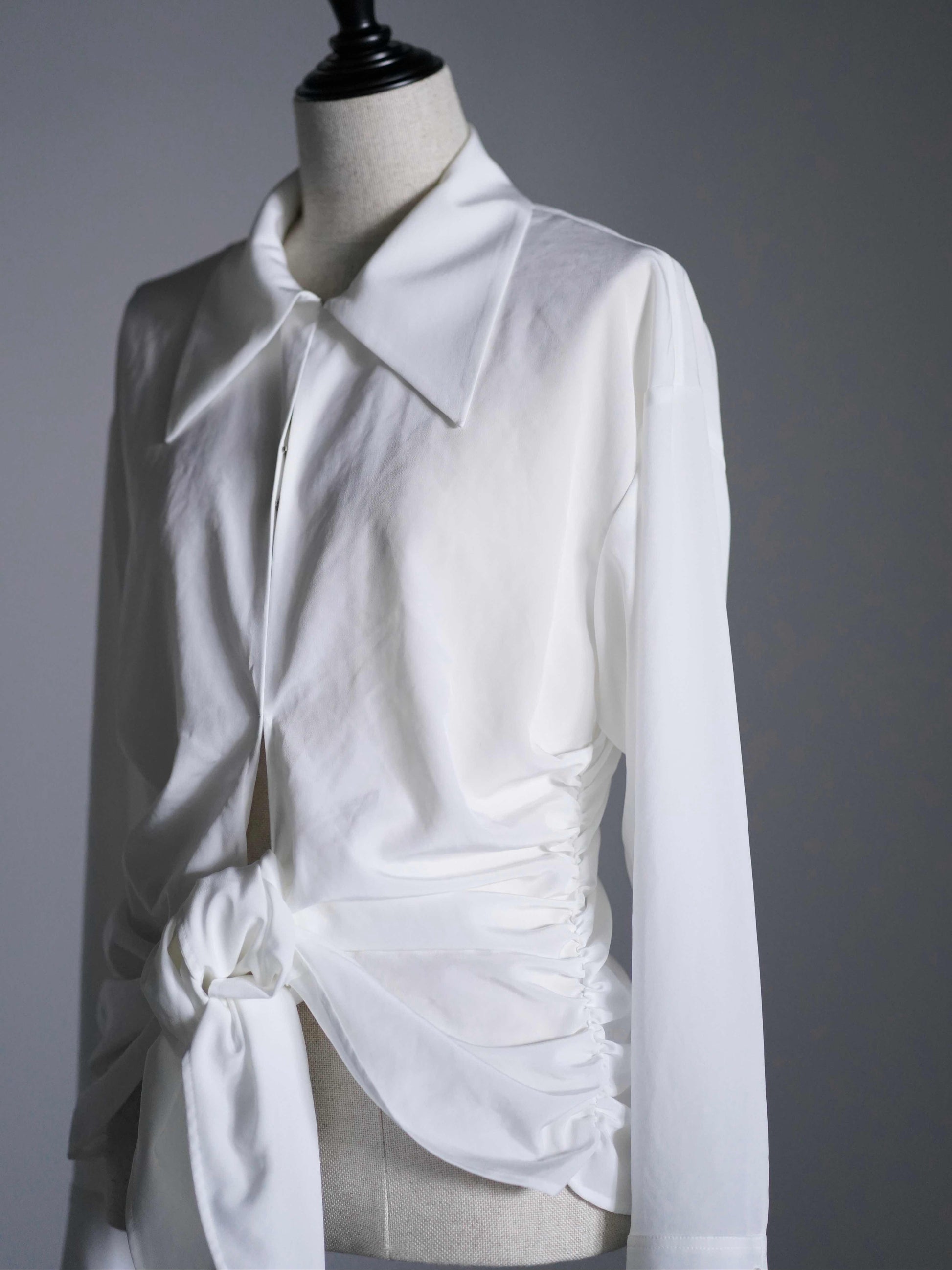 シルクのようなふくらみと風合いを持たせた素材のシャツブラウス。