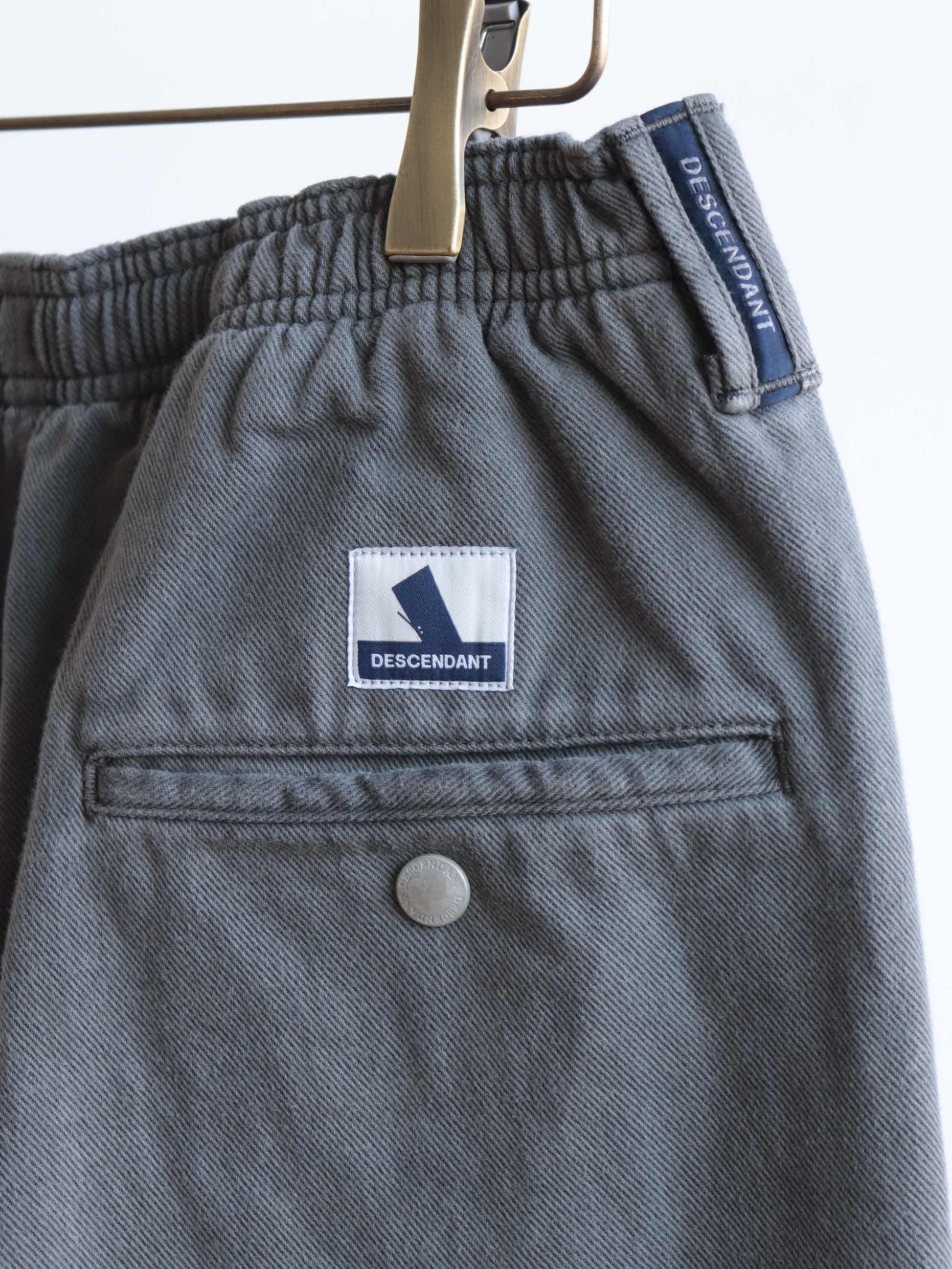 ゴム入りのウエストにスピンドルを通し、DESCENDANTのロゴ入りベルトループ付き。