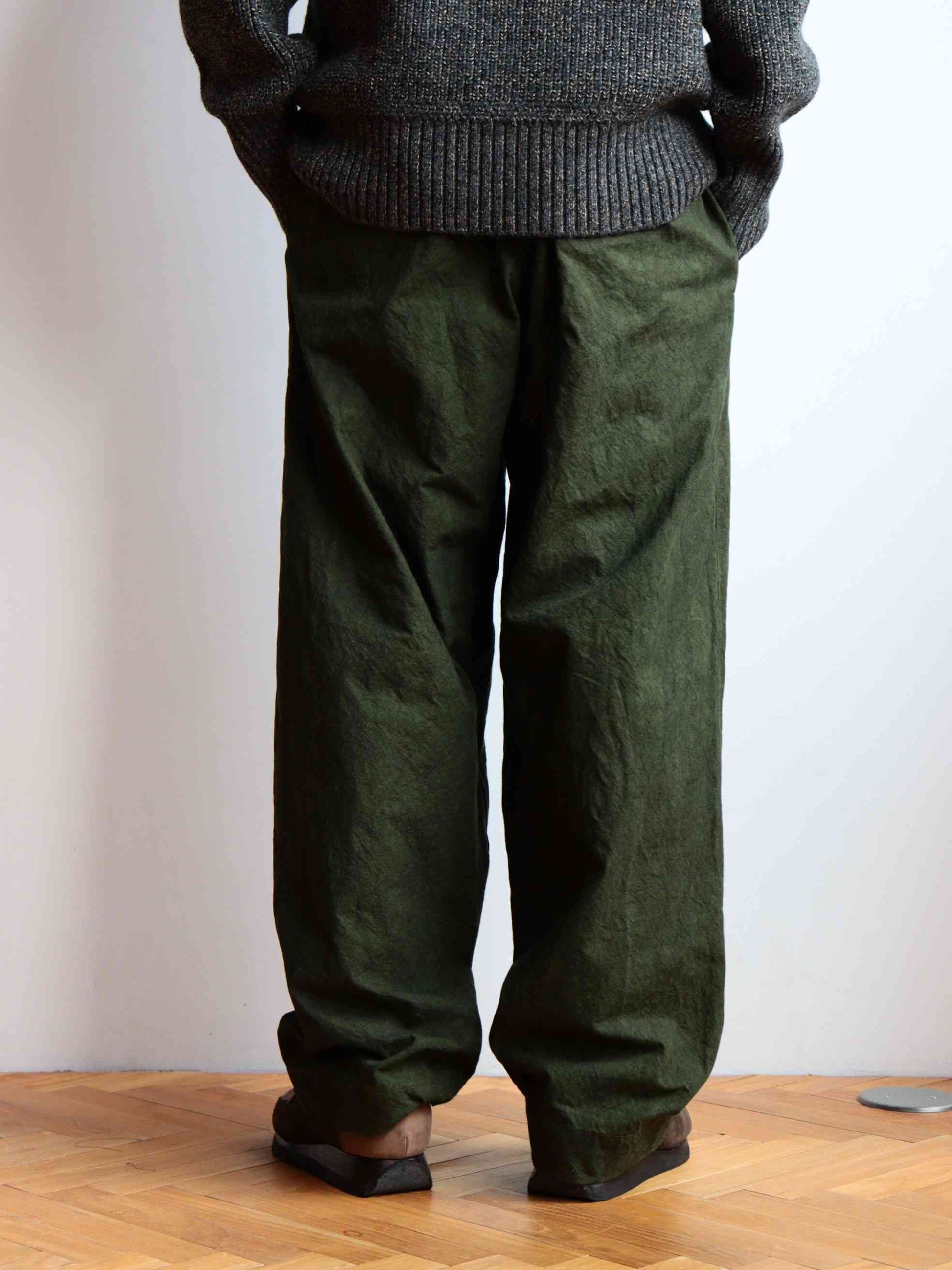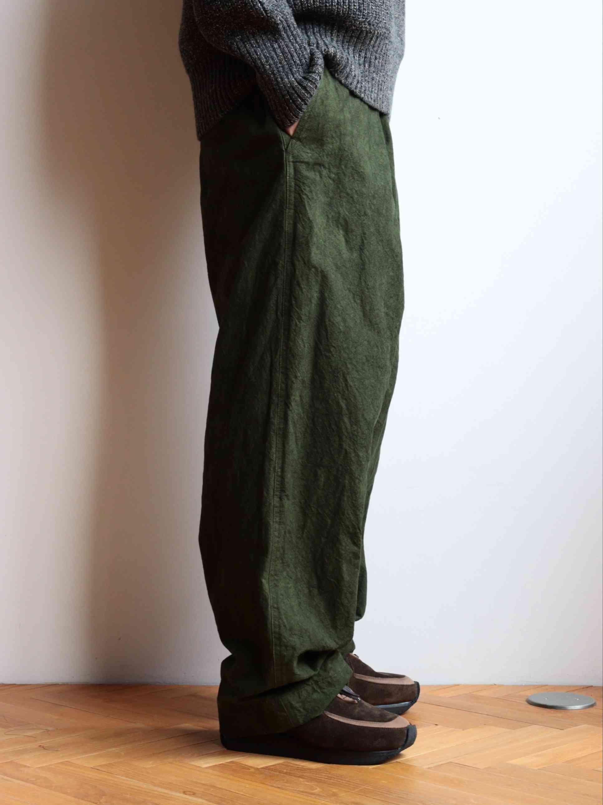 強撚コットンに硫化染めバイオ加⼯を施した⽣地を使⽤したリサイズダックトラウザー。