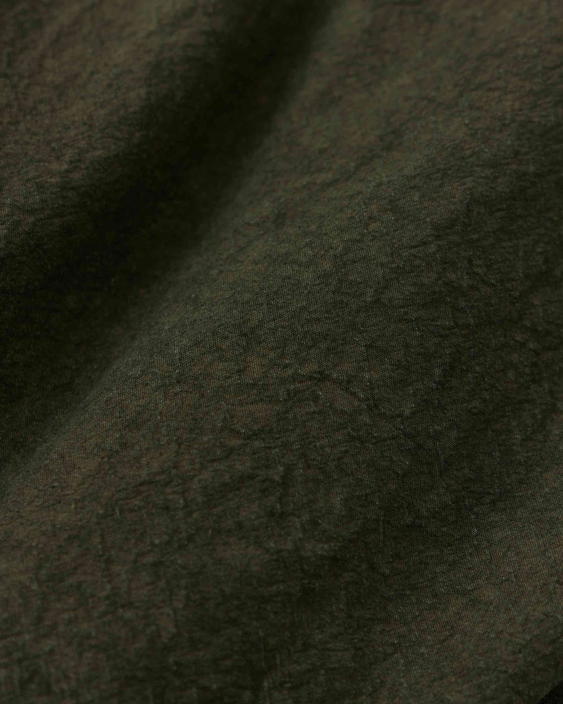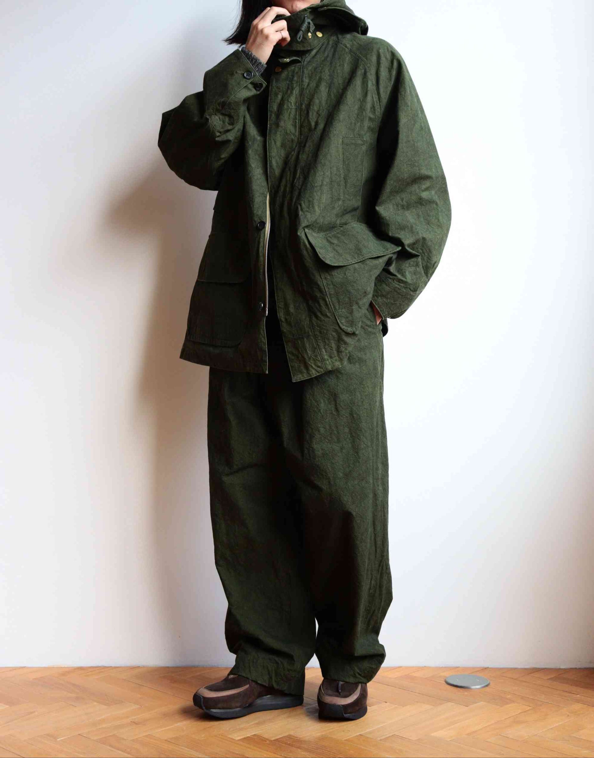 ⽣地は1930年代頃のUSA製ファイヤーマンキャンバス⽣地を⽬指し、特殊な加⼯によりヴィンテージ感ある⾊合い・表情に仕上げています。裏⽣地には杢⽷で織り上げたコットンネルを使⽤し、100%コットンにこだわったアイテムです。