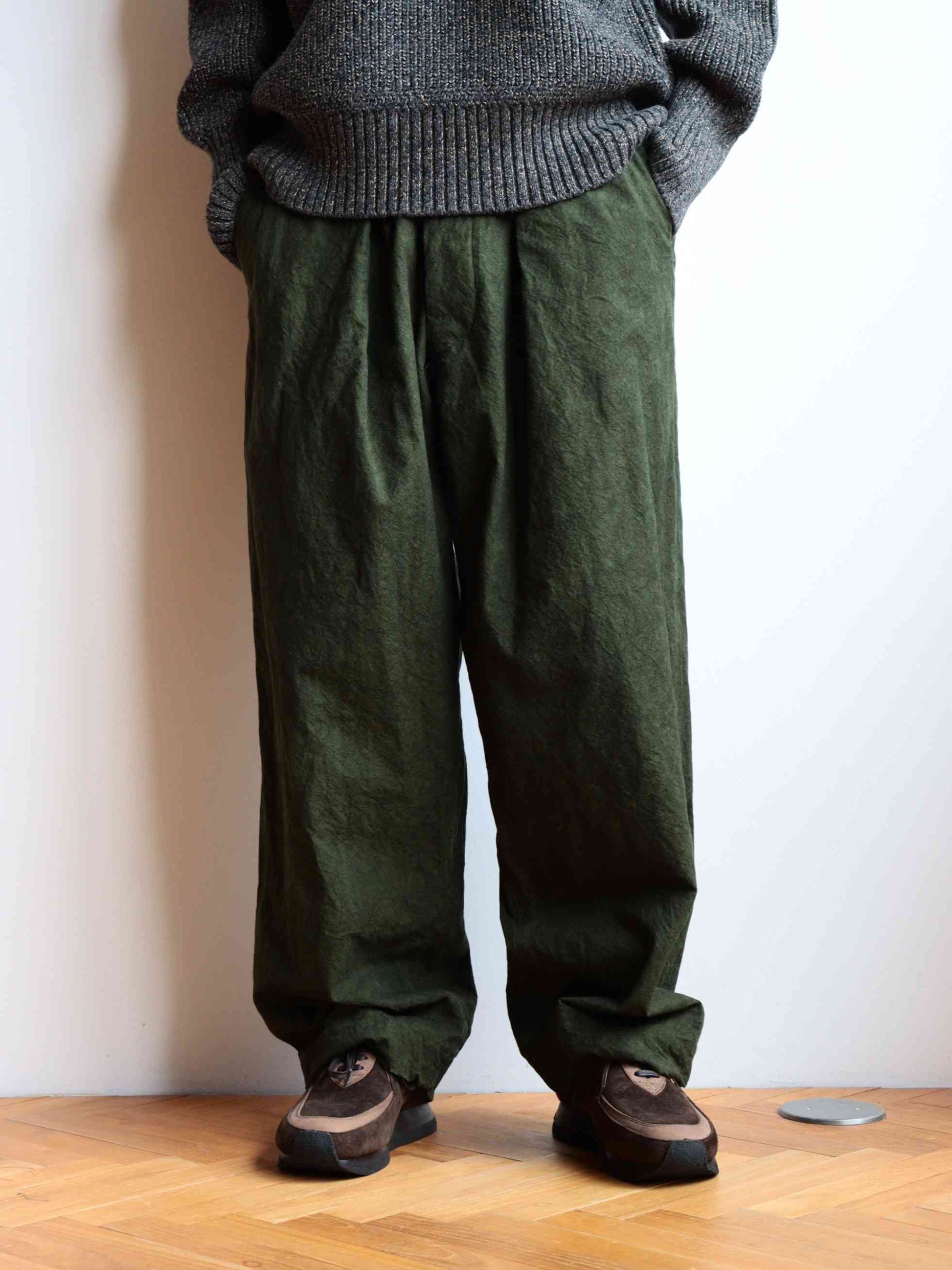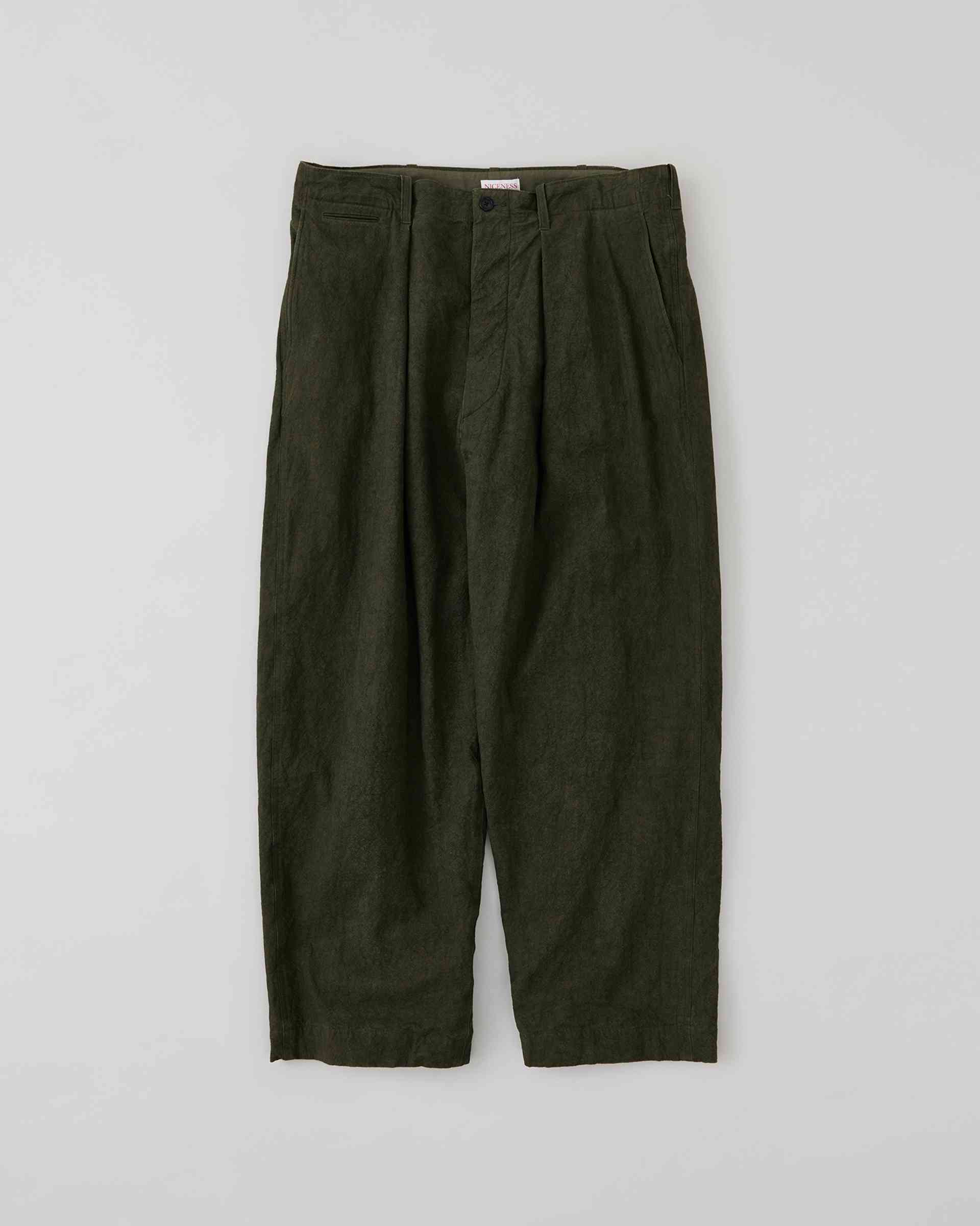 1940年代のミリタリーチノをリファレンスとし、オーバーインチをウエストで畳んでタックを作る仕様などを取り⼊れ再構築したデザイン。