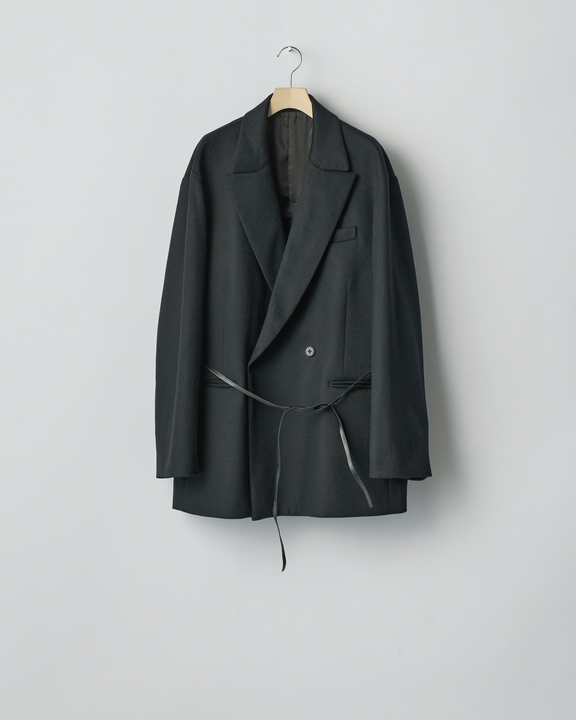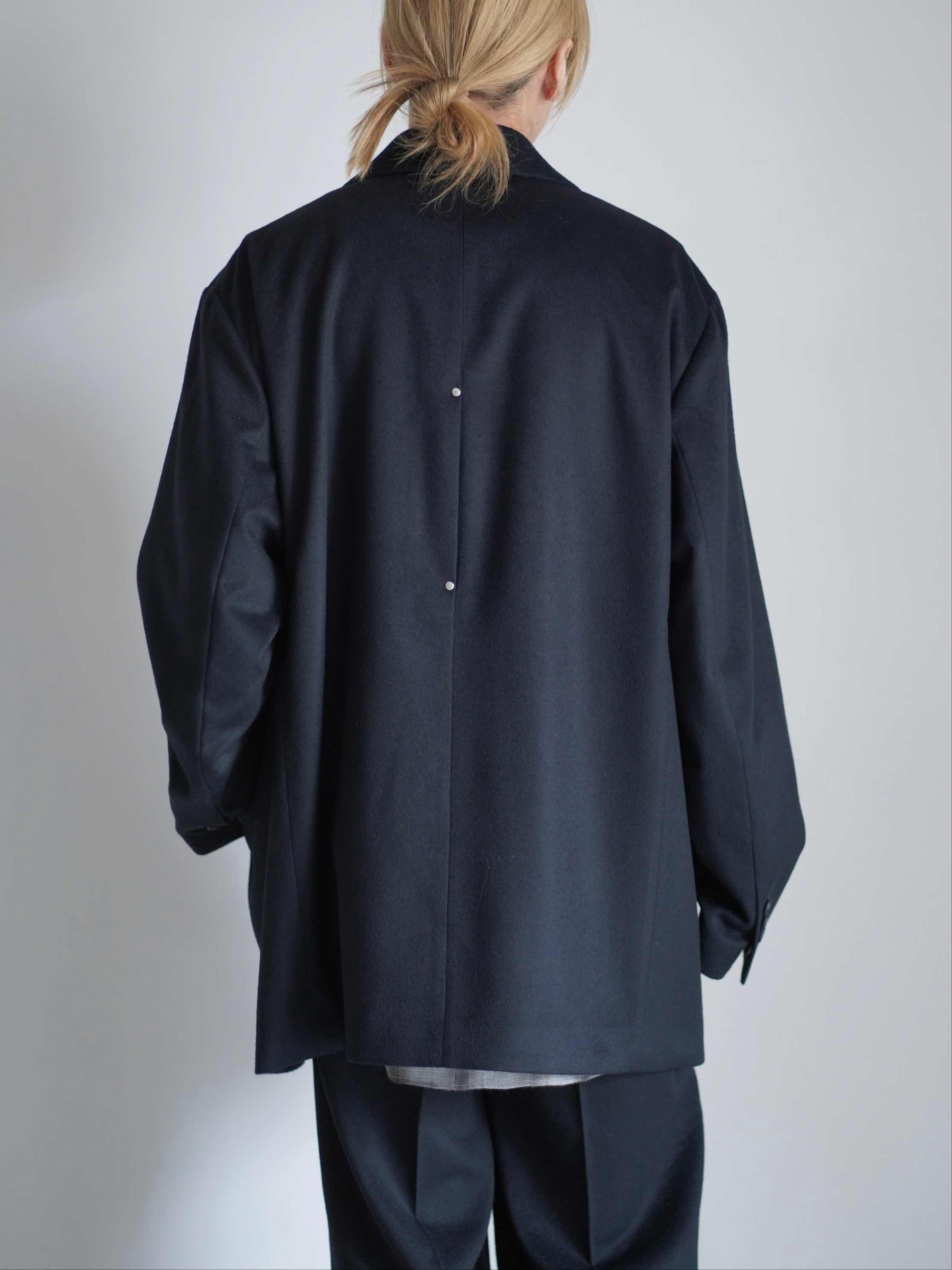 しなやかで膨らみのあるやわらかい風合い、微光沢のある美しい生地の表情が特徴のウールカシミヤビーバーを使用したピークラペルジャケット。